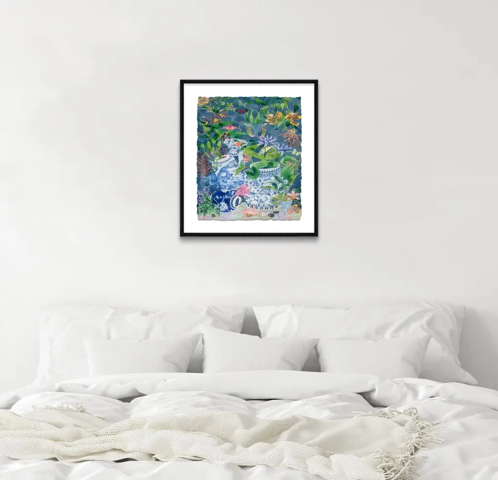 Seen first at One Kings Lane: This work from Gabby Malpas brings any wall to life with its vibrant florals and detailed porcelain vessels. Printed on high-quality paper with deckled edges, floated over a mat, and displayed in a simple wood frame, this piece arrives ready to hang.Gabby Malpas creates joyful, intricate watercolor works. Locally grown flowers and fruits picked nearby are rendered with tender warmth, often borrowing from the delicate aesthetics of Chinese ceramics and Southeast Asian batik fabrics. She works on high-quality art paper which she sometimes stitches together to add texture. Gabby trained as a ceramicist in New Zealand and has lived for many years in the UK. She now resides in Sydney, Australia.