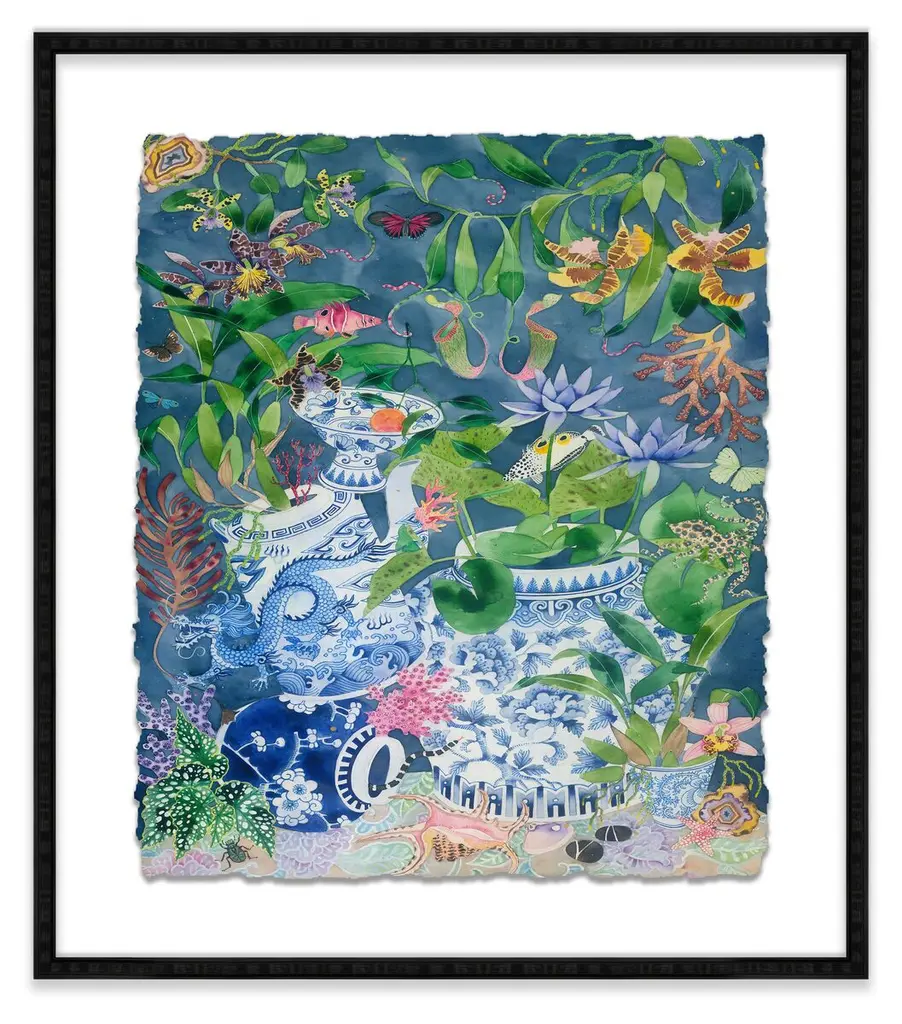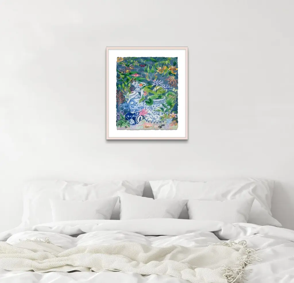 Seen first at One Kings Lane: This work from Gabby Malpas brings any wall to life with its vibrant florals and detailed porcelain vessels. Printed on high-quality paper with deckled edges, floated over a mat, and displayed in a simple wood frame, this piece arrives ready to hang.Gabby Malpas creates joyful, intricate watercolor works. Locally grown flowers and fruits picked nearby are rendered with tender warmth, often borrowing from the delicate aesthetics of Chinese ceramics and Southeast Asian batik fabrics. She works on high-quality art paper which she sometimes stitches together to add texture. Gabby trained as a ceramicist in New Zealand and has lived for many years in the UK. She now resides in Sydney, Australia.