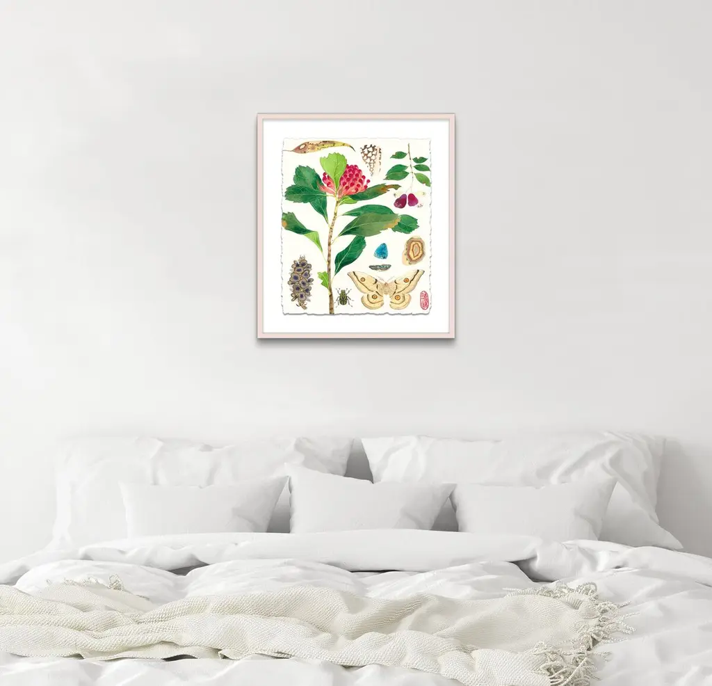 Seen first at One Kings Lane: This botanical work from Gabby Malpas brings any wall to life with its vibrant composition and impressive detail. Printed on watercolor paper with deckled edges, floated over a mat, and displayed in a simple pine frame, this piece arrives ready to hang.Gabby Malpas creates joyful, intricate watercolor works. Locally grown flowers and fruits picked nearby are rendered with tender warmth, often borrowing from the delicate aesthetics of Chinese ceramics and Southeast Asian batik fabrics. She works on high-quality art paper which she sometimes stitches together to add texture. Gabby trained as a ceramicist in New Zealand and has lived for many years in the UK. She now resides in Sydney, Australia.