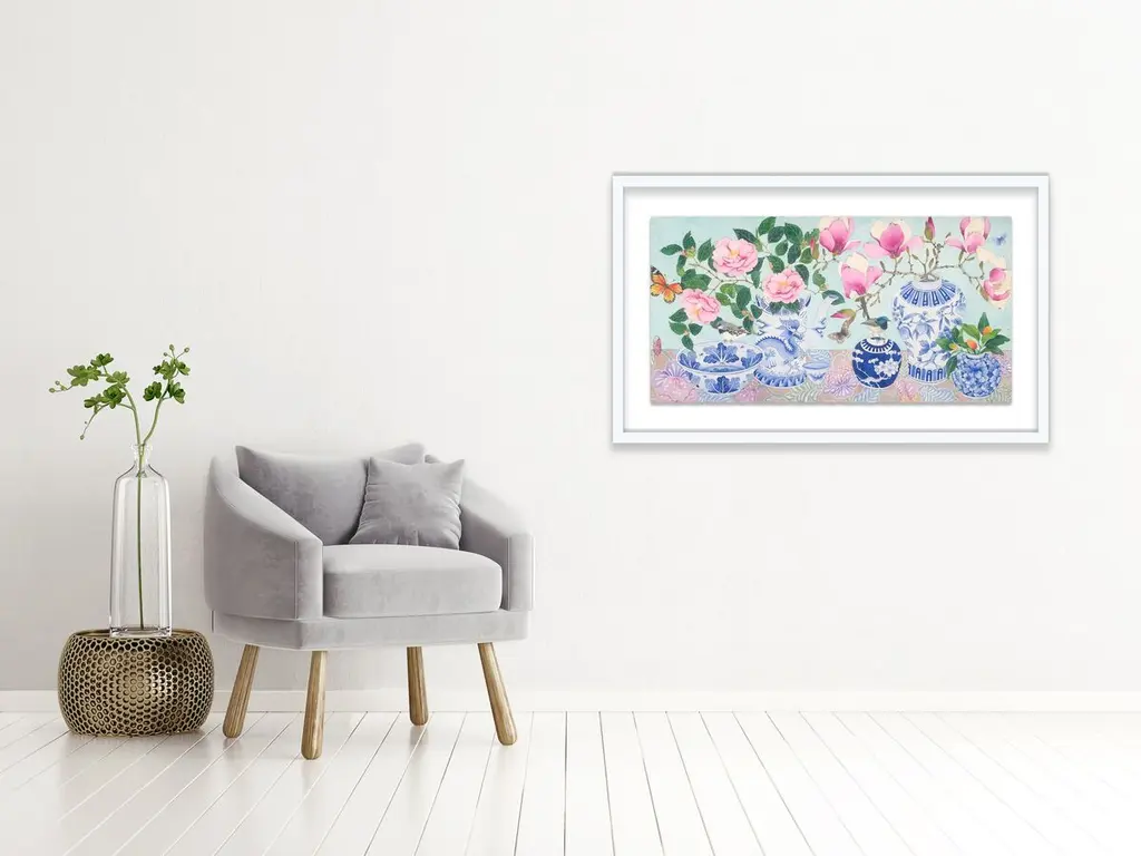 Seen first at One Kings Lane: This work from Gabby Malpas brings any wall to life with its vibrant florals and detailed porcelain vessels. Printed on high-quality paper with deckled edges, floated over a mat, and displayed in a simple wood frame, this piece arrives ready to hang.Gabby Malpas creates joyful, intricate watercolor works. Locally grown flowers and fruits picked nearby are rendered with tender warmth, often borrowing from the delicate aesthetics of Chinese ceramics and Southeast Asian batik fabrics. She works on high-quality art paper which she sometimes stitches together to add texture. Gabby trained as a ceramicist in New Zealand and has lived for many years in the UK. She now resides in Sydney, Australia.