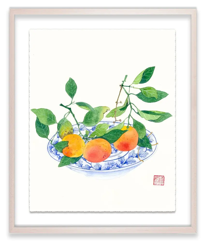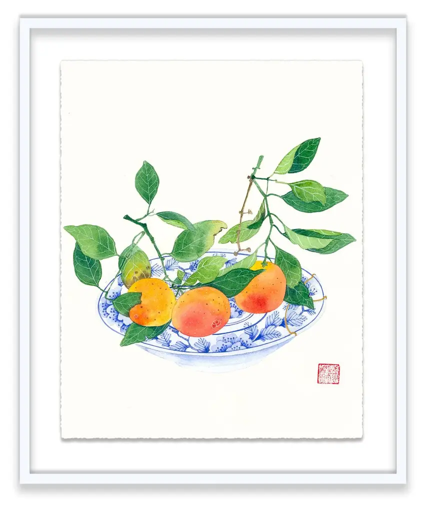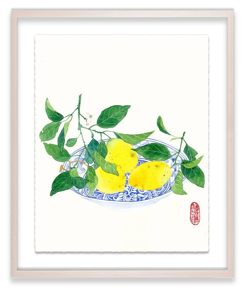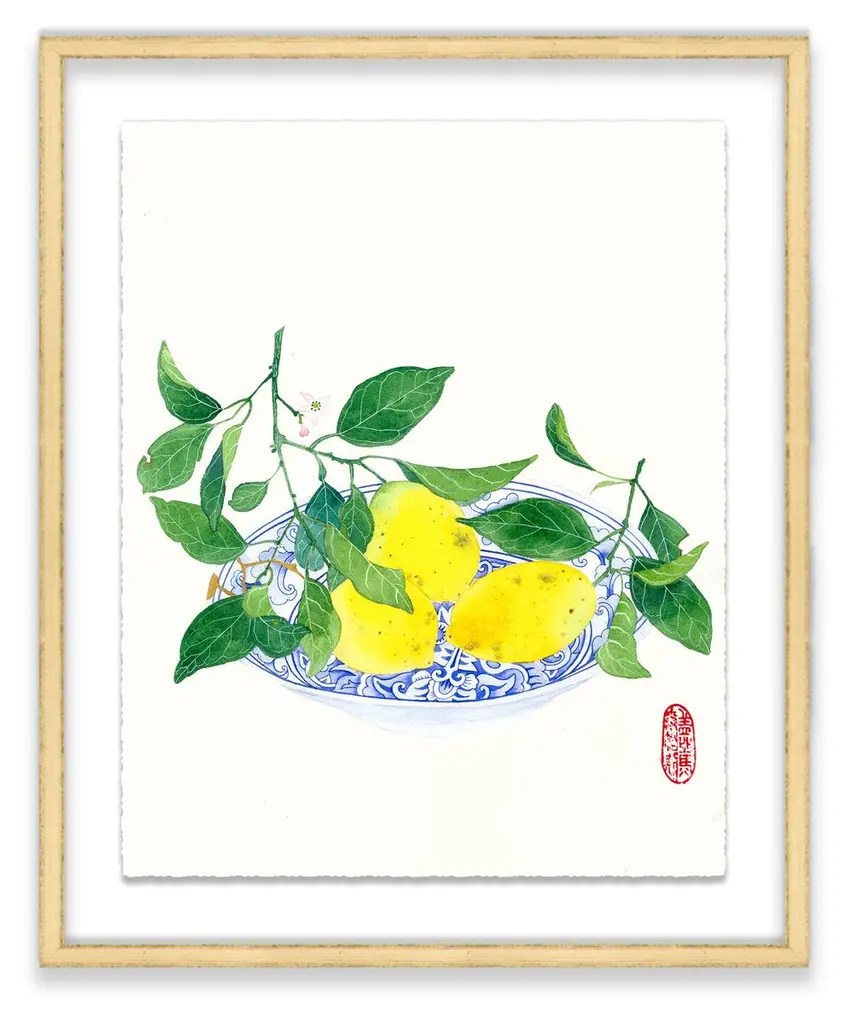 Seen first at One Kings Lane: This still life from Gabby Malpas brings any wall to life with a bowl of ripe lemons that pops in vivid color against a neutral background. Printed on high-quality paper with deckled edges, floated over a mat, and displayed in a simple wood frame, this piece arrives ready to hang.Gabby Malpas creates joyful, intricate watercolor works. Locally grown flowers and fruits picked nearby are rendered with tender warmth, often borrowing from the delicate aesthetics of Chinese ceramics and Southeast Asian batik fabrics. She works on high-quality art paper which she sometimes stitches together to add texture. Gabby trained as a ceramicist in New Zealand and has lived for many years in the UK. She now resides in Sydney, Australia.