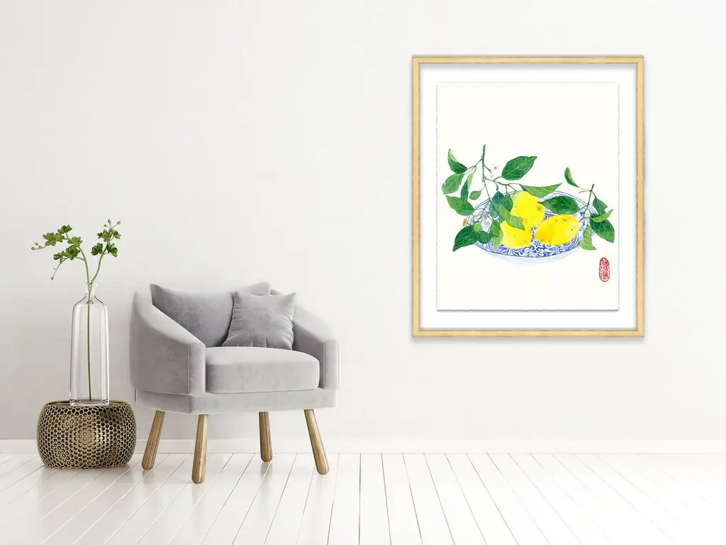Seen first at One Kings Lane: This still life from Gabby Malpas brings any wall to life with a bowl of ripe lemons that pops in vivid color against a neutral background. Printed on high-quality paper with deckled edges, floated over a mat, and displayed in a simple wood frame, this piece arrives ready to hang.Gabby Malpas creates joyful, intricate watercolor works. Locally grown flowers and fruits picked nearby are rendered with tender warmth, often borrowing from the delicate aesthetics of Chinese ceramics and Southeast Asian batik fabrics. She works on high-quality art paper which she sometimes stitches together to add texture. Gabby trained as a ceramicist in New Zealand and has lived for many years in the UK. She now resides in Sydney, Australia.