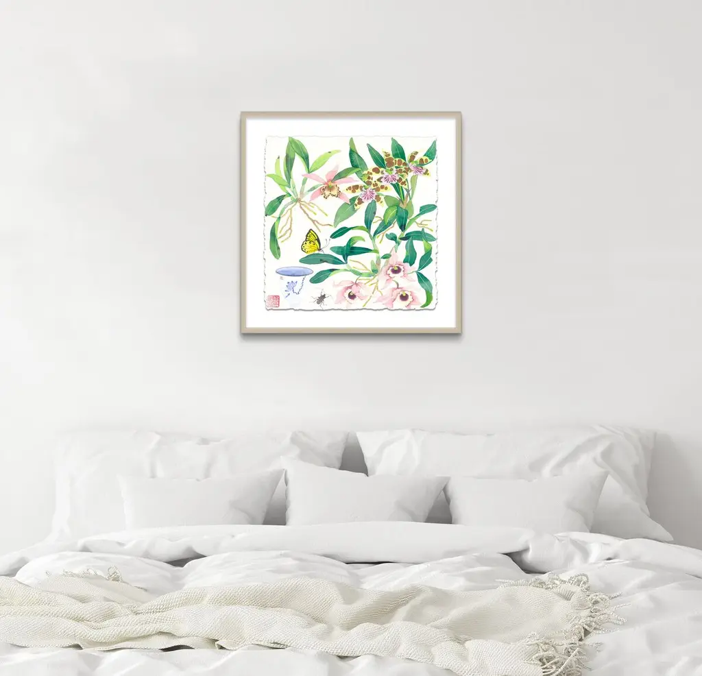 Seen first at One Kings Lane: This floral work from Gabby Malpas brings any wall to life with its vibrant composition and impressive detail. Printed on watercolor paper with deckled edges, floated over a mat, and displayed in a simple pine frame, this piece arrives ready to hang.Gabby Malpas creates joyful, intricate watercolor works. Locally grown flowers and fruits picked nearby are rendered with tender warmth, often borrowing from the delicate aesthetics of Chinese ceramics and Southeast Asian batik fabrics. She works on high-quality art paper which she sometimes stitches together to add texture. Gabby trained as a ceramicist in New Zealand and has lived for many years in the UK. She now resides in Sydney, Australia.