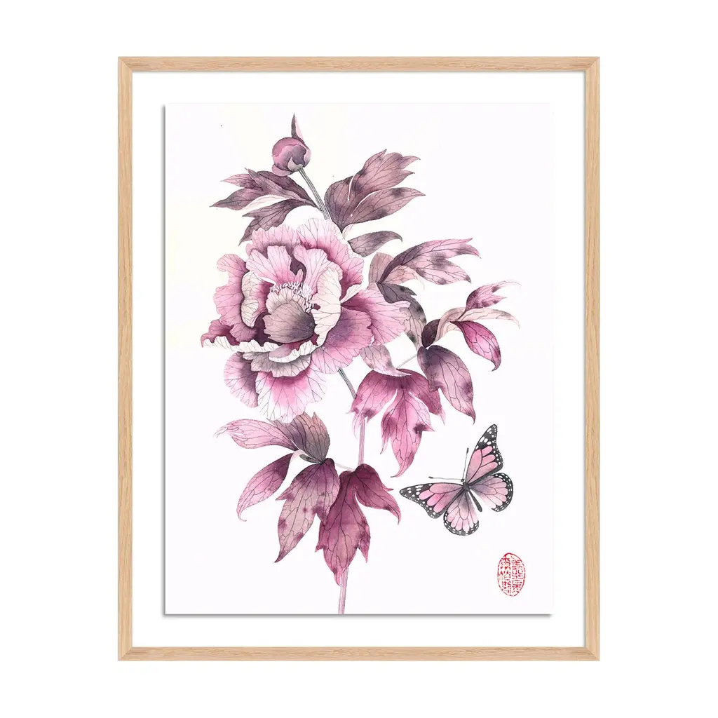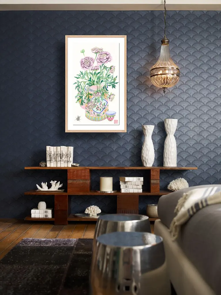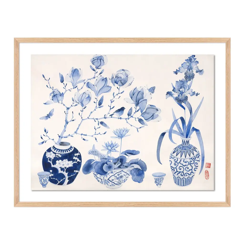 This work from Gabby Malpas brings any wall to life with its vibrant florals and detailed porcelain vessels. Printed on high-quality paper with deckled edges, floated over a mat, and displayed in a simple wood frame, this piece arrives ready to hang. Gabby Malpas creates joyful, intricate watercolor works. Locally grown flowers and fruits picked nearby are rendered with tender warmth, often borrowing from the delicate aesthetics of Chinese ceramics and Southeast Asian batik fabrics. She works on high-quality art paper which she sometimes stitches together to add texture. Gabby trained as a ceramicist in New Zealand and has lived for many years in the UK. She now resides in Sydney, Australia.