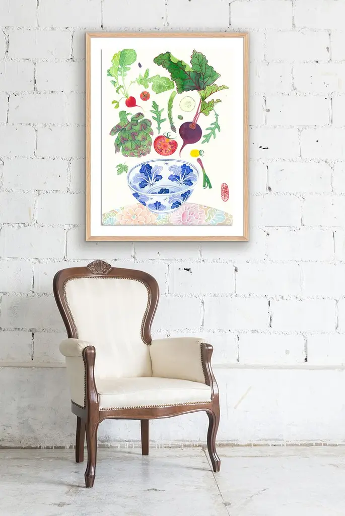 This work from Gabby Malpas brings any wall to life with its vibrant florals and detailed porcelain vessels. Printed on high-quality paper with deckled edges, floated over a mat, and displayed in a simple wood frame, this piece arrives ready to hang. Gabby Malpas creates joyful, intricate watercolor works. Locally grown flowers and fruits picked nearby are rendered with tender warmth, often borrowing from the delicate aesthetics of Chinese ceramics and Southeast Asian batik fabrics. She works on high-quality art paper which she sometimes stitches together to add texture. Gabby trained as a ceramicist in New Zealand and has lived for many years in the UK. She now resides in Sydney, Australia.
