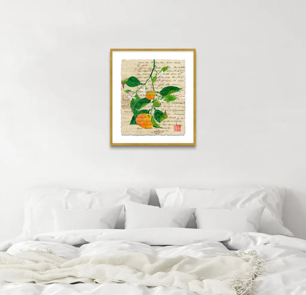 Seen first at One Kings Lane: This work from Gabby Malpas brings any wall to life with a cluster of ripe oranges beautifully juxtaposed against a hand-written French document. Printed on high-quality paper with deckled edges, floated over a mat, and displayed in a simple wood frame, this piece arrives ready to hang.Gabby Malpas creates joyful, intricate watercolor works. Locally grown flowers and fruits picked nearby are rendered with tender warmth, often borrowing from the delicate aesthetics of Chinese ceramics and Southeast Asian batik fabrics. She works on high-quality art paper which she sometimes stitches together to add texture. Gabby trained as a ceramicist in New Zealand and has lived for many years in the UK. She now resides in Sydney, Australia.