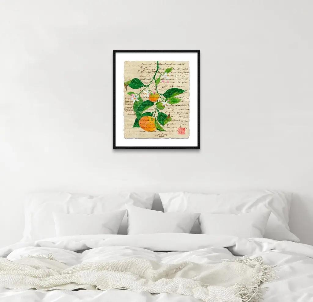 Seen first at One Kings Lane: This work from Gabby Malpas brings any wall to life with a cluster of ripe oranges beautifully juxtaposed against a hand-written French document. Printed on high-quality paper with deckled edges, floated over a mat, and displayed in a simple wood frame, this piece arrives ready to hang.Gabby Malpas creates joyful, intricate watercolor works. Locally grown flowers and fruits picked nearby are rendered with tender warmth, often borrowing from the delicate aesthetics of Chinese ceramics and Southeast Asian batik fabrics. She works on high-quality art paper which she sometimes stitches together to add texture. Gabby trained as a ceramicist in New Zealand and has lived for many years in the UK. She now resides in Sydney, Australia.