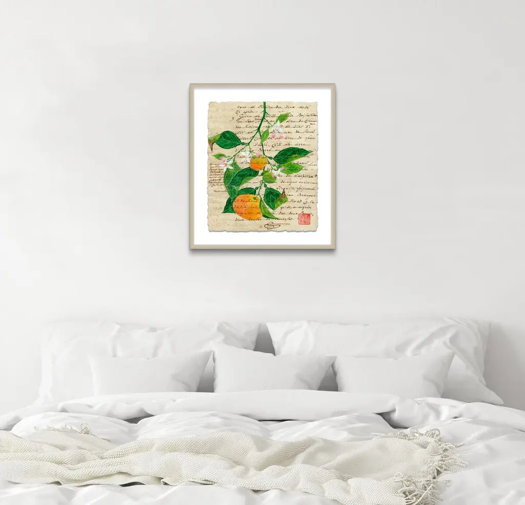 Seen first at One Kings Lane: This work from Gabby Malpas brings any wall to life with a cluster of ripe oranges beautifully juxtaposed against a hand-written French document. Printed on high-quality paper with deckled edges, floated over a mat, and displayed in a simple wood frame, this piece arrives ready to hang.Gabby Malpas creates joyful, intricate watercolor works. Locally grown flowers and fruits picked nearby are rendered with tender warmth, often borrowing from the delicate aesthetics of Chinese ceramics and Southeast Asian batik fabrics. She works on high-quality art paper which she sometimes stitches together to add texture. Gabby trained as a ceramicist in New Zealand and has lived for many years in the UK. She now resides in Sydney, Australia.