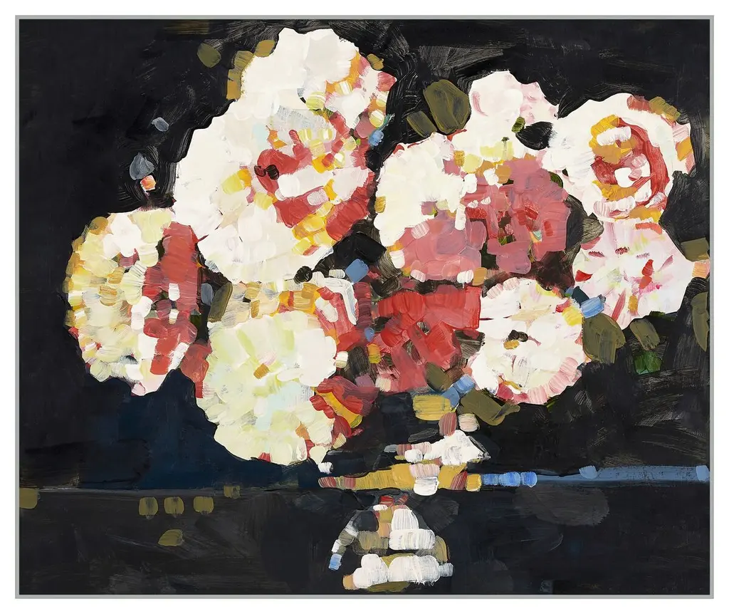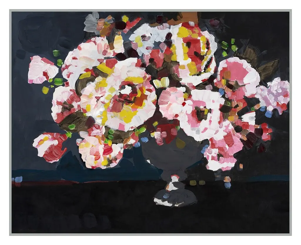 Seen first at One Kings Lane: This impressionistic floral still life from Gabriela Ibarra is rendered with bold brushstrokes in bright colors that pop in dramatic contrast against the dark background. Printed on gallery-wrapped canvas with an artist-enhanced paint finish for added texture and visual interest, this piece is displayed in a wood floater frame and arrives ready to hang.