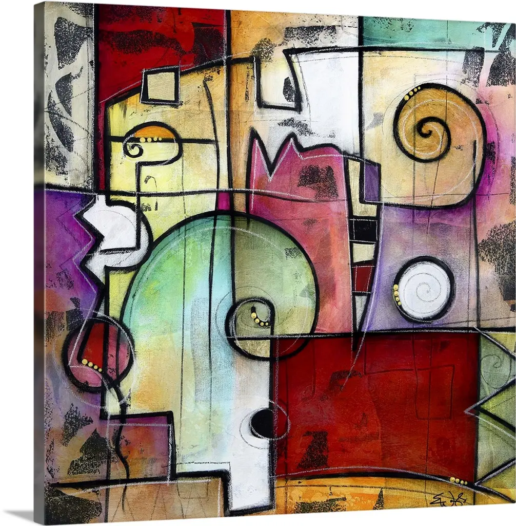 Contemporary abstract artwork of an organic shape outlined in black and divided into colorful sections.