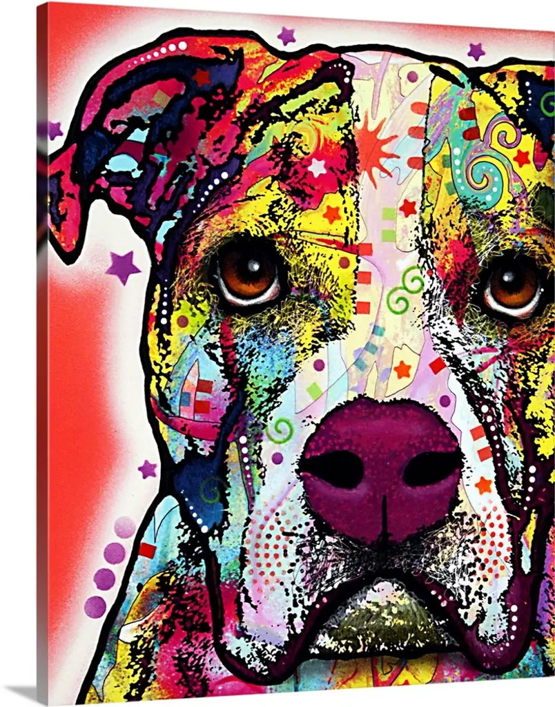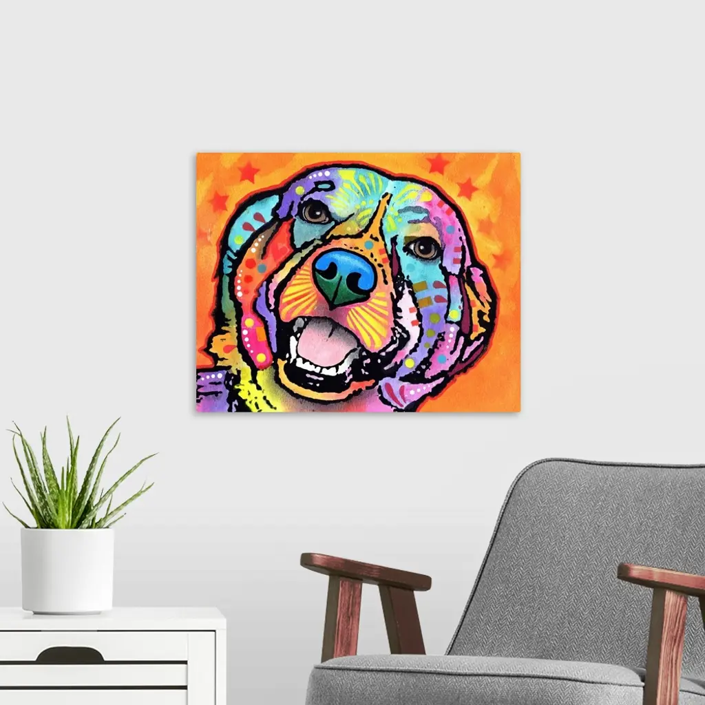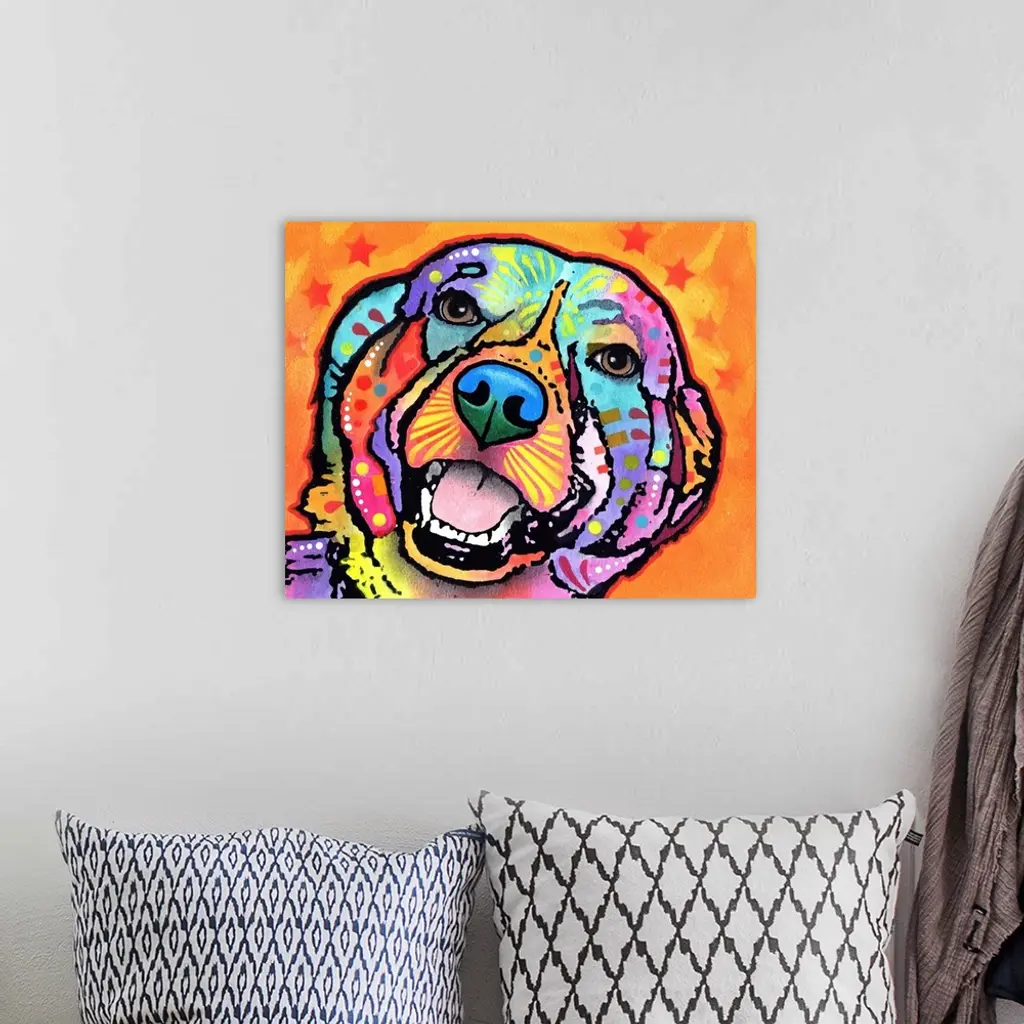 Colorful painting of a happy dog with abstract markings on an orange background with 7 red stars.
