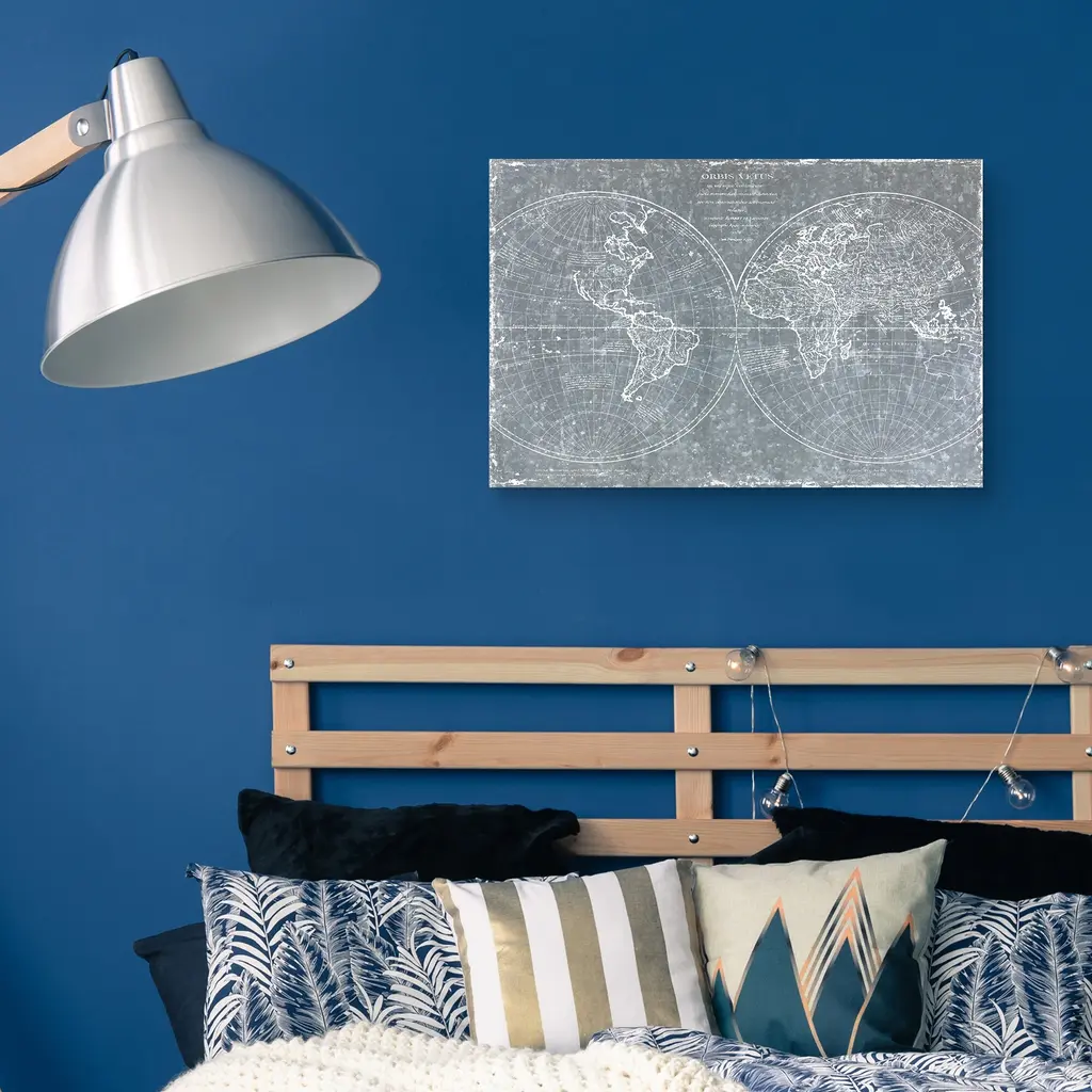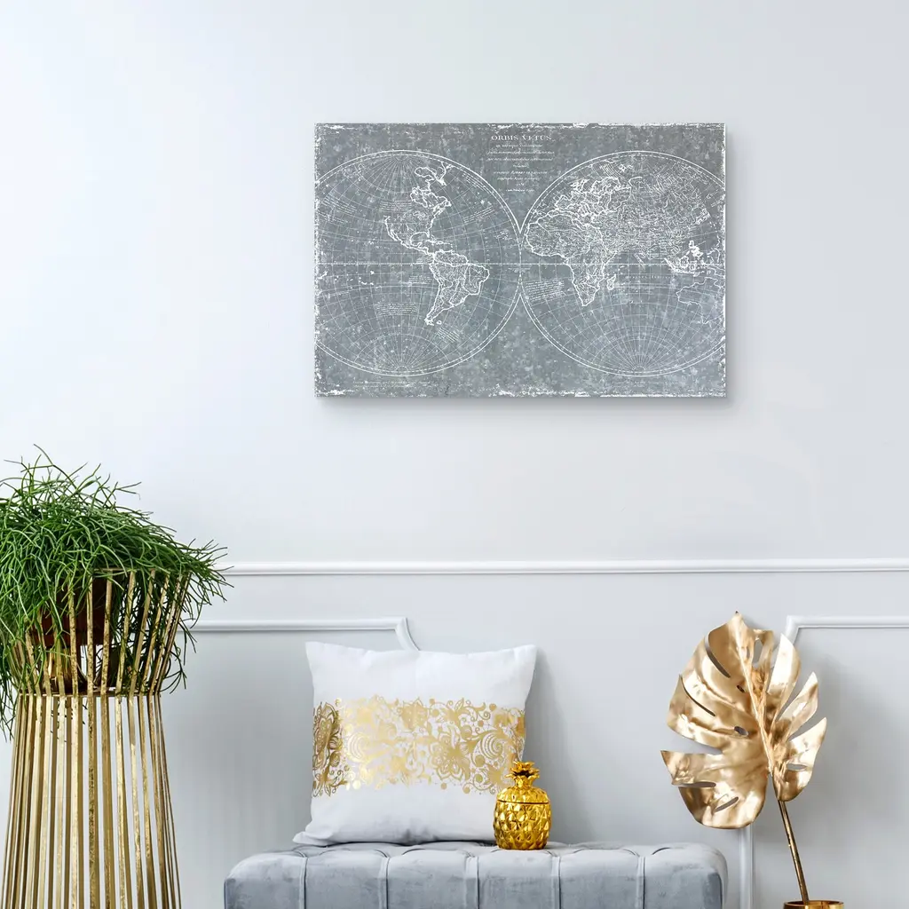 Galvanized World Map by CAD Designs Canvas Art Print is produced with printing that covers the entirety of the canvas for a sleek and stylish museum-quality look. Our framed prints are made by expert craftsmen who strive to make each canvas the masterpiece