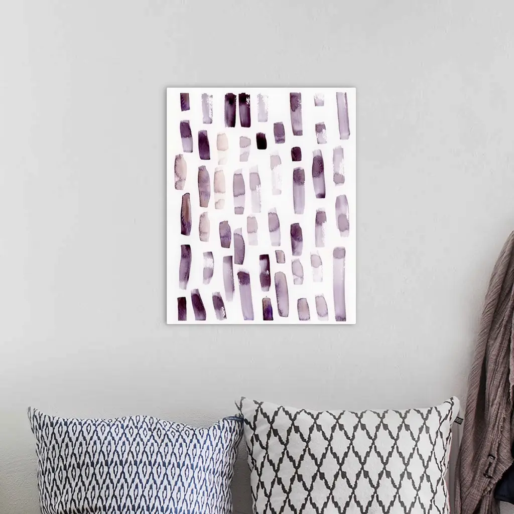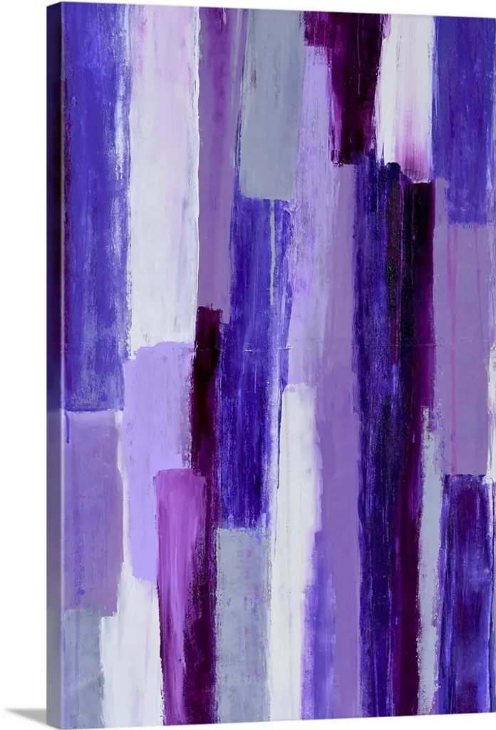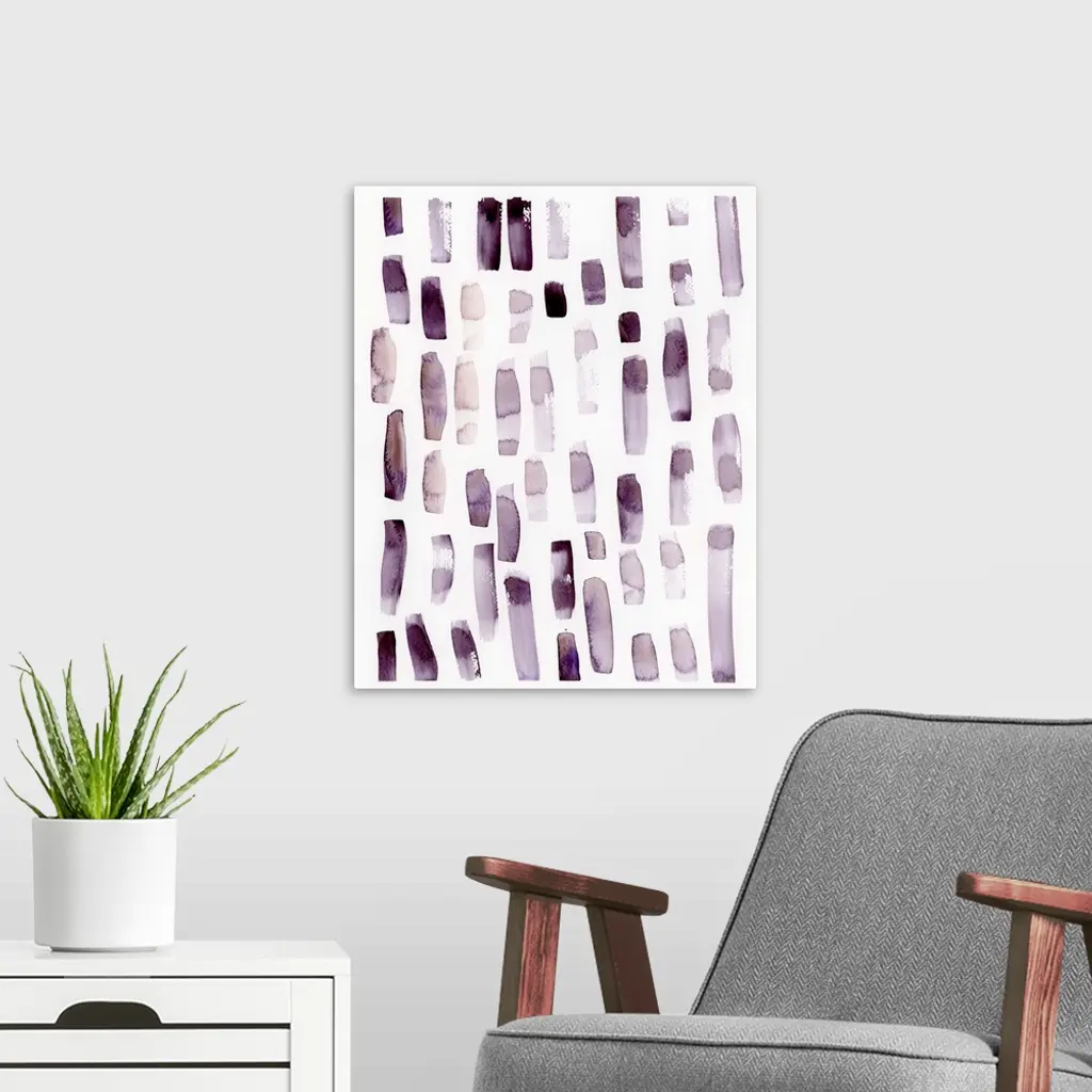 Contemporary abstract painting of multiple vertical streaks of diluted amethyst tones.