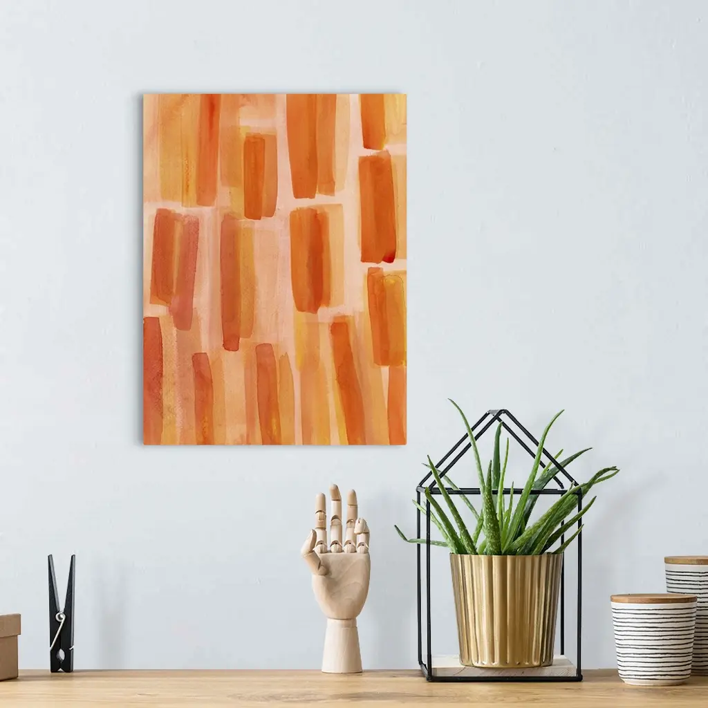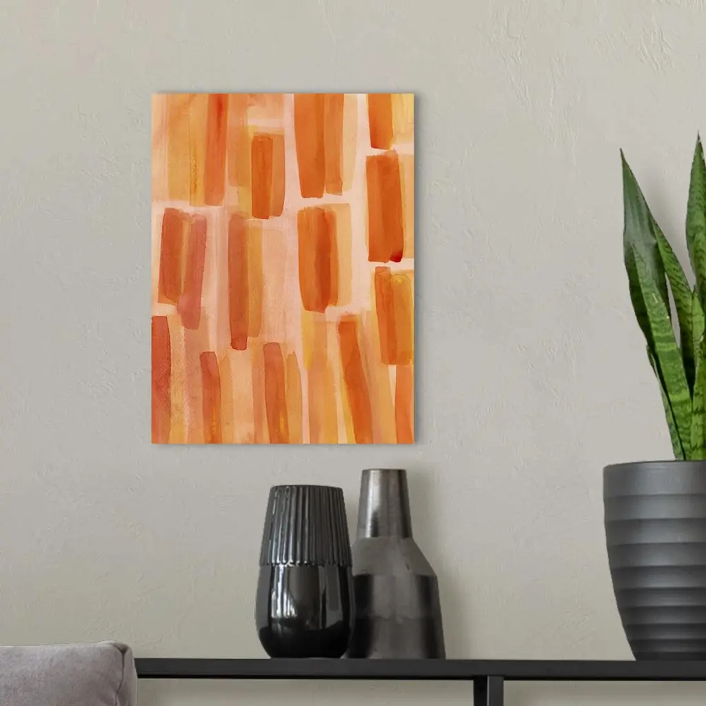 Contemporary abstract painting of vertical orange strokes of paint against a lighter orange background.