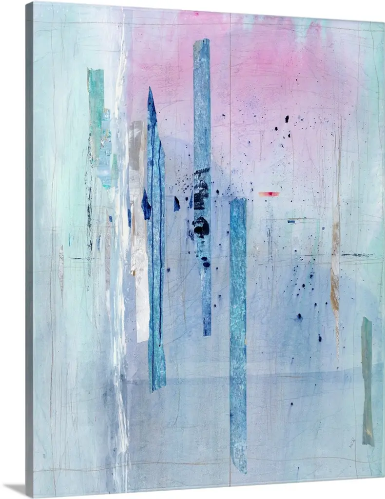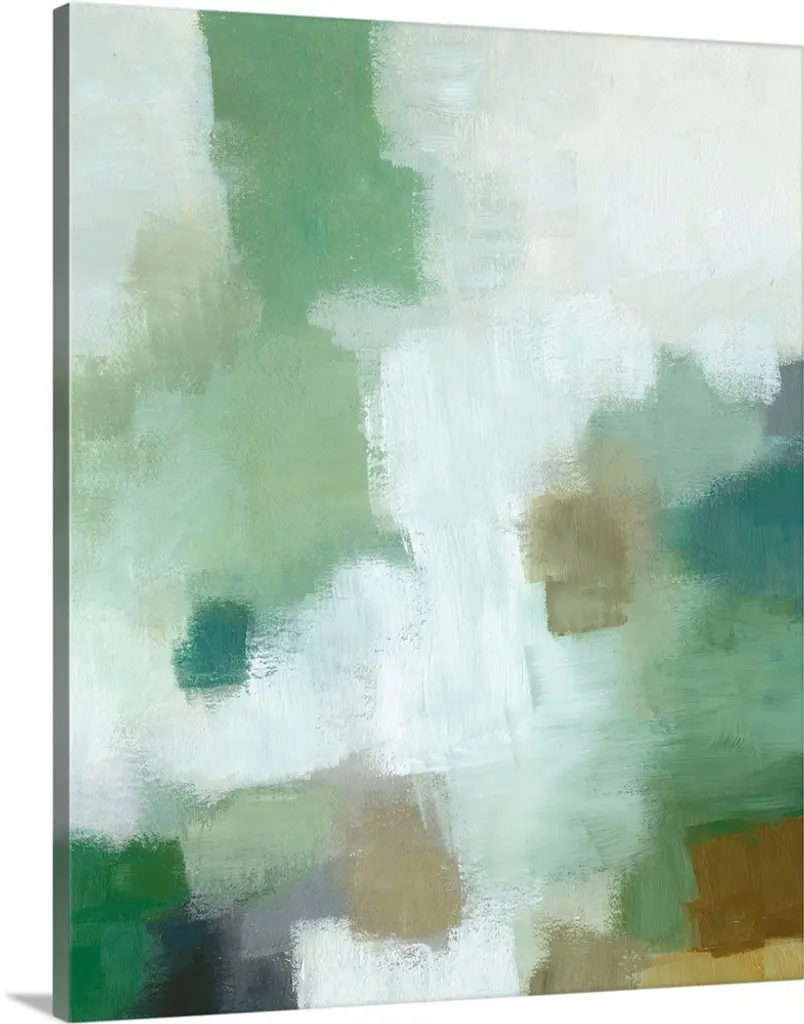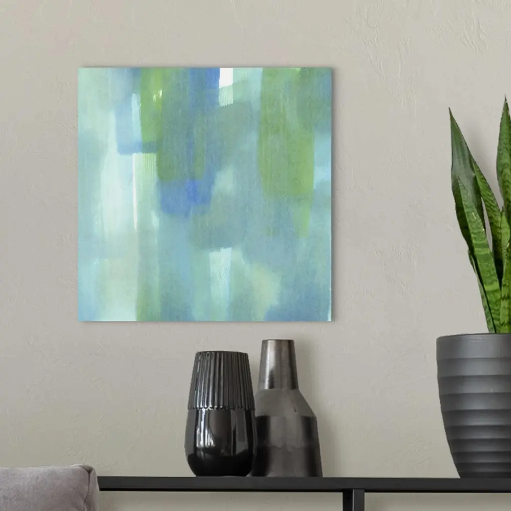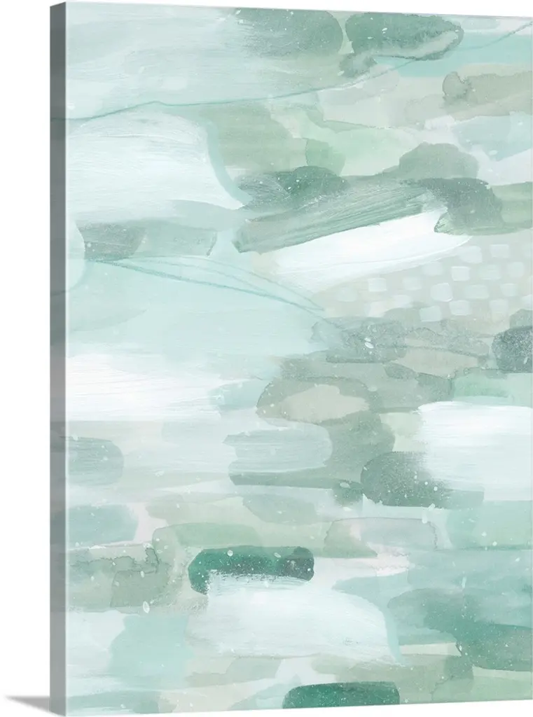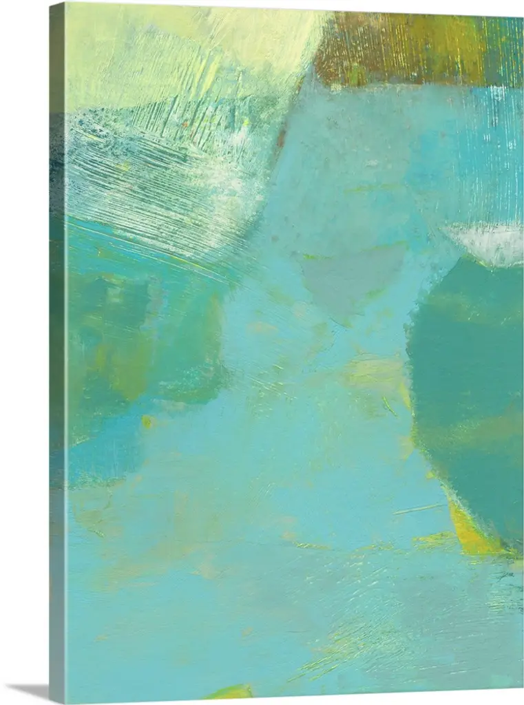 Contemporary abstract painting using vertical wide strokes of turquoise green.