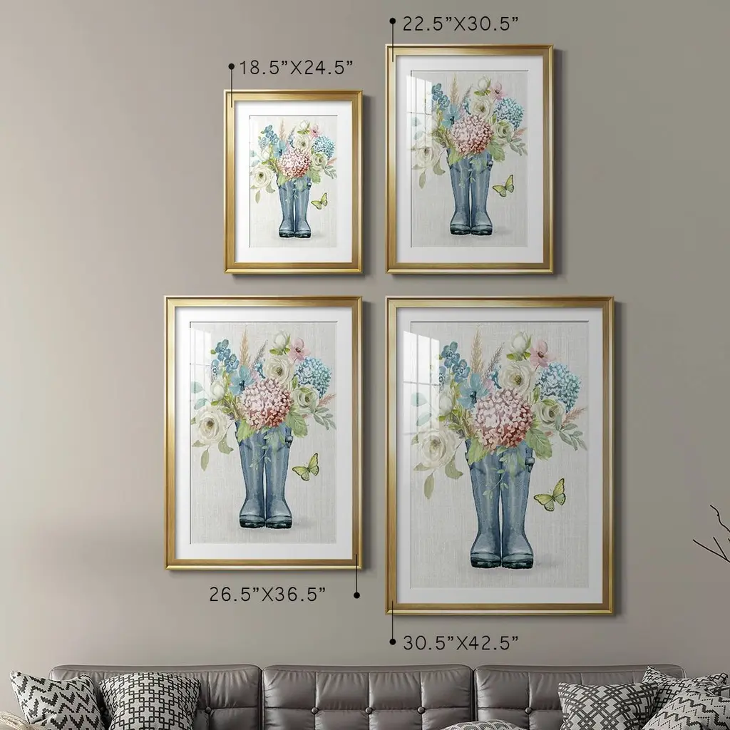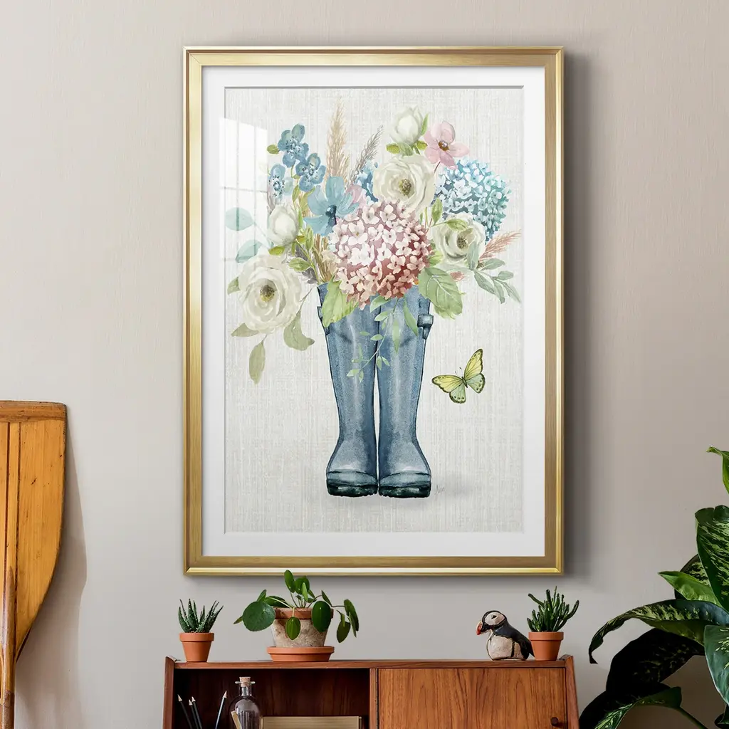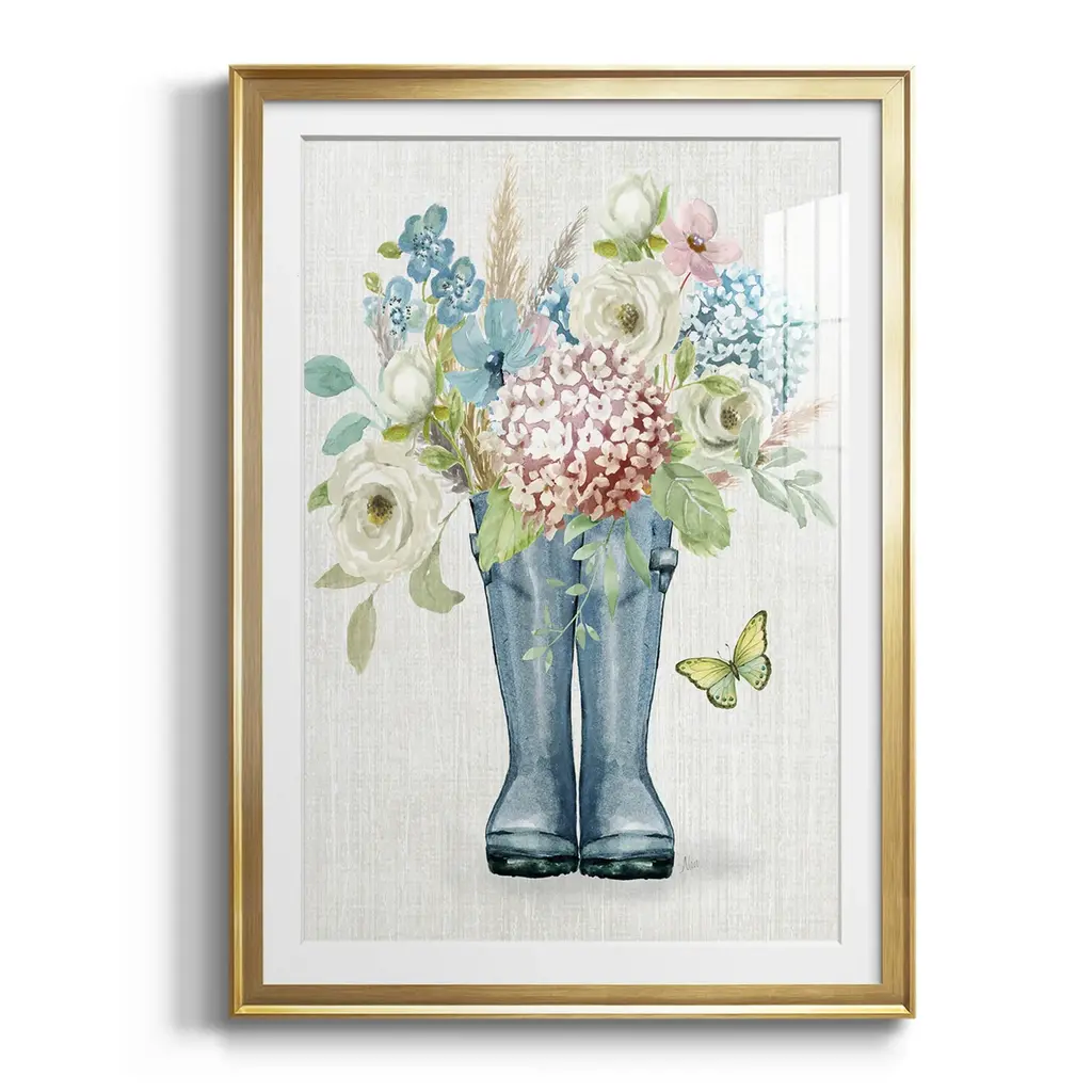 Garden Boots Premium Framed Print - Ready to Hang A Premium Framed Print created to last. Framed in distressed wood and available in an array of sizes and colors Featuring a beveled a solid wood stretcher bar, each piece comes ready to hand 4 SIZES AVAILABLE 30.5''X42.5'' - Overall Size 26.5'X36.5'' - Overall Size 22.5''x30.5'' - Overall Size 18.5''x24.5'' - Overall Size Each piece is made to order. Each piece comes with hanging hardware. Made in the USA Ready to Hang Giclee Paper Print Acrylic Glass Beveled Matt Board