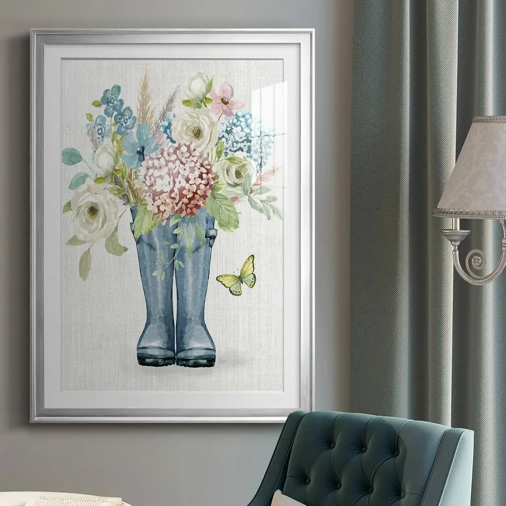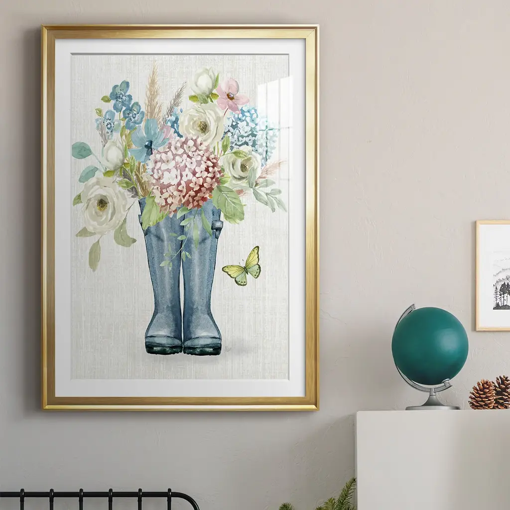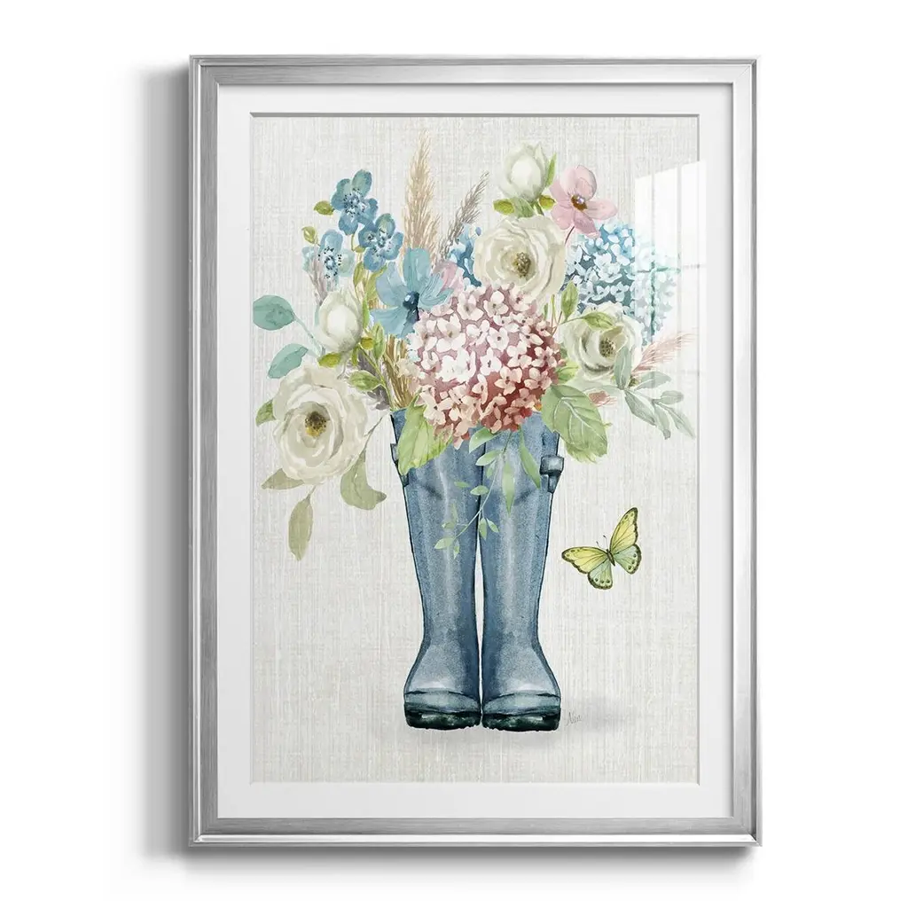 Garden Boots Premium Framed Print - Ready to Hang A Premium Framed Print created to last. Framed in distressed wood and available in an array of sizes and colors Featuring a beveled a solid wood stretcher bar, each piece comes ready to hand 4 SIZES AVAILABLE 30.5''X42.5'' - Overall Size 26.5'X36.5'' - Overall Size 22.5''x30.5'' - Overall Size 18.5''x24.5'' - Overall Size Each piece is made to order. Each piece comes with hanging hardware. Made in the USA Ready to Hang Giclee Paper Print Acrylic Glass Beveled Matt Board