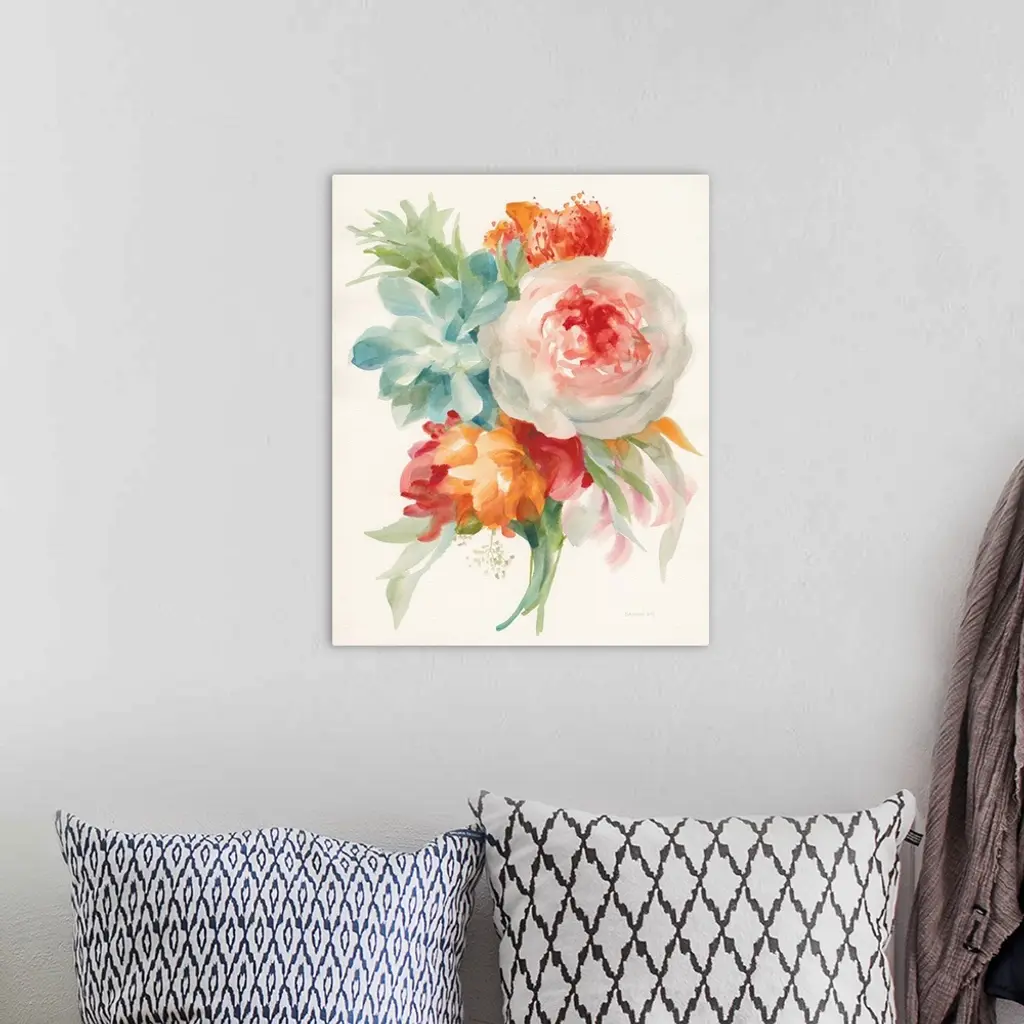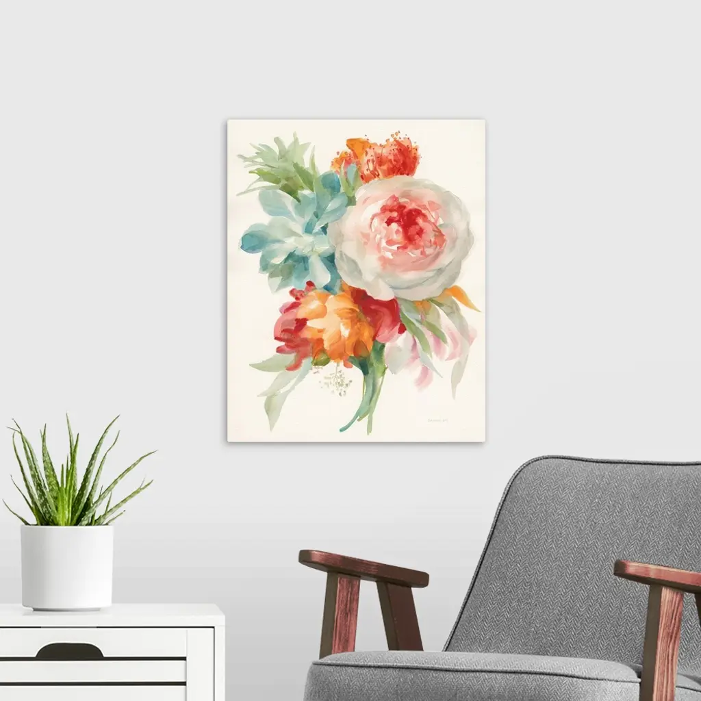 Vertical watercolor painting of a variety of flowers in pastel colors.