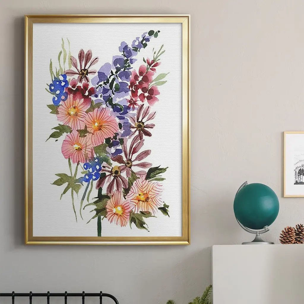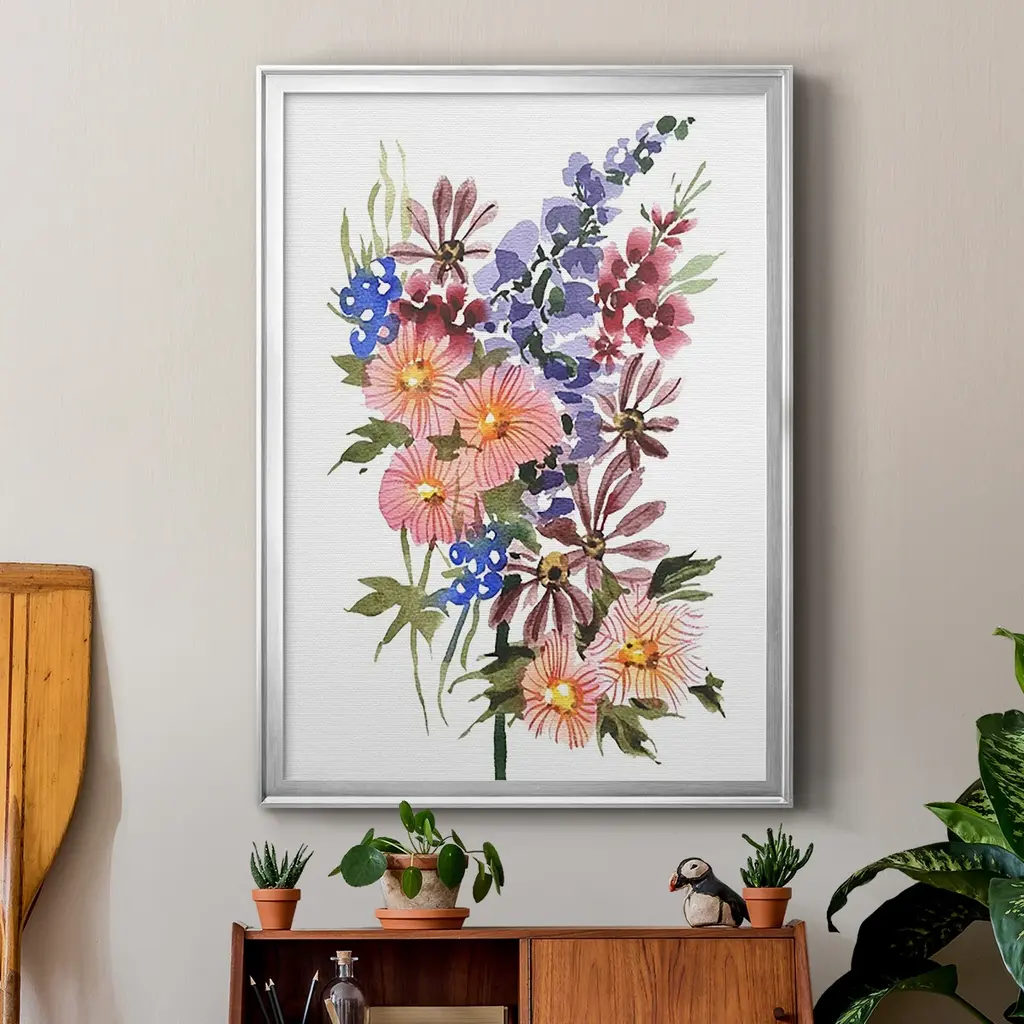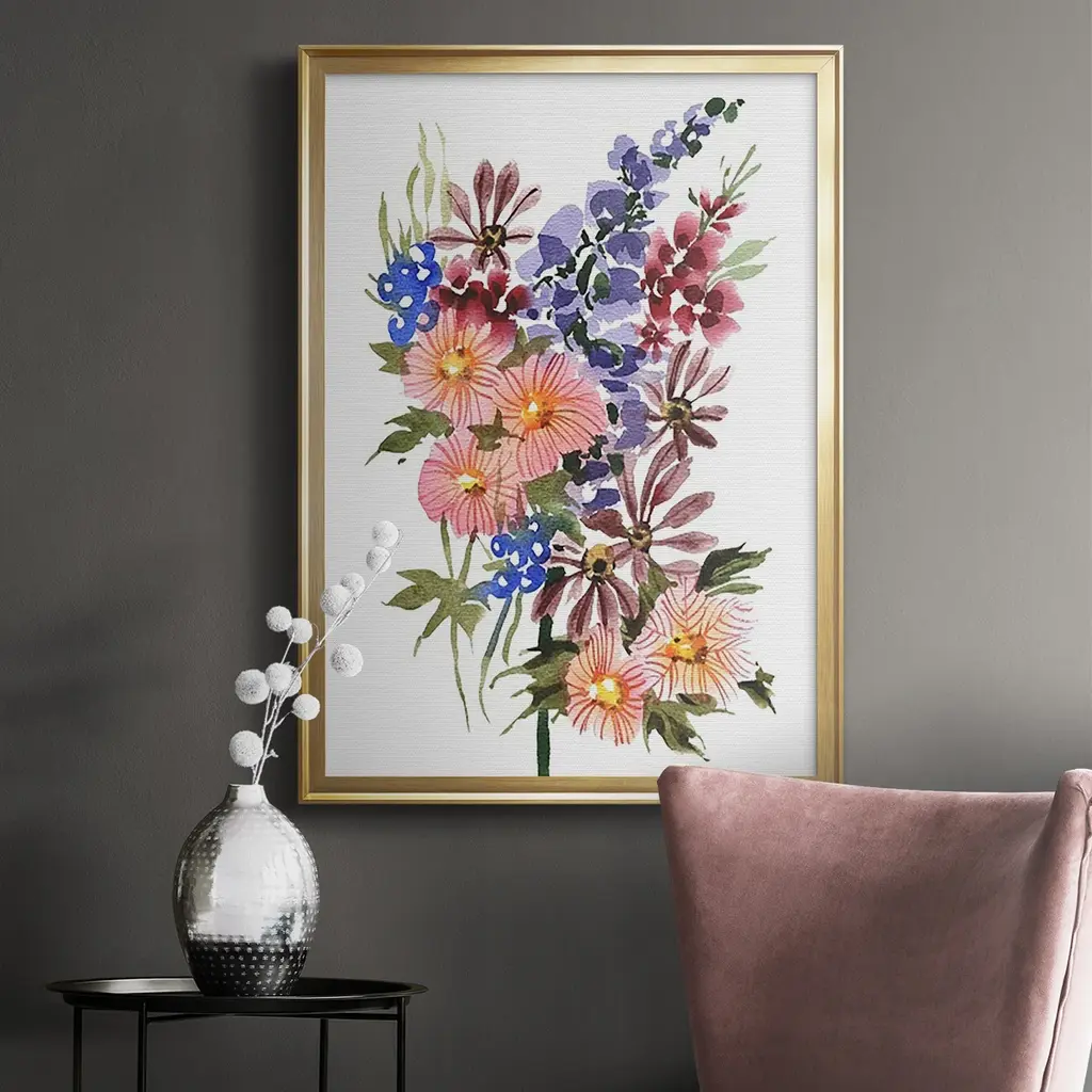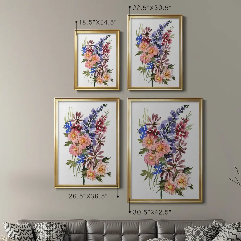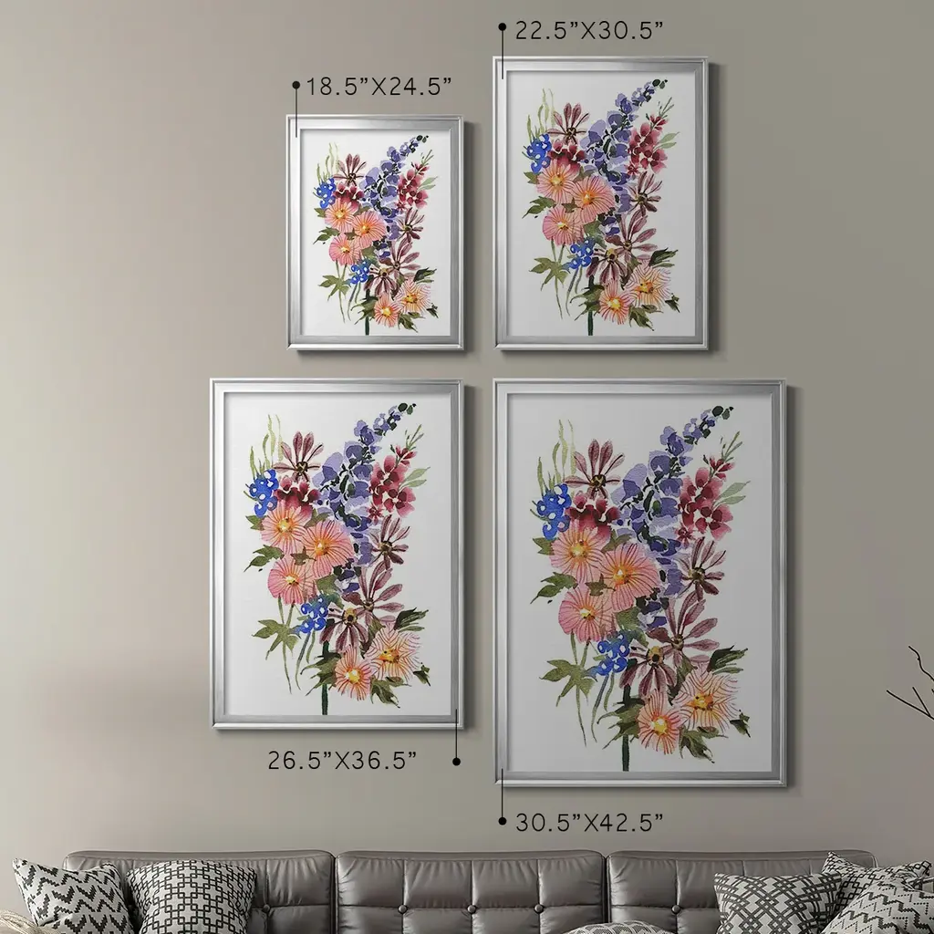 Garden Bouquets III Premium Framed Print - Ready to Hang A Premium Framed Print created to last. Framed in distressed wood and available in an array of sizes and colors Featuring a beveled a solid wood stretcher bar, each piece comes ready to hand 4 SIZES AVAILABLE 30.5''X42.5'' - Overall Size 26.5'X36.5'' - Overall Size 22.5''x30.5'' - Overall Size 18.5''x24.5'' - Overall Size Each piece is made to order. Each piece comes with hanging hardware. Made in the USA Ready to Hang