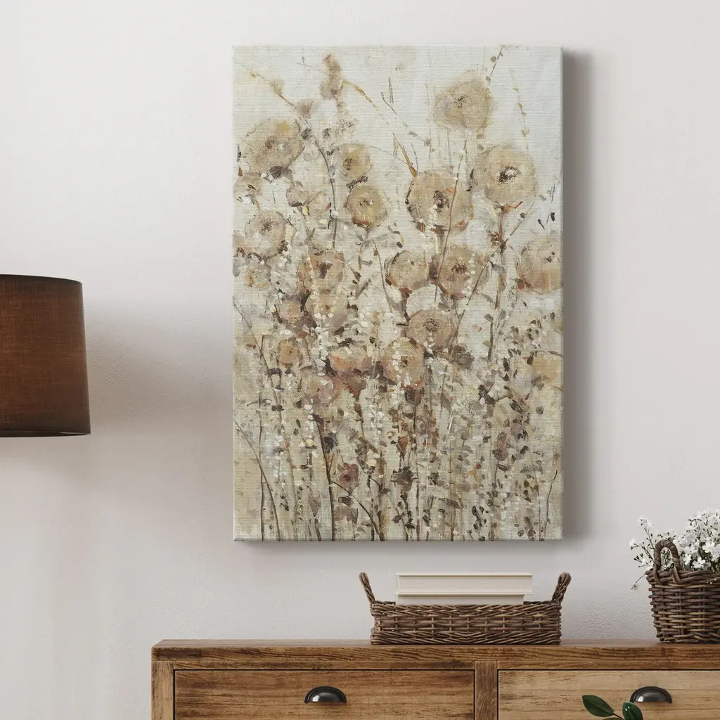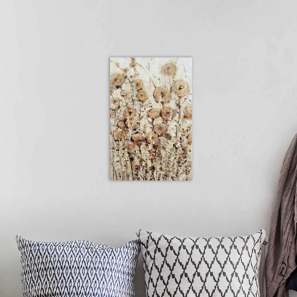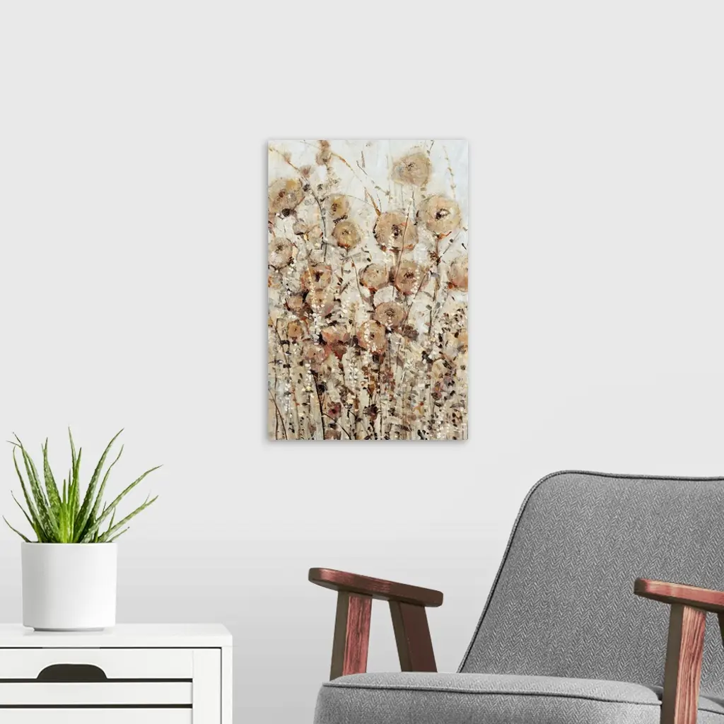 Contemporary painting of abstracted wildflowers in various brown hues.