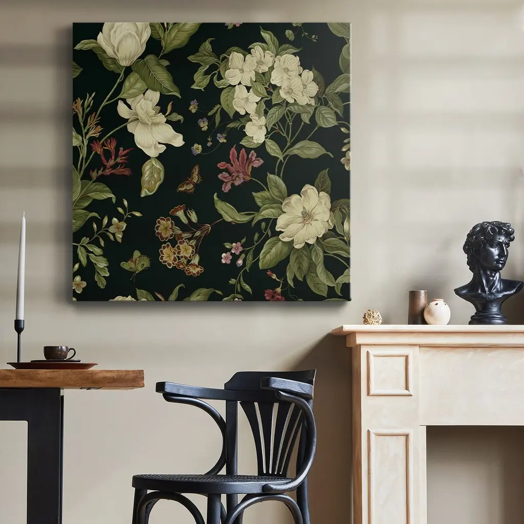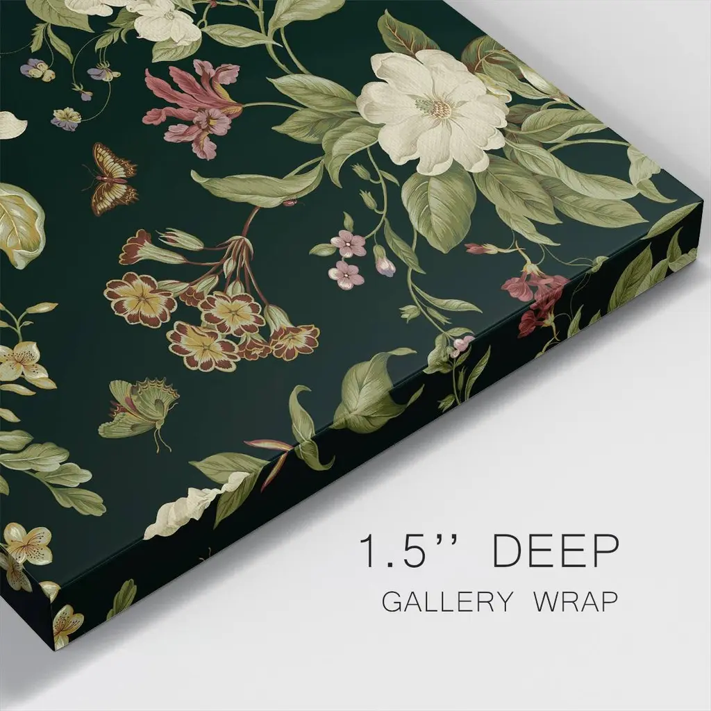 Garden Floral on Black II-Premium Gallery Wrapped Canvas - Ready to Hang A premium hand stretched gallery wrapped canvas print created to last. Featuring a beveled a solid wood stretcher bar, each piece comes ready to hand 5 SIZES AVAILABLE 10''X10'' - Overall Size 16''x16'' - Overall Size 24''x24'' - Overall Size 32''x32'' - Overall Size 40''x40'' - Overall Size Each piece is made to order. Built to Last Each piece comes ready to hang Solid wood stretcher Fade and Water resistant Made domestically