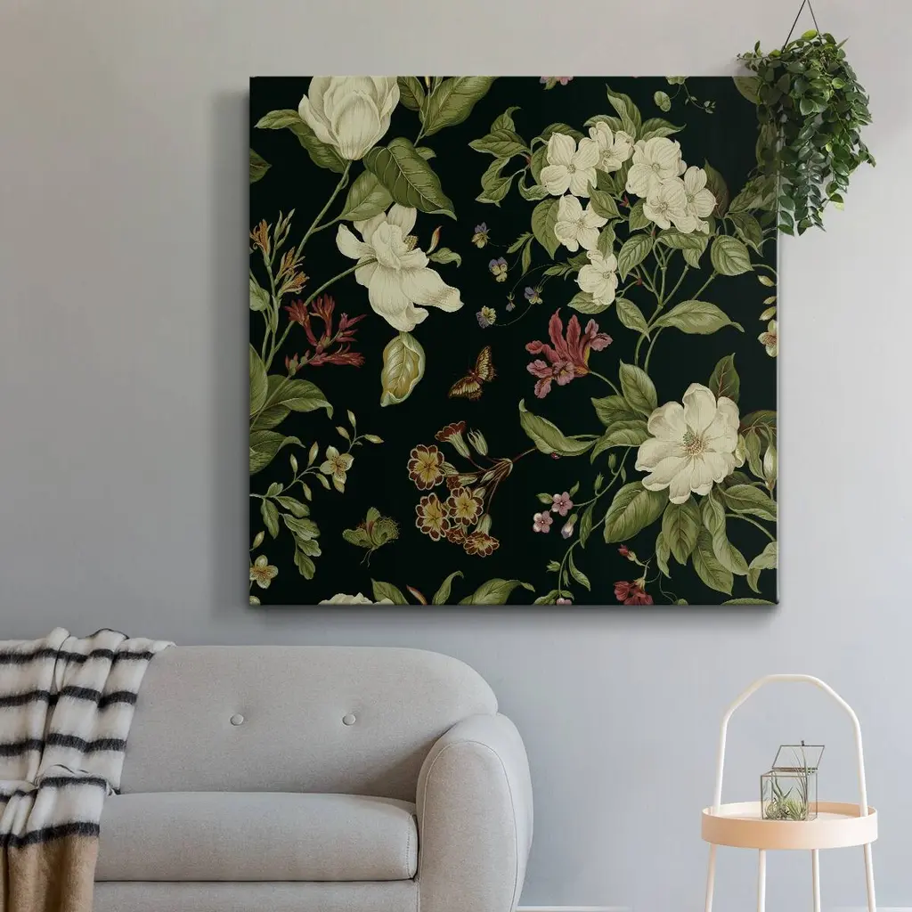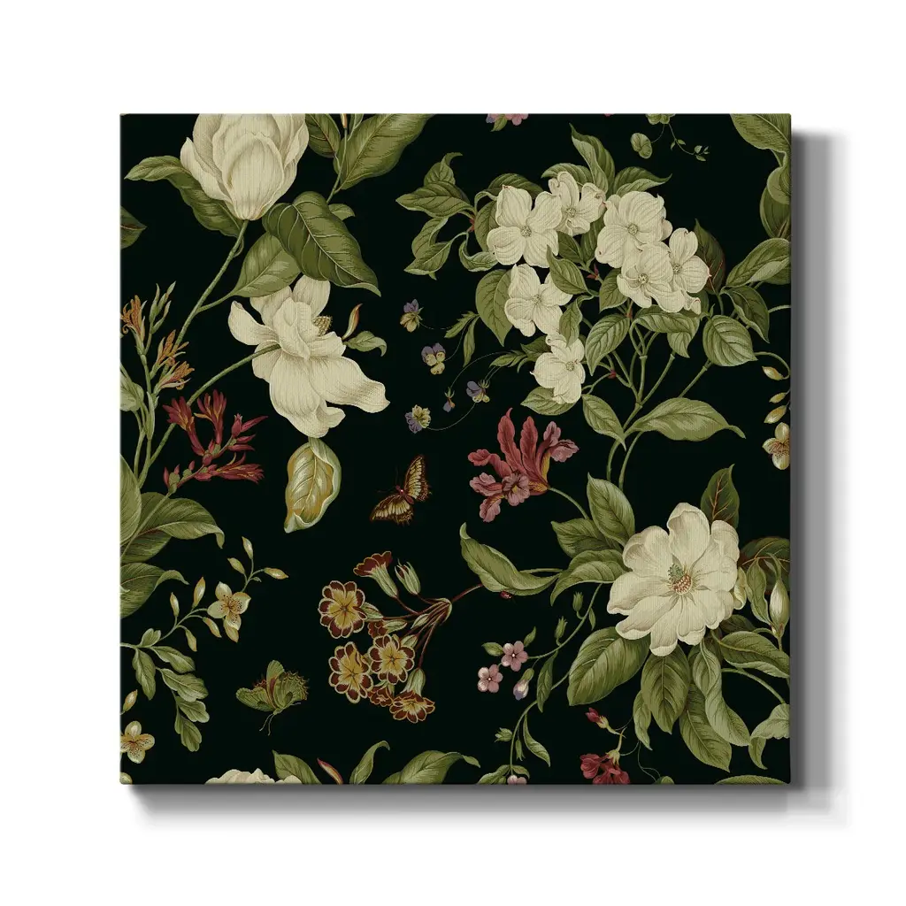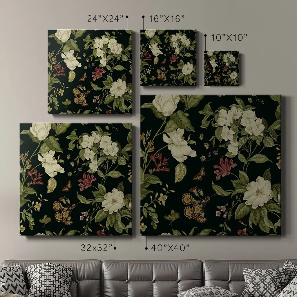 Garden Floral on Black II-Premium Gallery Wrapped Canvas - Ready to Hang A premium hand stretched gallery wrapped canvas print created to last. Featuring a beveled a solid wood stretcher bar, each piece comes ready to hand 5 SIZES AVAILABLE 10''X10'' - Overall Size 16''x16'' - Overall Size 24''x24'' - Overall Size 32''x32'' - Overall Size 40''x40'' - Overall Size Each piece is made to order. Built to Last Each piece comes ready to hang Solid wood stretcher Fade and Water resistant Made domestically