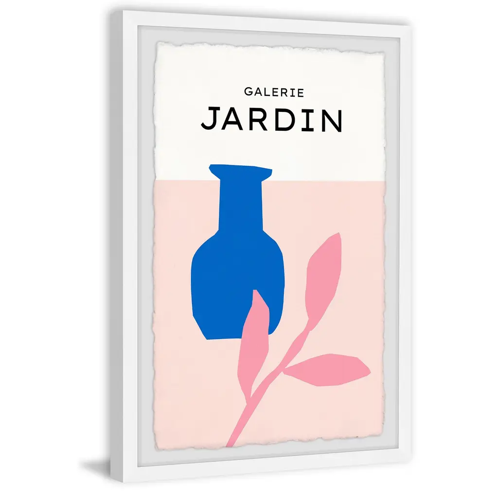 This colorful pastel drawing print features a bright blue vase next to a pink leafy plant and text that says, Galerie Jardin. Proudly printed in the USA, this piece is printed on high quality archive paper and professionally hand-framed. With wall-mounting hooks included, this artful accent is ready to hang up as soon as it reaches your front door. • Top quality Giclee print on high resolution Archive Paper • Hand cut deckled edges • High quality durable non-warping frame • Finished under shatter resistant plexiglass • Arrives ready to hang • Includes a certificate of authenticity • Printed in the USA