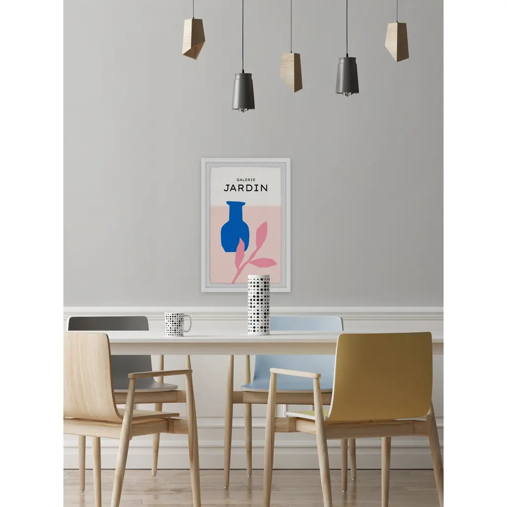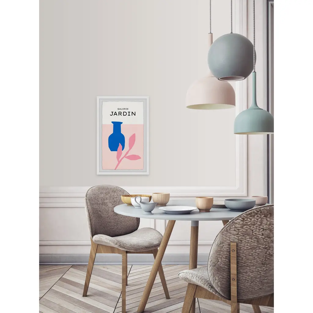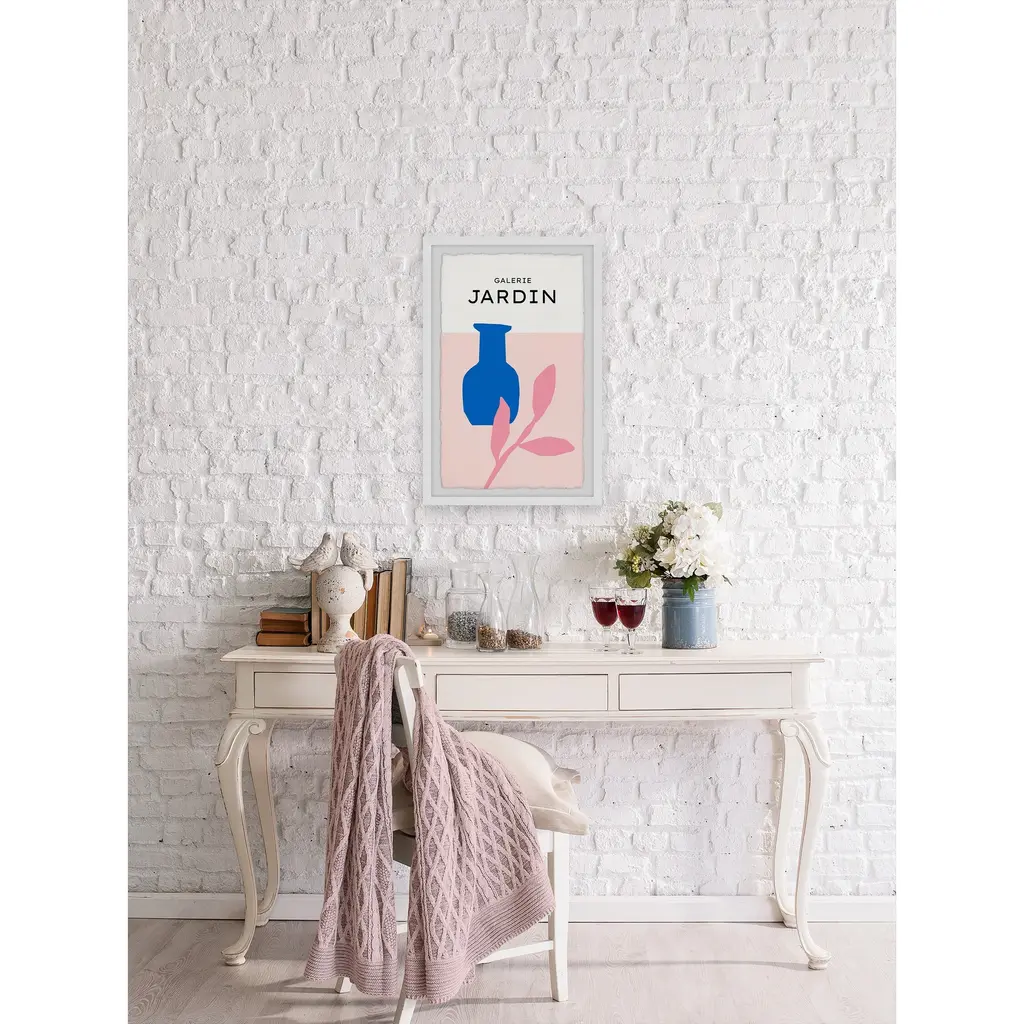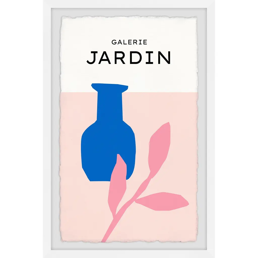 This colorful pastel drawing print features a bright blue vase next to a pink leafy plant and text that says, Galerie Jardin. Proudly printed in the USA, this piece is printed on high quality archive paper and professionally hand-framed. With wall-mounting hooks included, this artful accent is ready to hang up as soon as it reaches your front door. • Top quality Giclee print on high resolution Archive Paper • Hand cut deckled edges • High quality durable non-warping frame • Finished under shatter resistant plexiglass • Arrives ready to hang • Includes a certificate of authenticity • Printed in the USA
