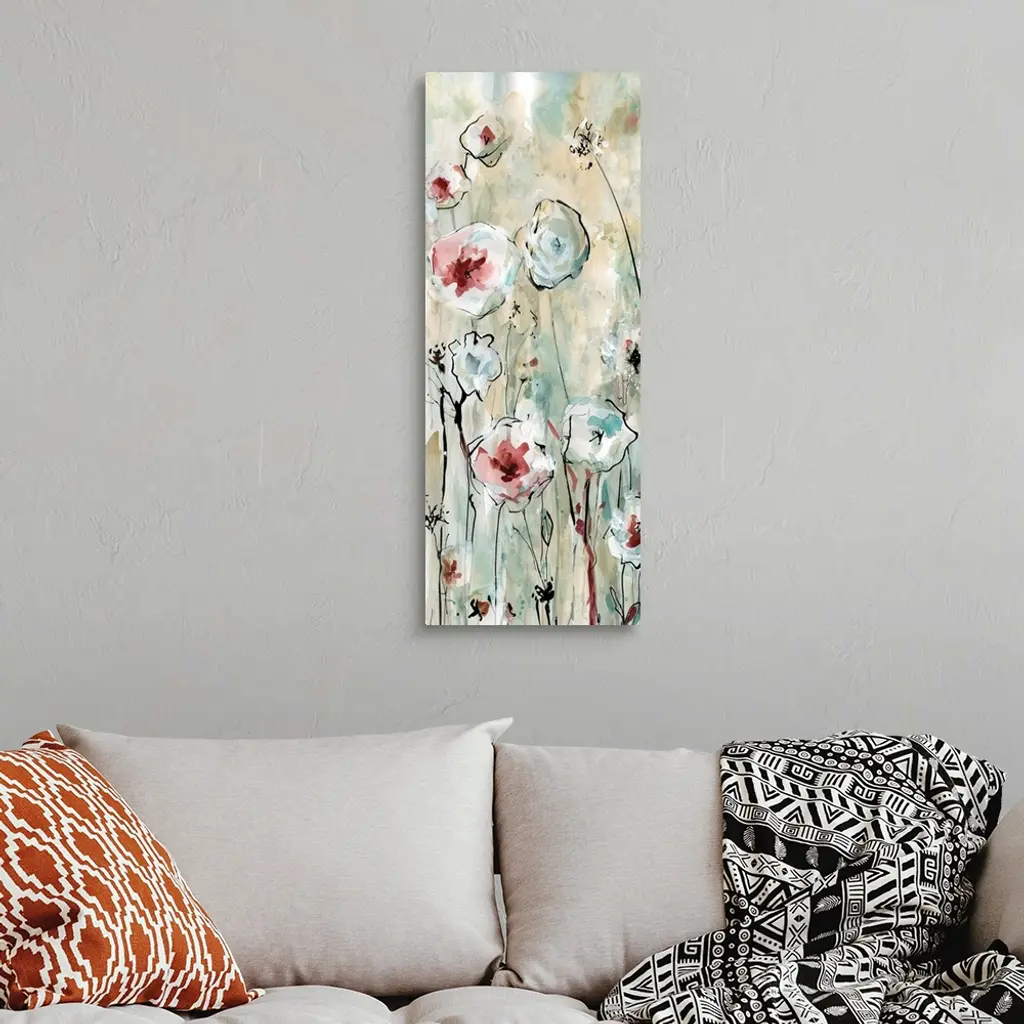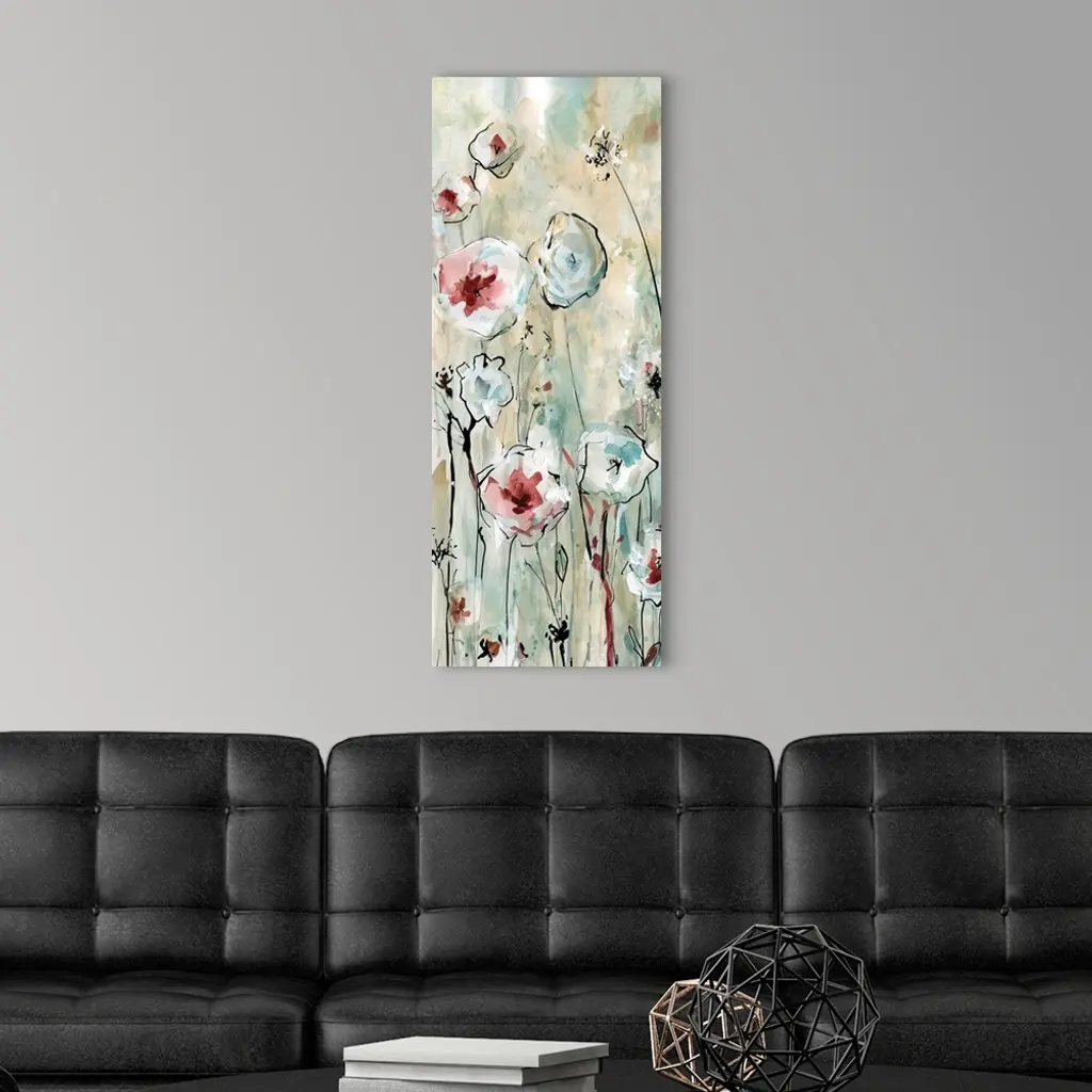 Large abstract painting of flowers with tall stems in shades of blue, red, and beige.