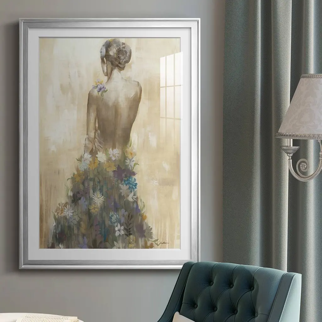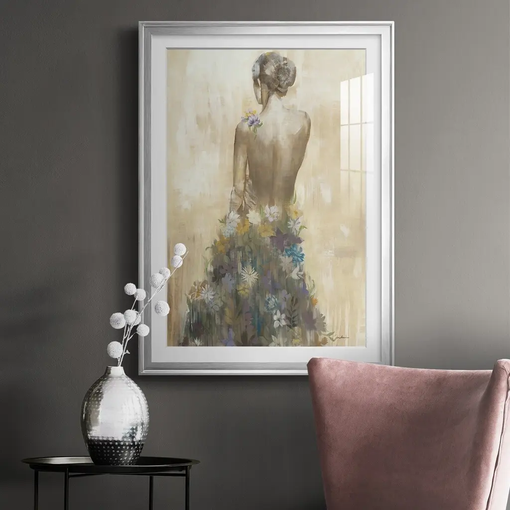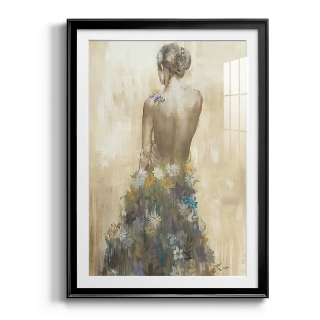 Garden Gown Premium Framed Print - Ready to Hang A Premium Framed Print created to last. Framed in distressed wood and available in an array of sizes and colors Featuring a beveled a solid wood stretcher bar, each piece comes ready to hand 4 SIZES AVAILABLE 30.5''X42.5'' - Overall Size 26.5'X36.5'' - Overall Size 22.5''x30.5'' - Overall Size 18.5''x24.5'' - Overall Size Each piece is made to order. Each piece comes with hanging hardware. Made in the USA Ready to Hang Giclee Paper Print Acrylic Glass Beveled Matt Board