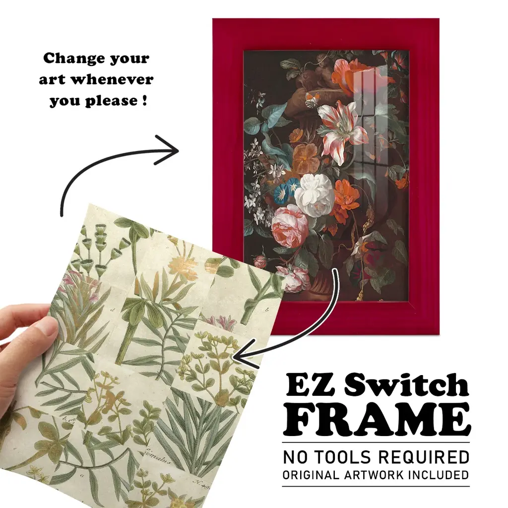 Garden Grid II -EZ SWITCH Framed Print w/glass-Cherry Red A delightful, framed print. Featuring a solid wood frame with real wood glass. This premium print is giclee quality. In addition, every frame features a removable back and table top stand. This allows you to change your art in the future or to just stand the art on a table for a new look. We are sure you'll enjoy our new series of EZ SWITCH Framed Art. Solid Wood Frame Real Glass Removable / Replaceable Art Built in Tabletop Stand Sizes range from 4x6 up to 12x15 - buy just one or pair them up as sets as you see fit.