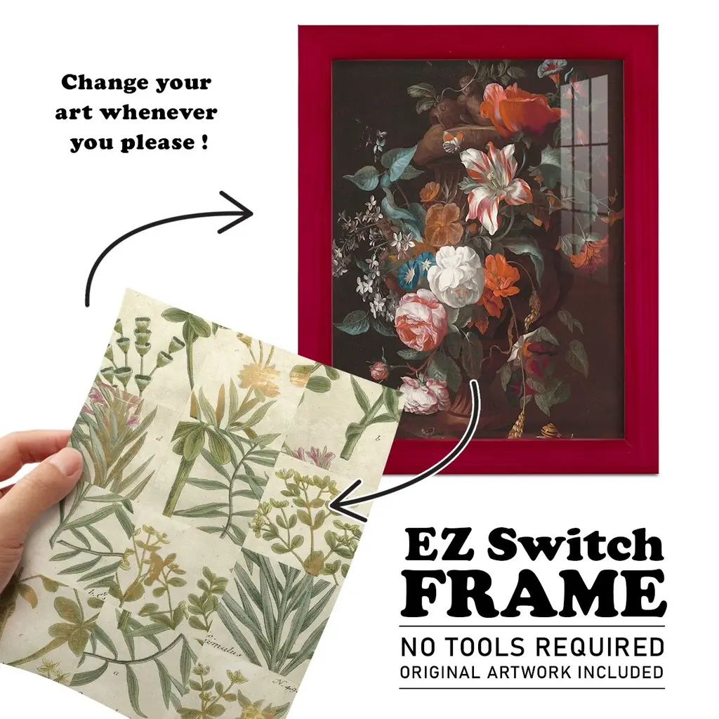 Garden Grid II -EZ SWITCH Framed Print w/glass-Cherry Red A delightful, framed print. Featuring a solid wood frame with real wood glass. This premium print is giclee quality. In addition, every frame features a removable back and table top stand. This allows you to change your art in the future or to just stand the art on a table for a new look. We are sure you'll enjoy our new series of EZ SWITCH Framed Art. Solid Wood Frame Real Glass Removable / Replaceable Art Built in Tabletop Stand Sizes range from 4x6 up to 12x15 - buy just one or pair them up as sets as you see fit.