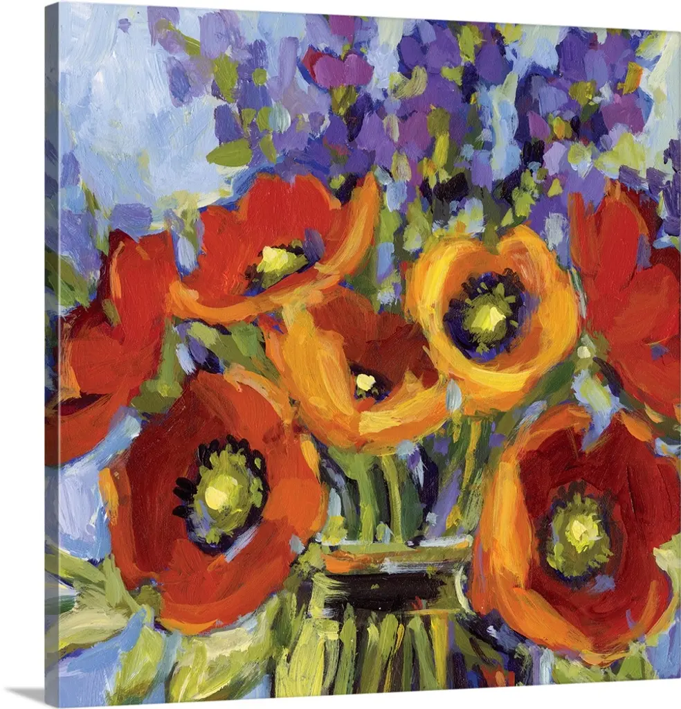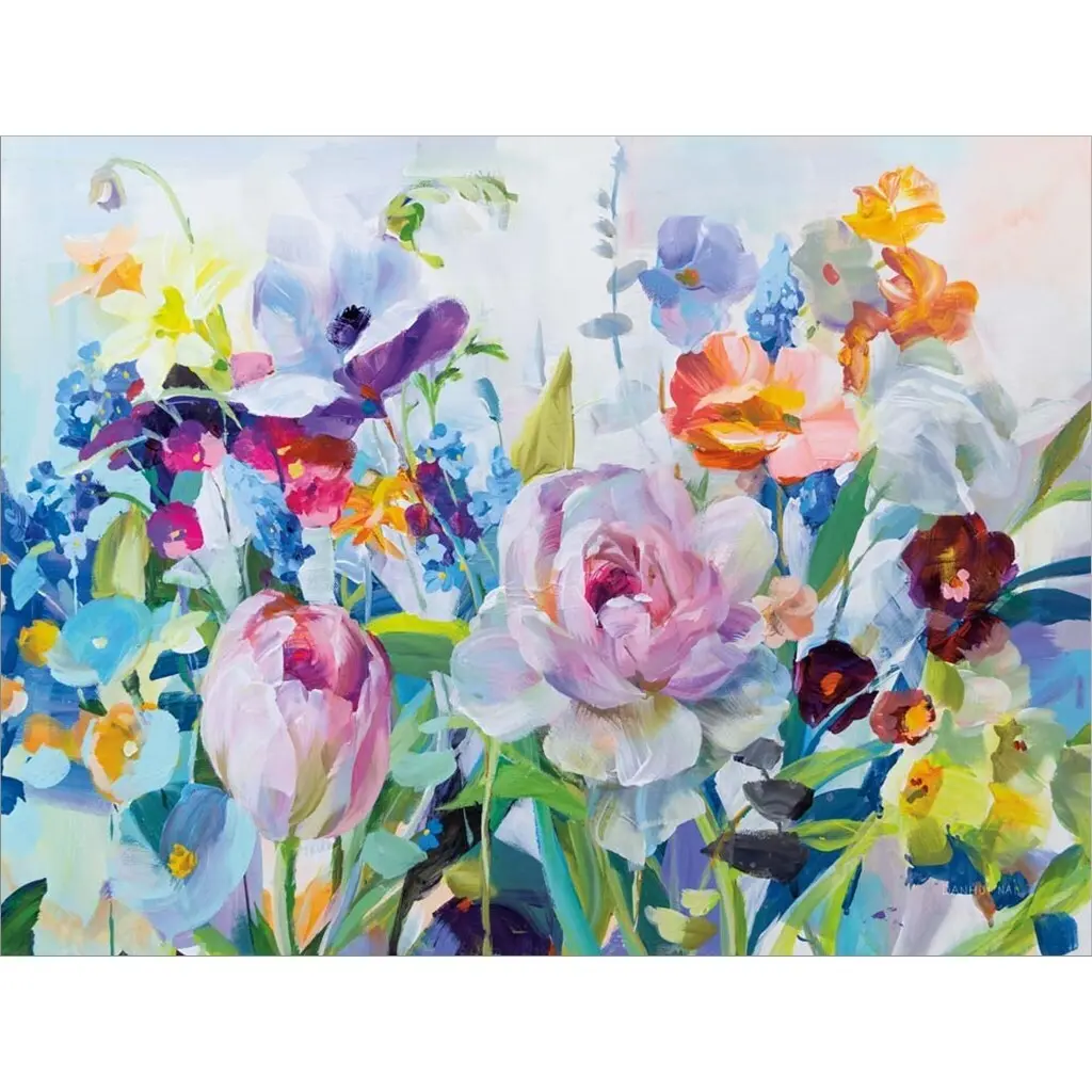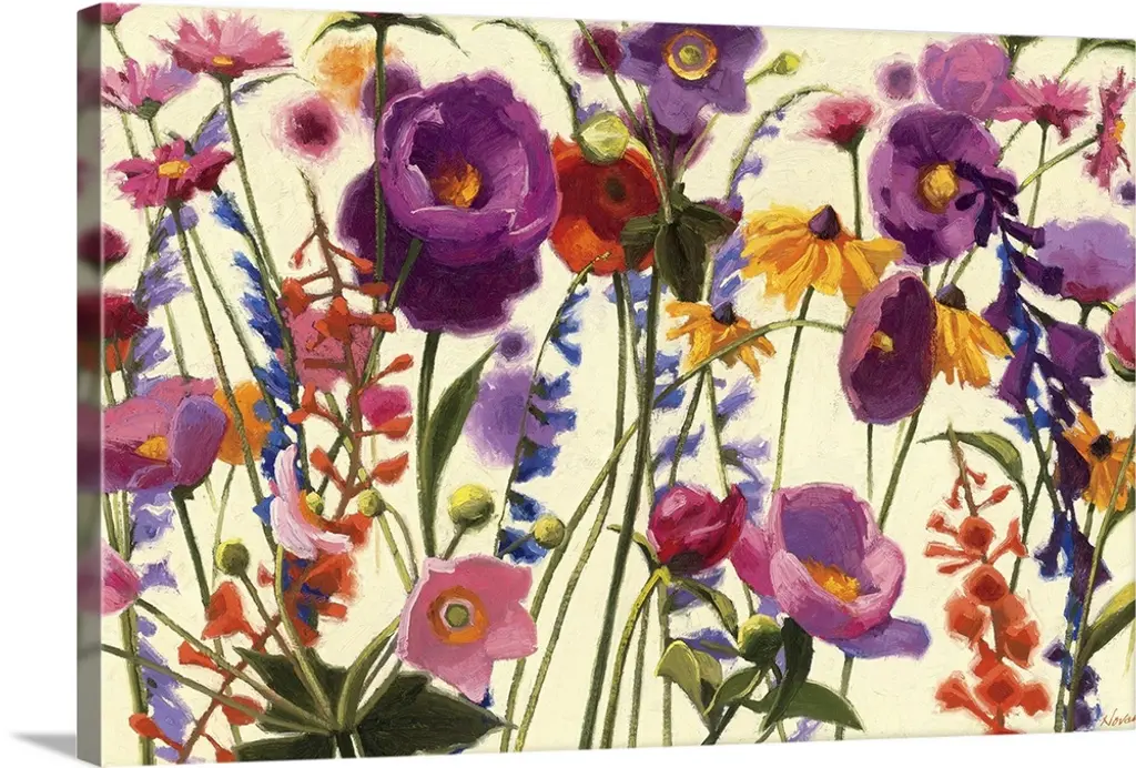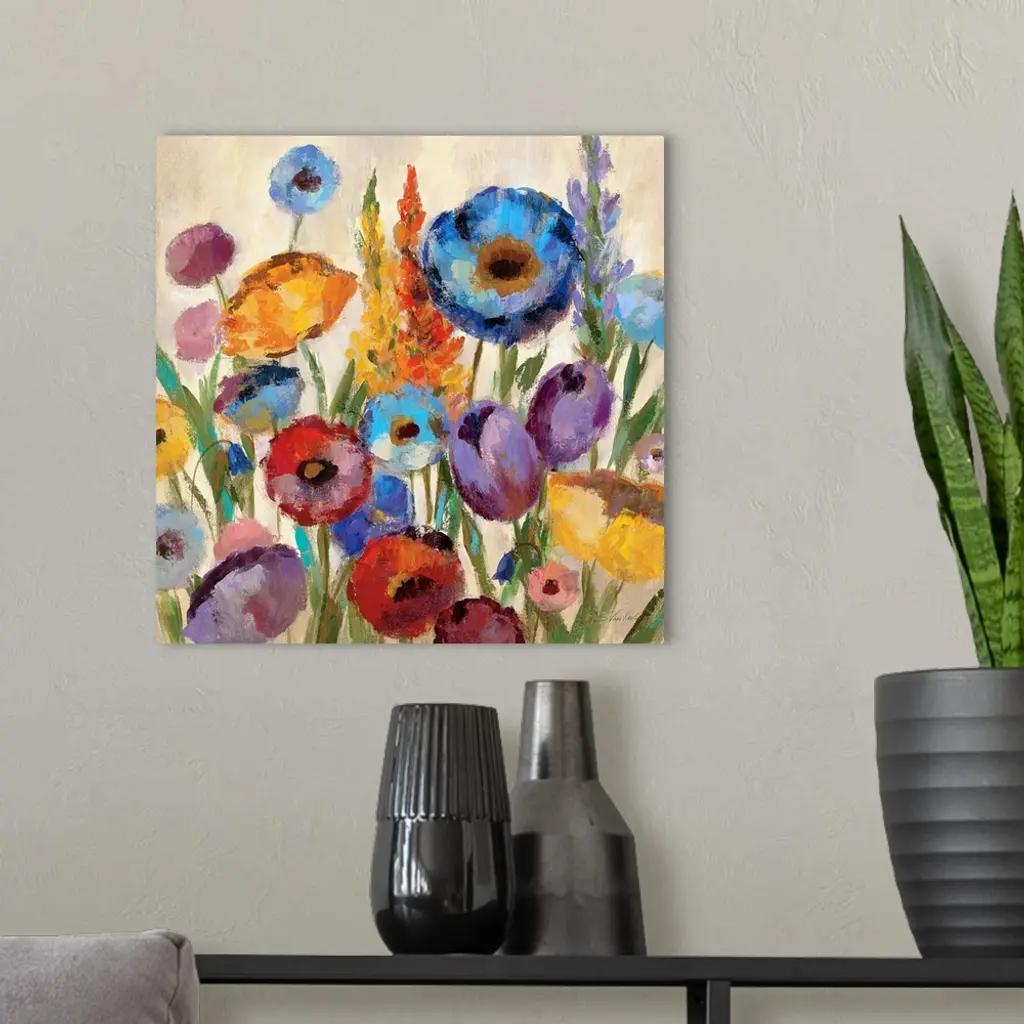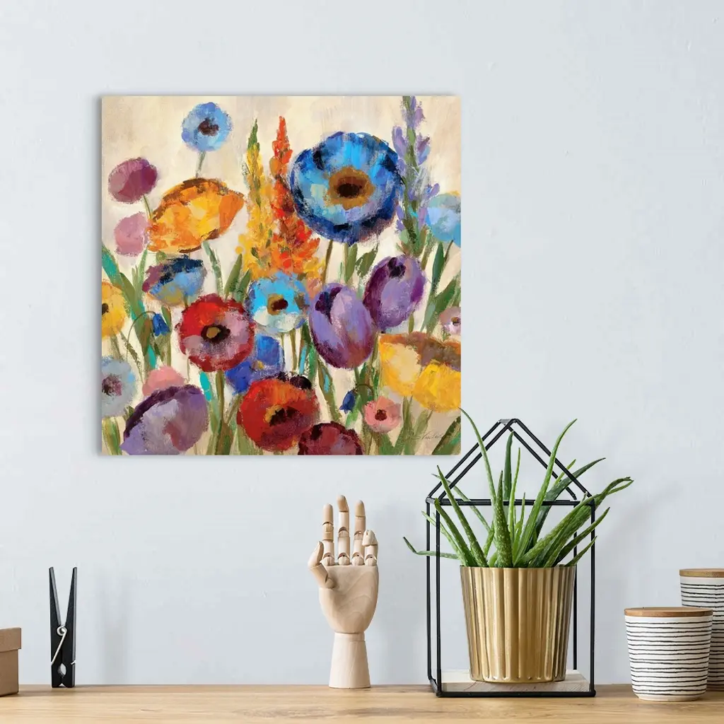 Square, oversized wall painting of a large variety group of flowers in assorted colors on a tan background.