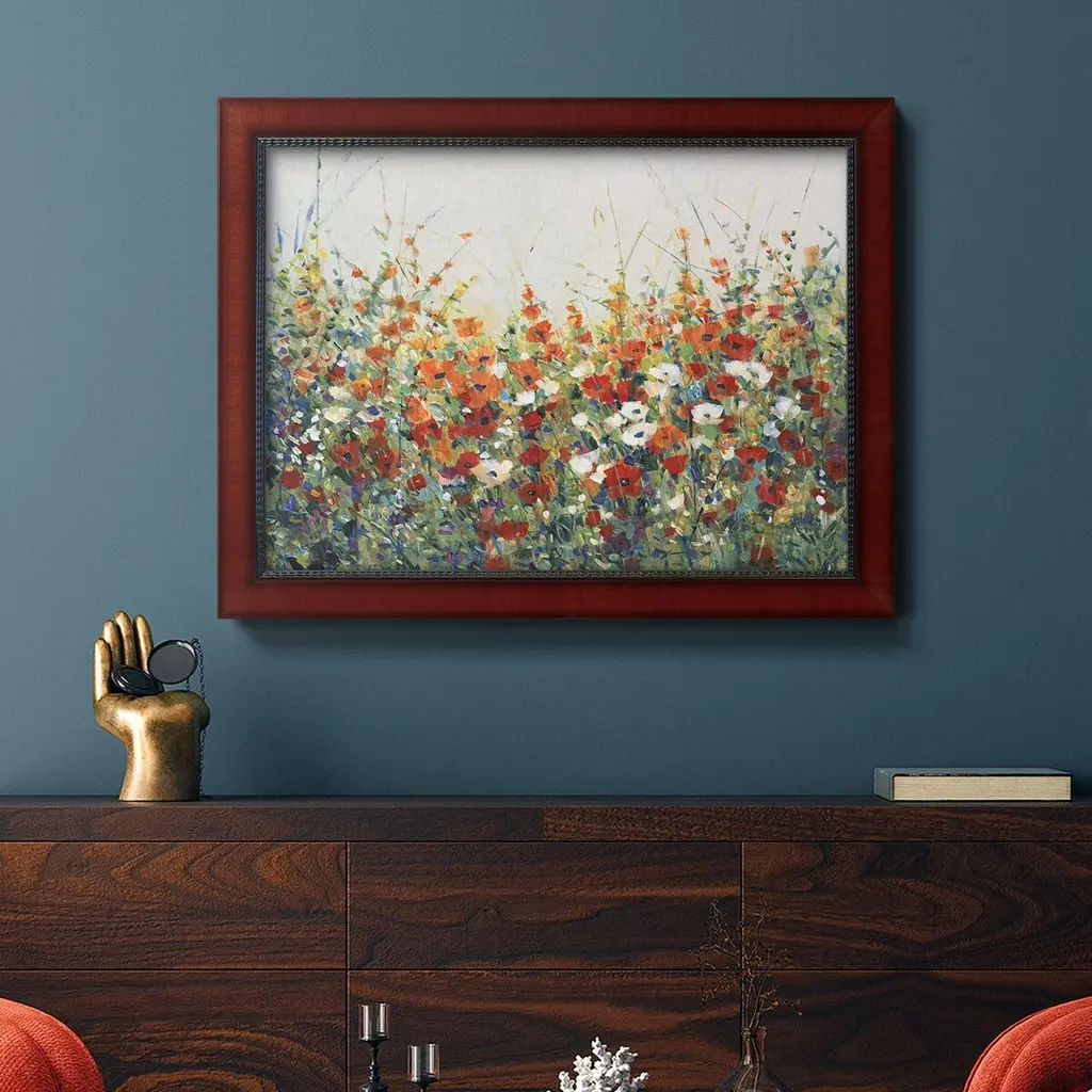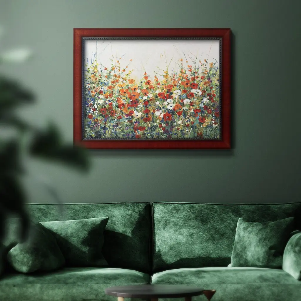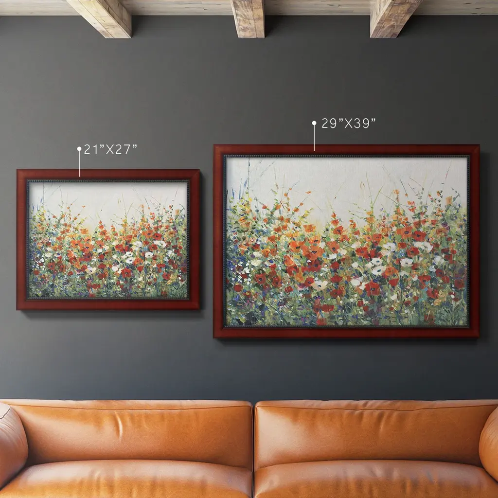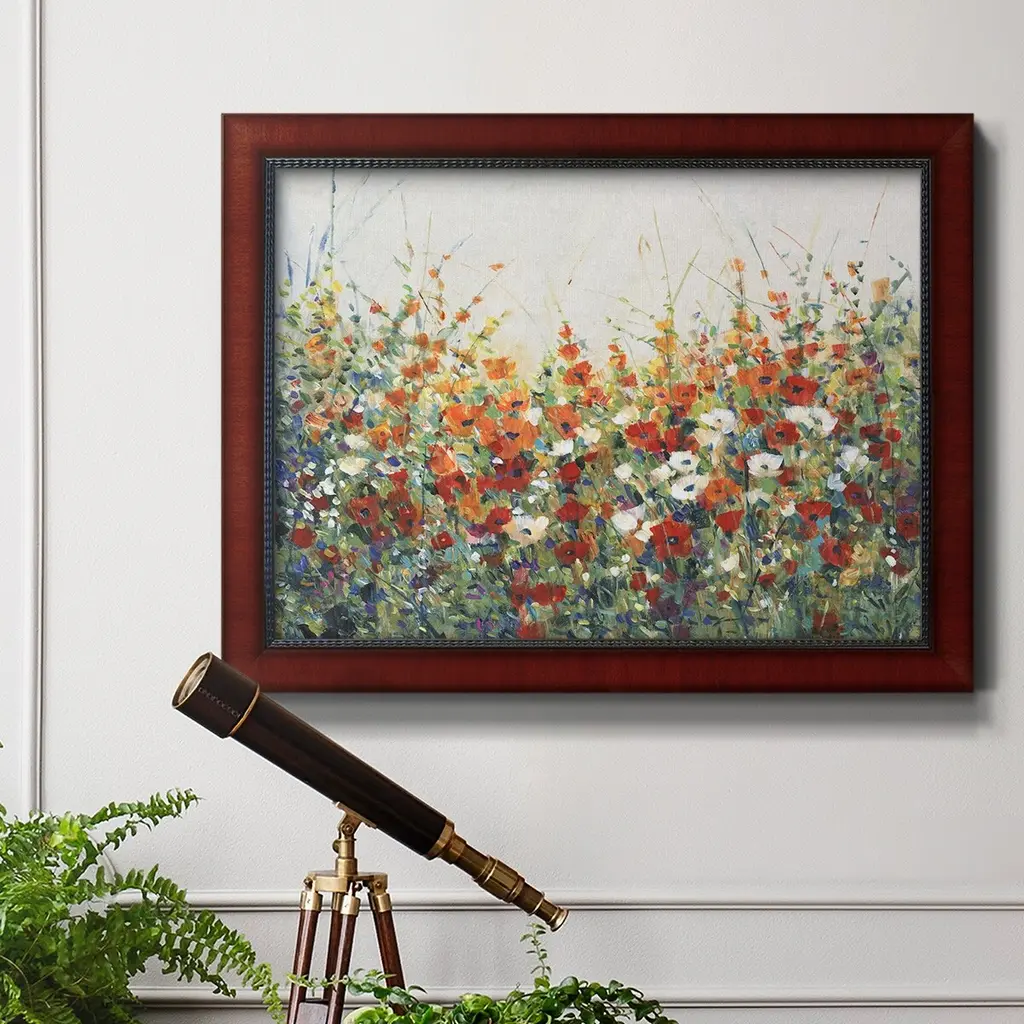 Garden in Bloom I Premium Framed Canvas- Ready to Hang A Premium Framed Canvas created to last. Framed in distressed wood and available in an array of sizes and colors Featuring a beveled a solid wood stretcher bar, each piece comes ready to hand 3 SIZES AVAILABLE 16''X20'' - Overall Size 18'X27'' - Overall Size 24''x36'' - Overall Size Each piece is made to order. Each piece comes with hanging hardware. Made in the USA Ready to Hang Giclee Paper Print Acrylic Glass Beveled Matt Board