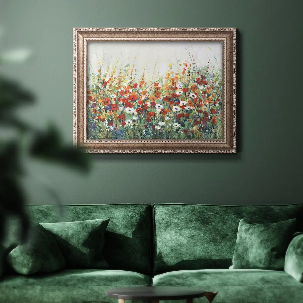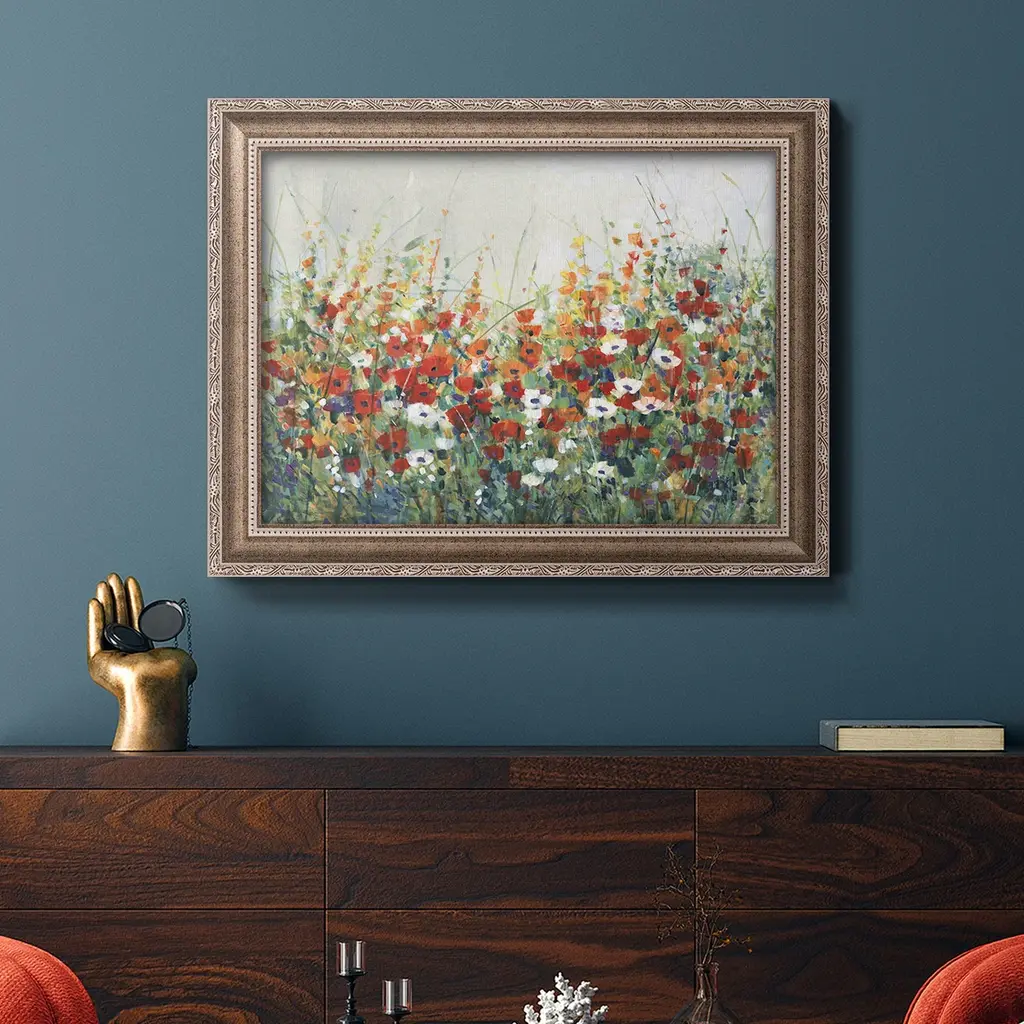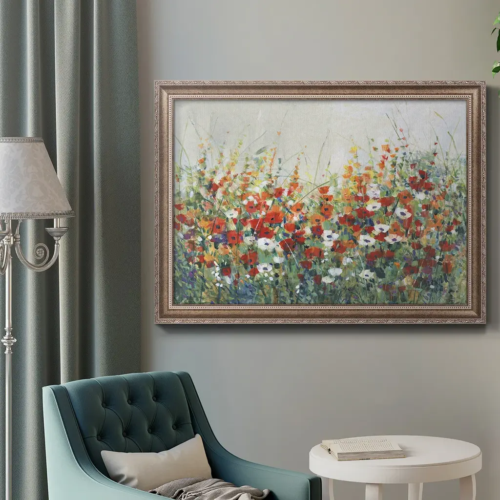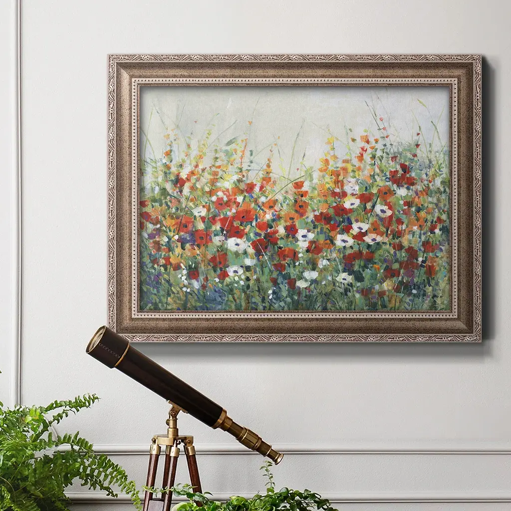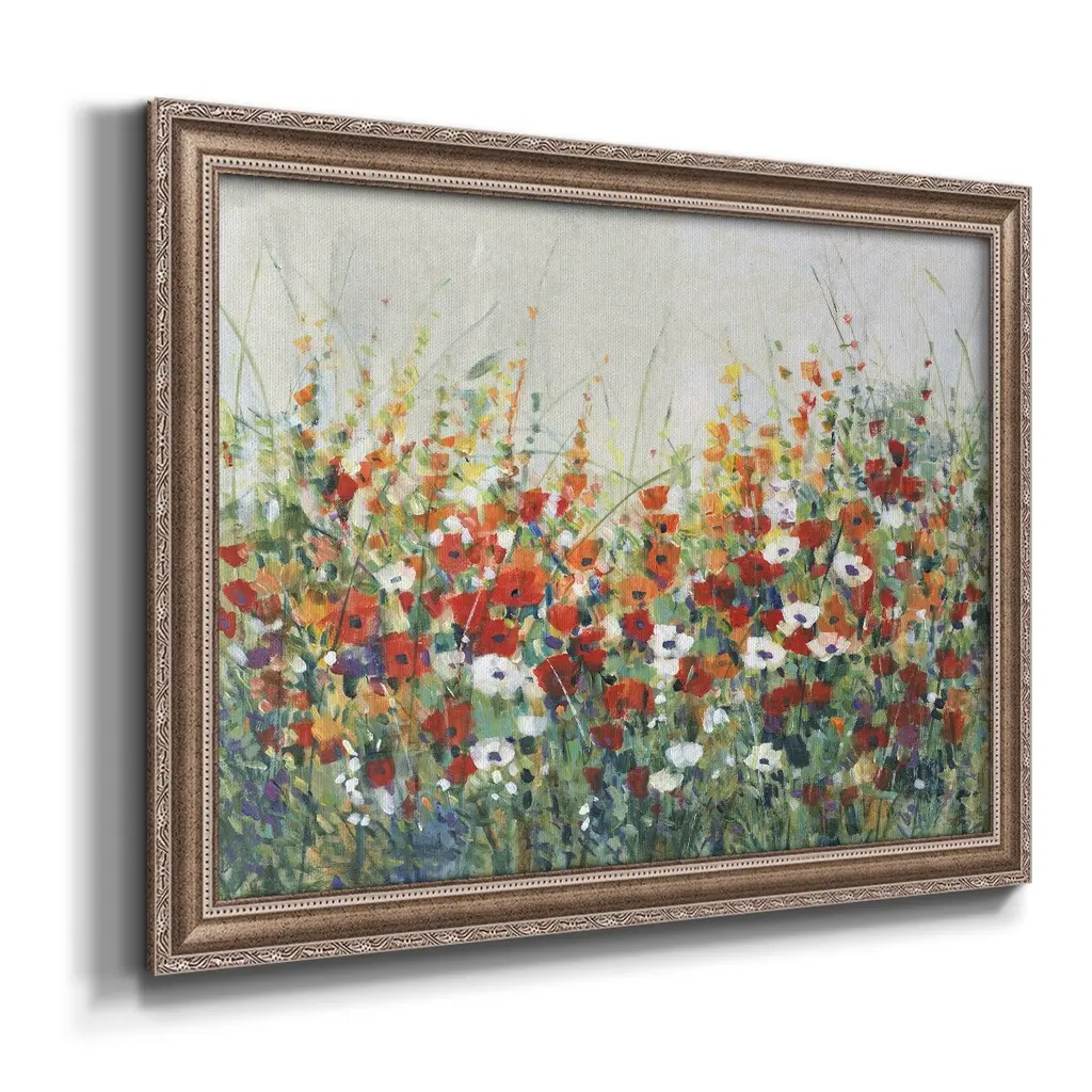 Garden in Bloom II Premium Framed Canvas- Ready to Hang A Premium Framed Canvas created to last. Framed in distressed wood and available in an array of sizes and colors Featuring a beveled a solid wood stretcher bar, each piece comes ready to hand 3 SIZES AVAILABLE 16''X20'' - Overall Size 18'X27'' - Overall Size 24''x36'' - Overall Size Each piece is made to order. Each piece comes with hanging hardware. Made in the USA Ready to Hang Giclee Paper Print Acrylic Glass Beveled Matt Board