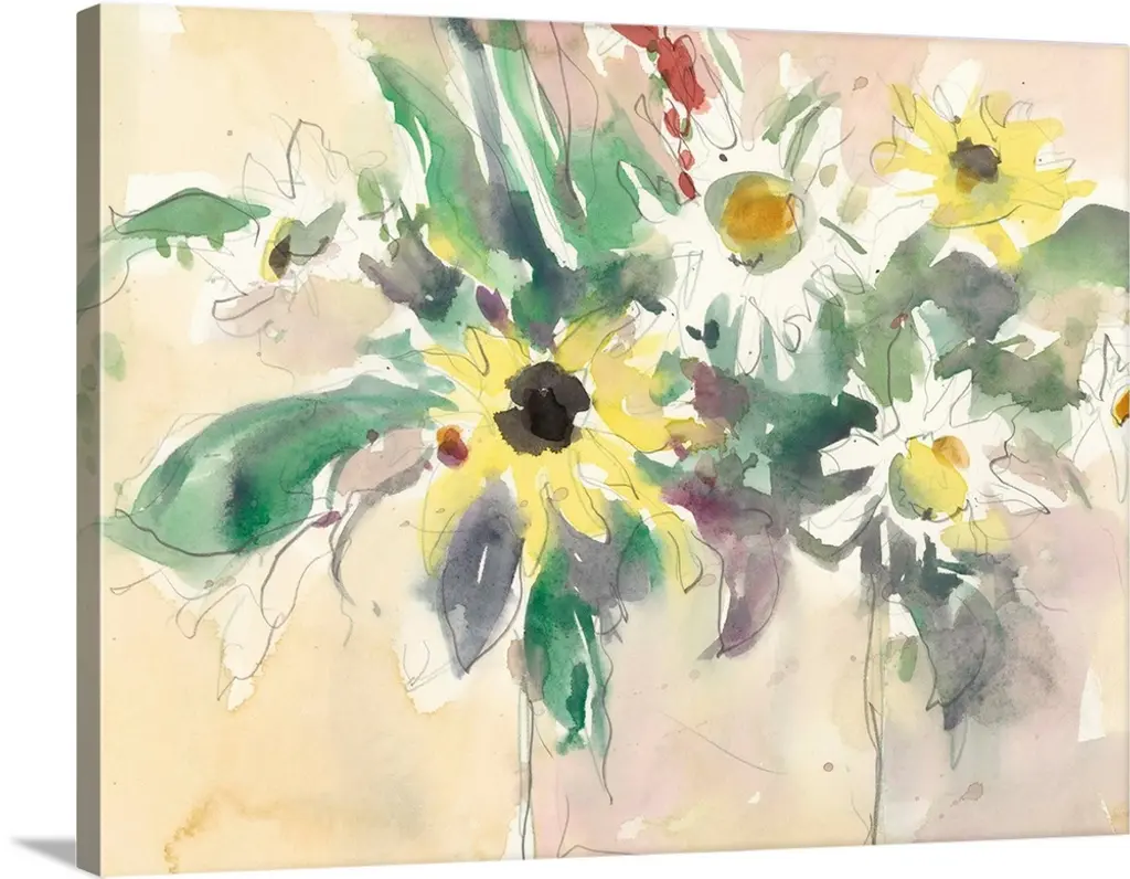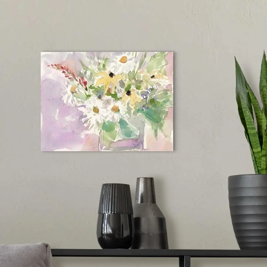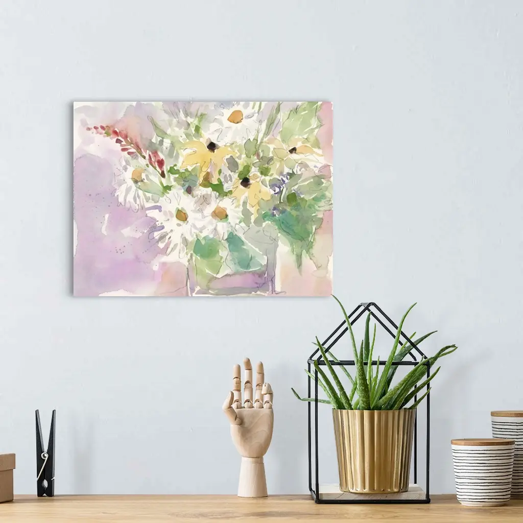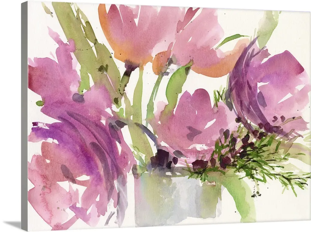 A volatile watercolor painting of a bouquet of garden flowers against a purple scenery.