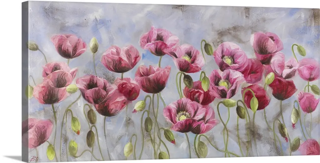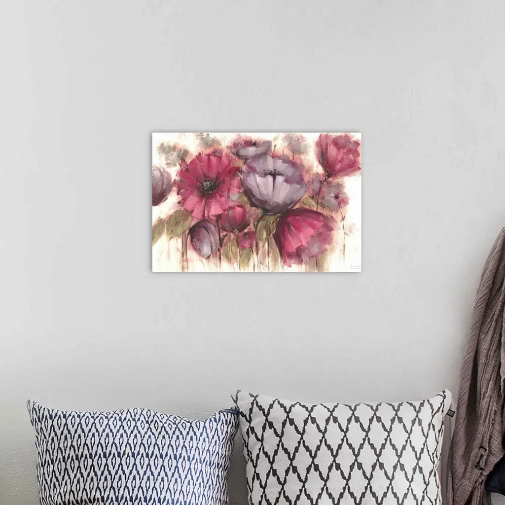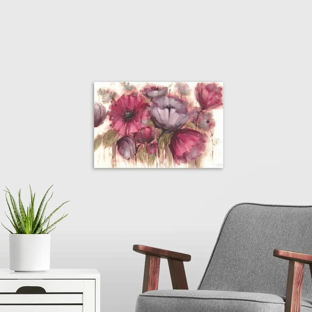 Contemporary artwork of vibrant purple flowers against a cream background.