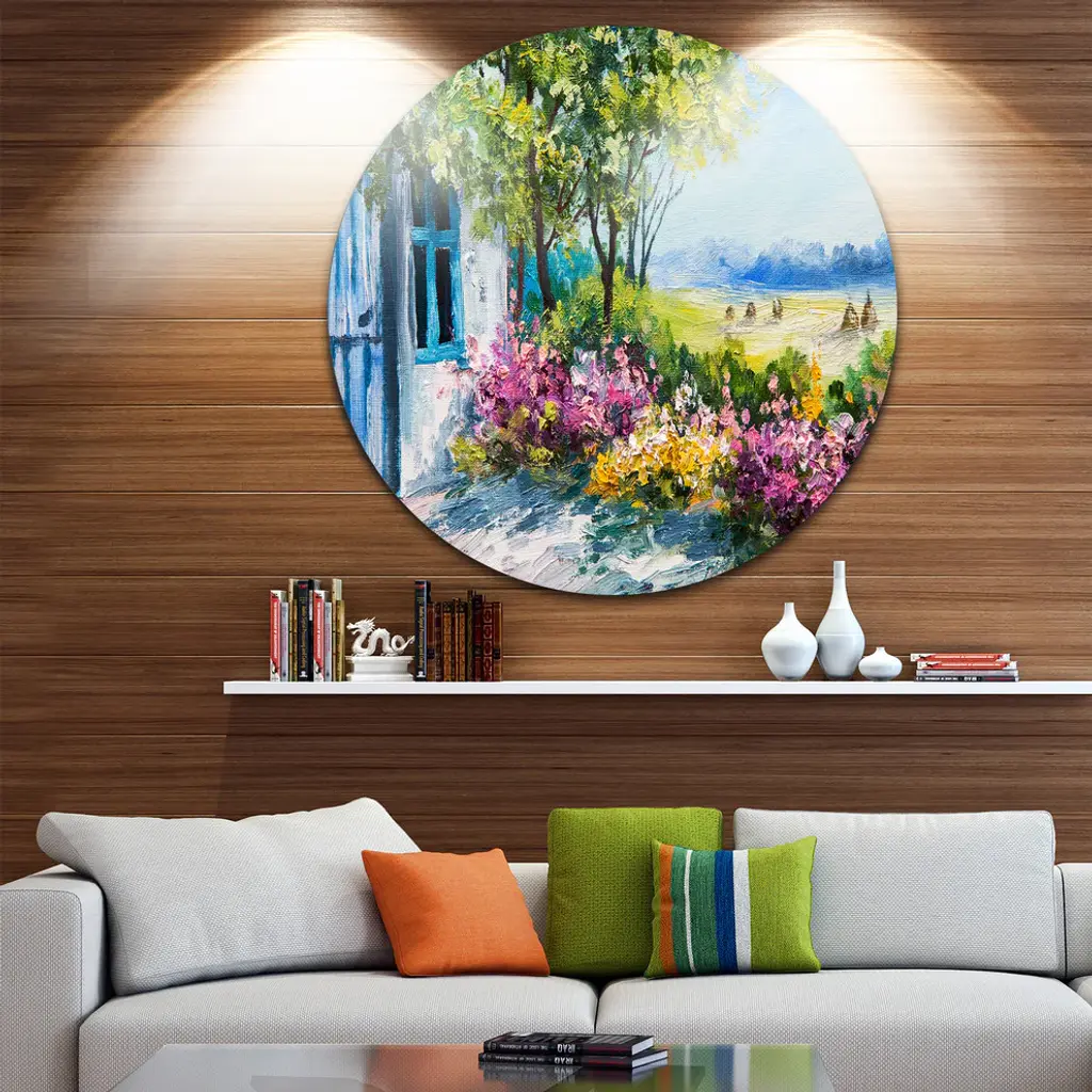 Bring Contemporary Abstraction to your home with this large Circle Metal wall art. This Garden near the House Metal Artwork makes it the focal point of any room or office. - White Gloss Coating ensures colors are extra vibrant with light reflection.- Aluminum grade Sheet Metal with 1 inch mounting frame on the back giving the illusion that the artwork is floating on the wall..- Mounting Brackets are included along with instructions.- High Quality Digital images are created directly into a glossy aluminum panel producing a stunning and captivating print into the glossy finish of the metal.- Water, Fire and Scratch resistant HD Aluminum panels.- Looks better than any photo paper and guaranteed to last at least 20 years- Easy to clean with a microfiber cloth. Colors are far superior to regular Canvas Art. - Easy to Hang