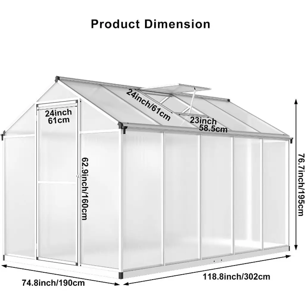 Tired of complicated setups that kill the fun before you even start? Our greenhouse changes the game. No tools, no sweat – just a simple rivet-and-slide system that lets you assemble it faster than brewing your morning coffee. Before you take that first sip, you’ll have a sturdy, ready-to-grow sanctuary. Made from featherlight yet tough aerospace-grade aluminum, this greenhouse won’t rust or buckle under harsh weather. The shatterproof polycarbonate panels act like sunglasses for your plants – filtering 99.9% of UV rays while diffusing sunlight perfectly. No more scorched leaves or uneven growth; just happy, thriving greens. Weather throwing tantrums? No problem. Rain, wind, or surprise cold snaps bounce right off the wind-resistant frame and waterproof design, keeping a cozy microclimate inside. Your tomatoes stay plump, your orchids stay delicate, and you stay stress-free. Control the climate effortlessly with the 24"x27" roof vent – open it to cool things down, close it to trap warmth. No fancy gadgets needed, just smart design that puts you in charge. Whether you’re extending tomato season, sheltering delicate blooms, or crafting a leafy retreat, this greenhouse turns any patio or yard into a productive paradise. Even your neighbor’s roses will wish they had one.