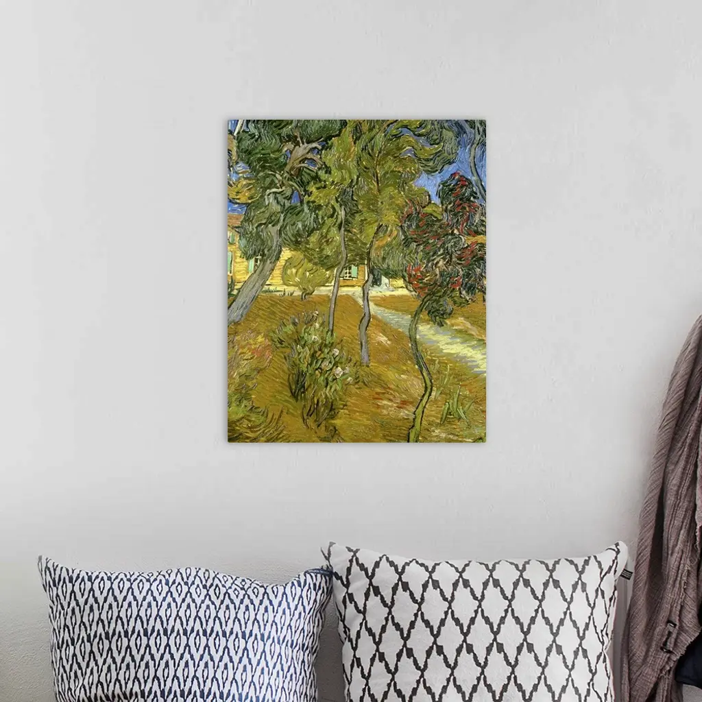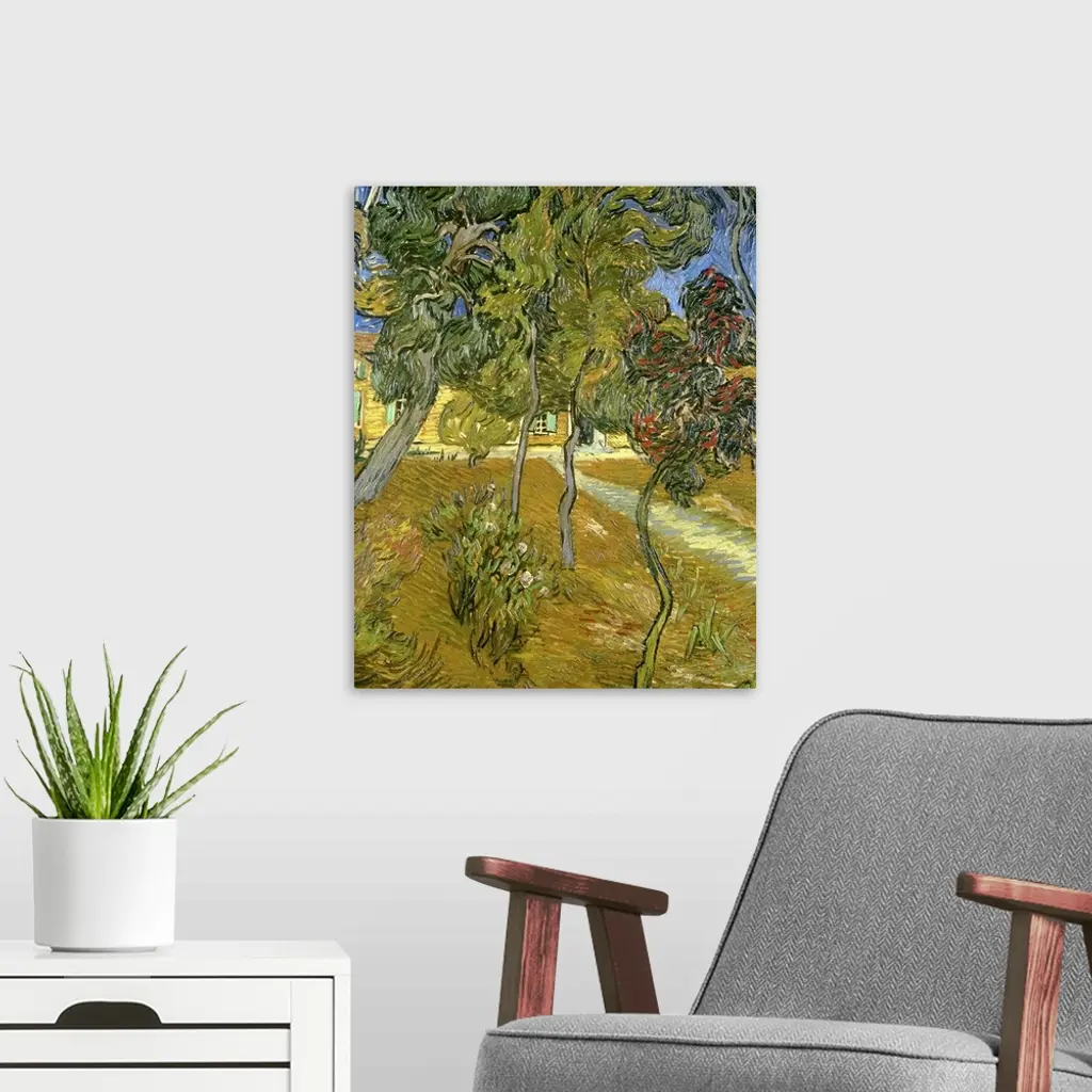 Big painting on canvas of different trees on a hill near a building made up of curving brushstrokes.