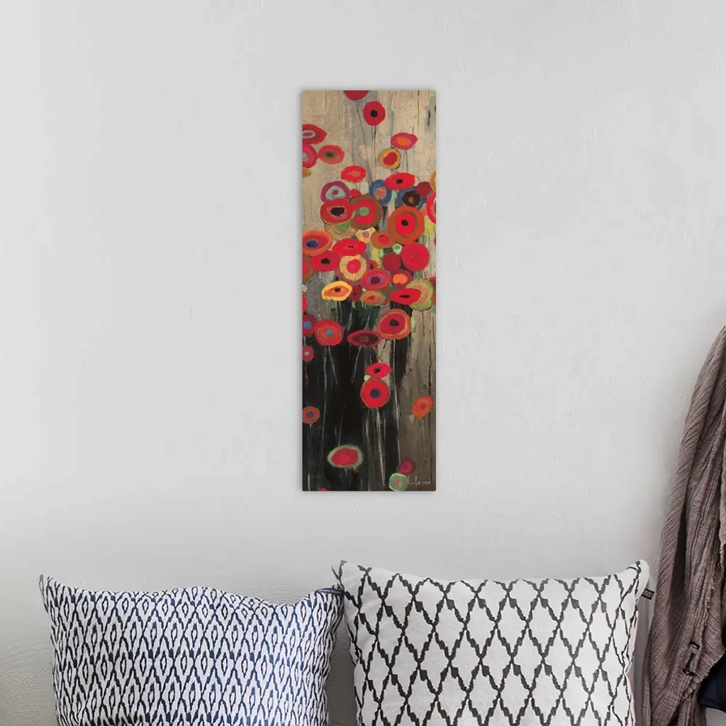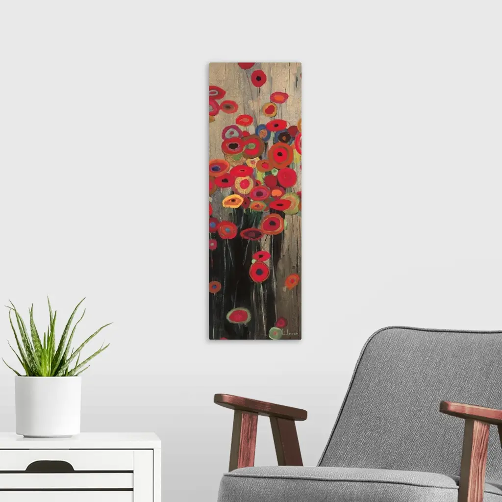 A long vertical painting of a group of multi-colored poppies on a neutral backdrop.