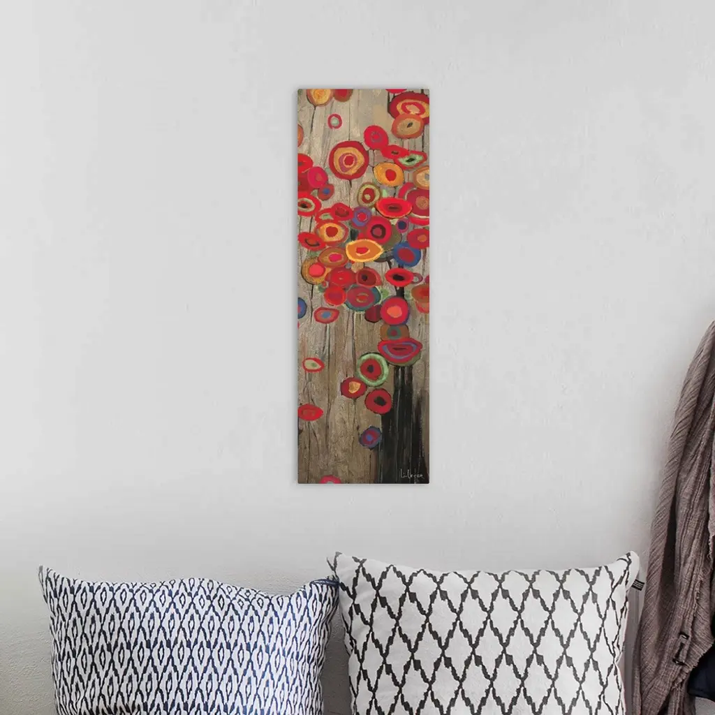 A long vertical painting of a group of multi-colored poppies on a neutral backdrop.