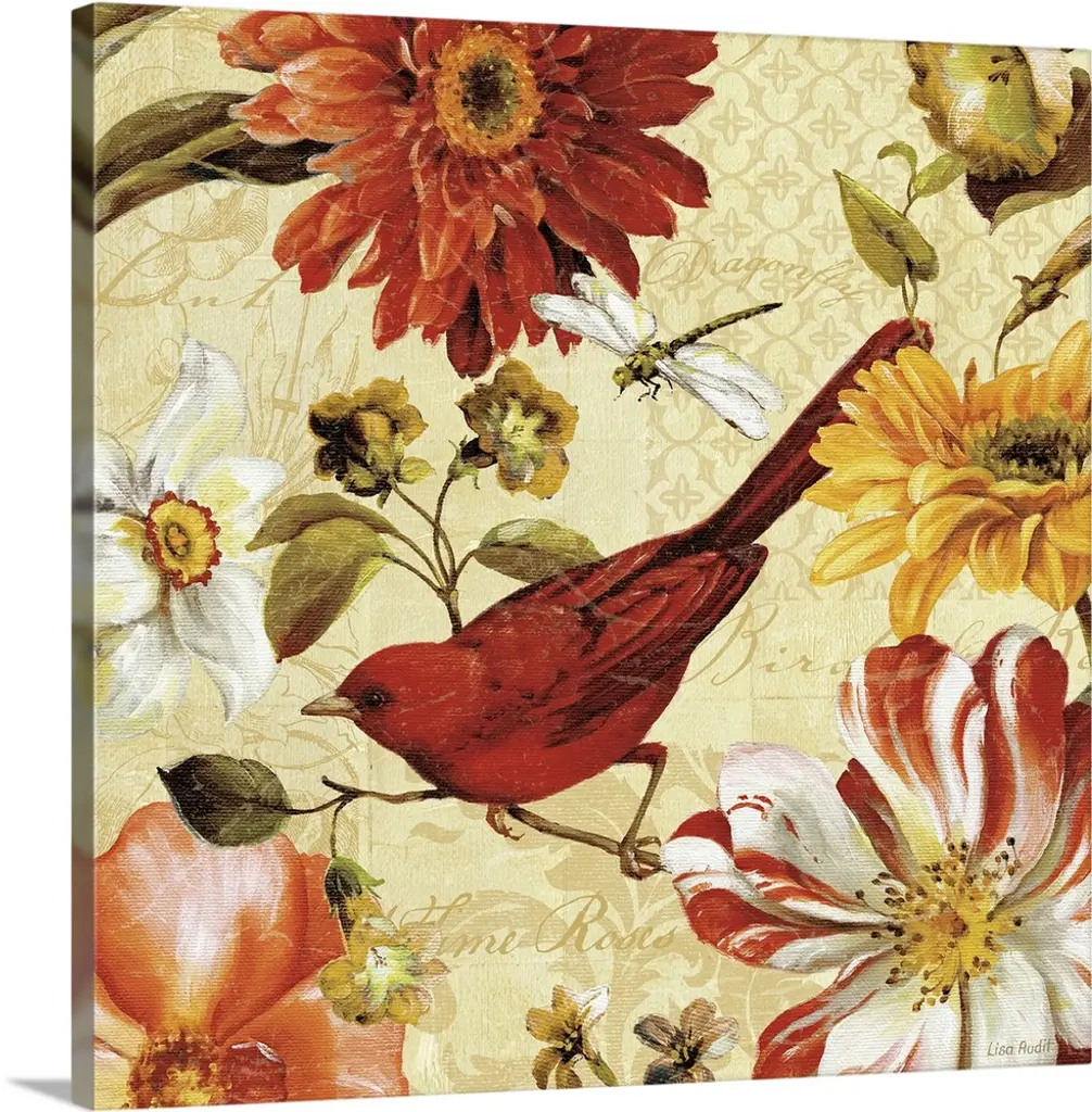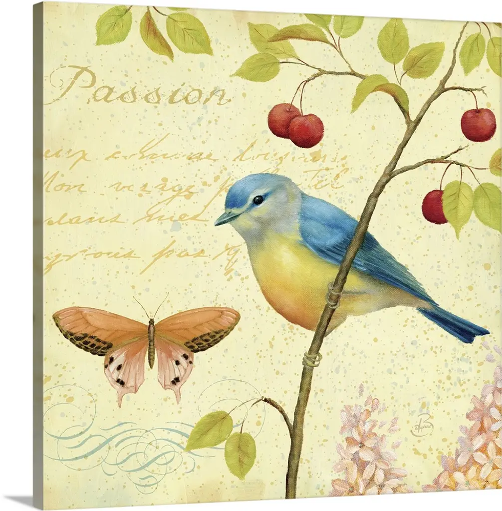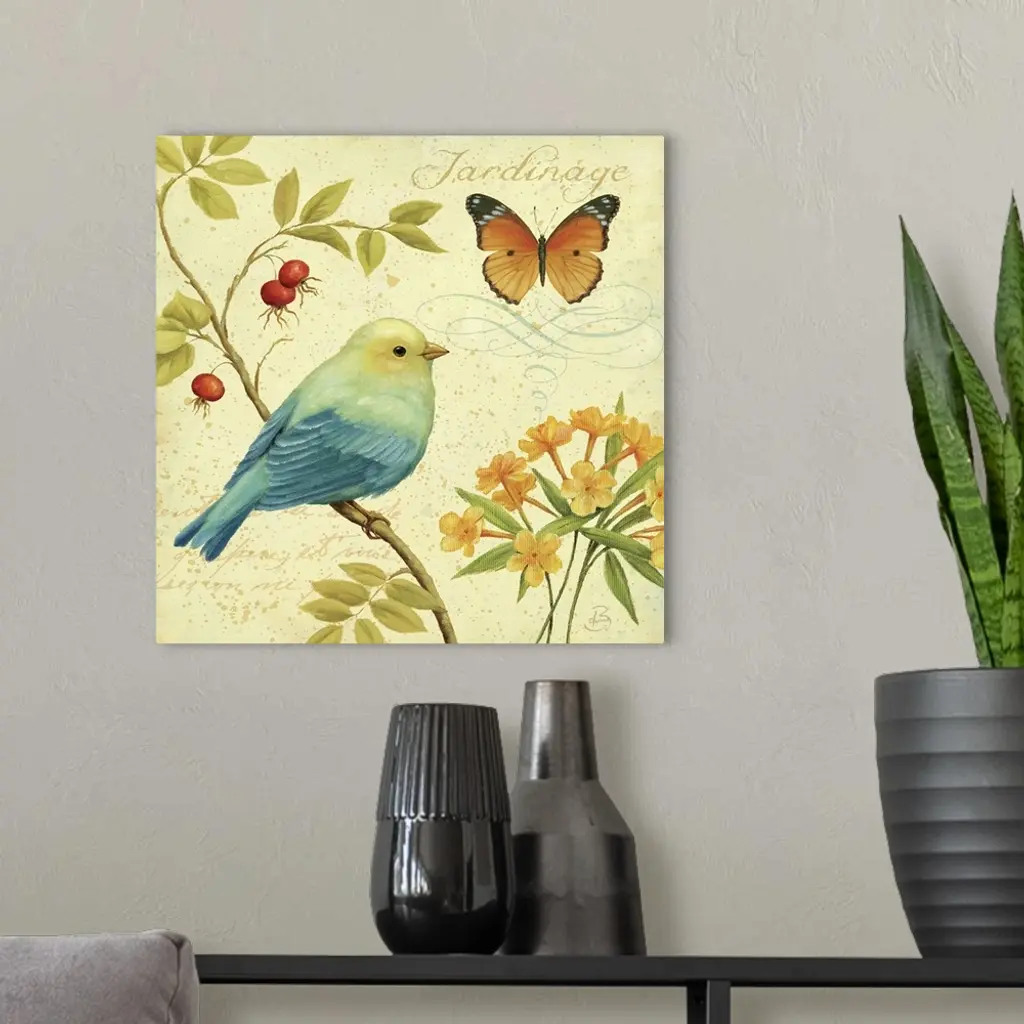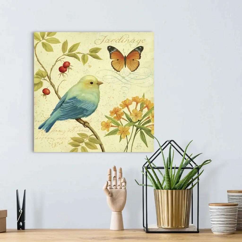 Square painting on canvas of a bird sitting on a limb with a butterfly fluttering above.
