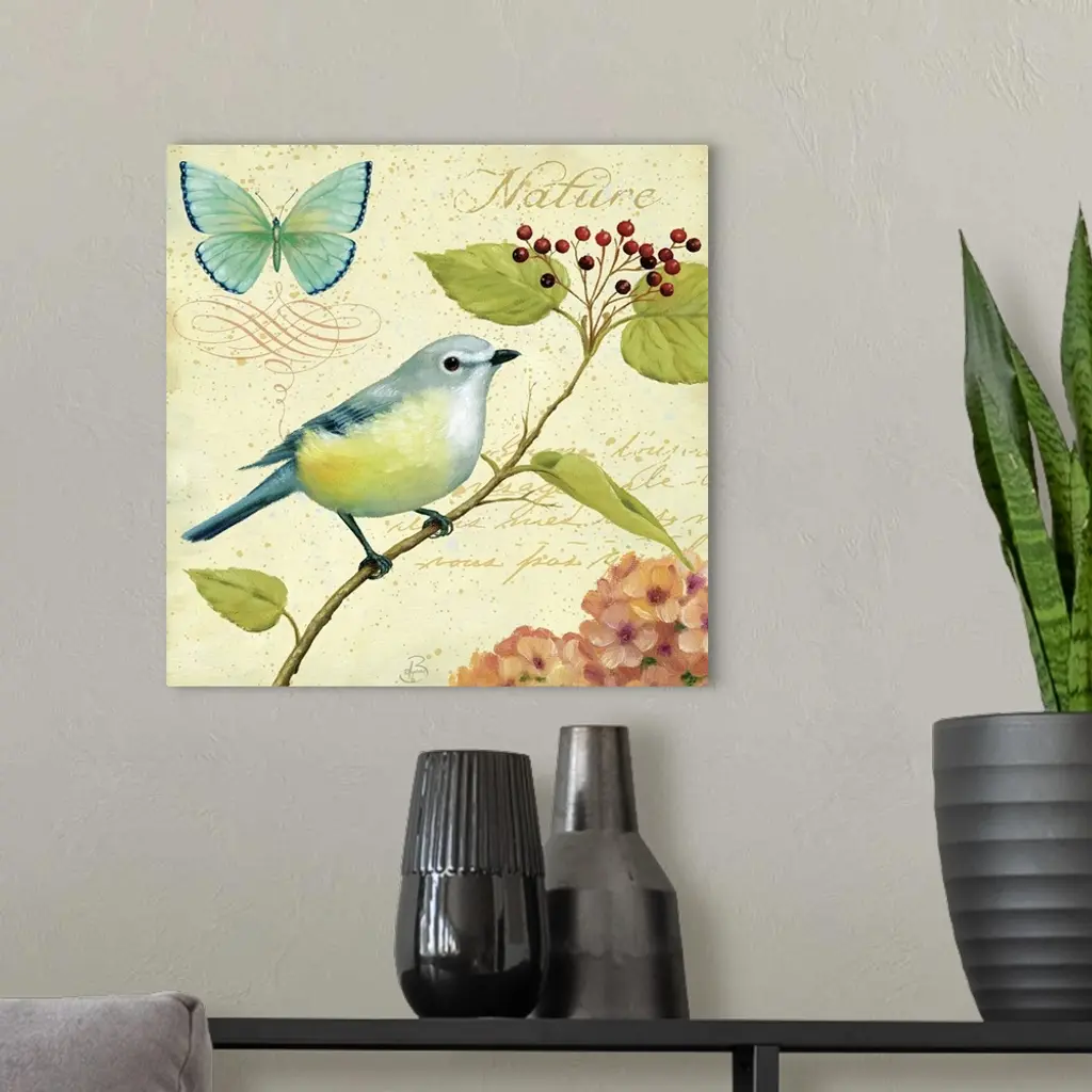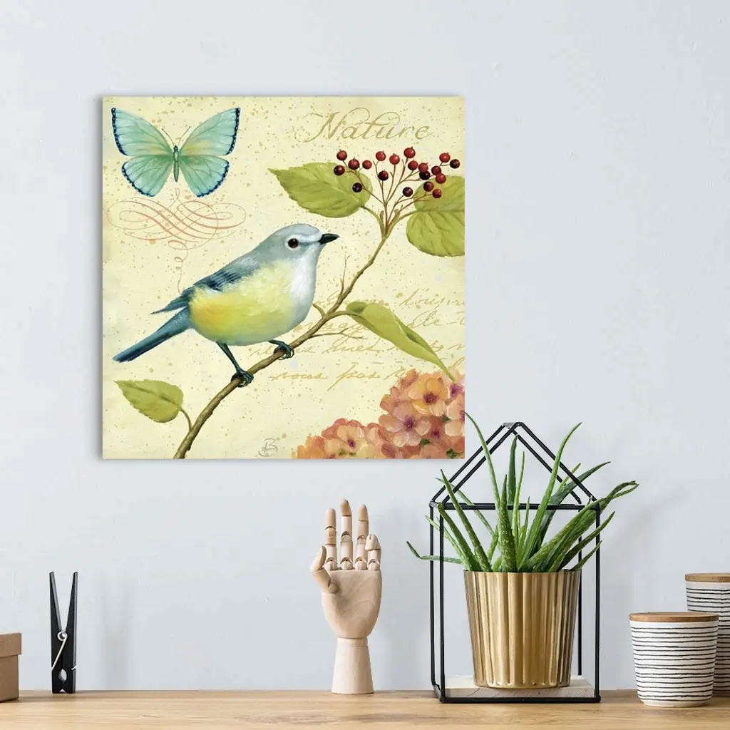 Home docor art piece of a bird sitting on a single berry branch with a butterfly and hydrangea plant surrounding the sides.