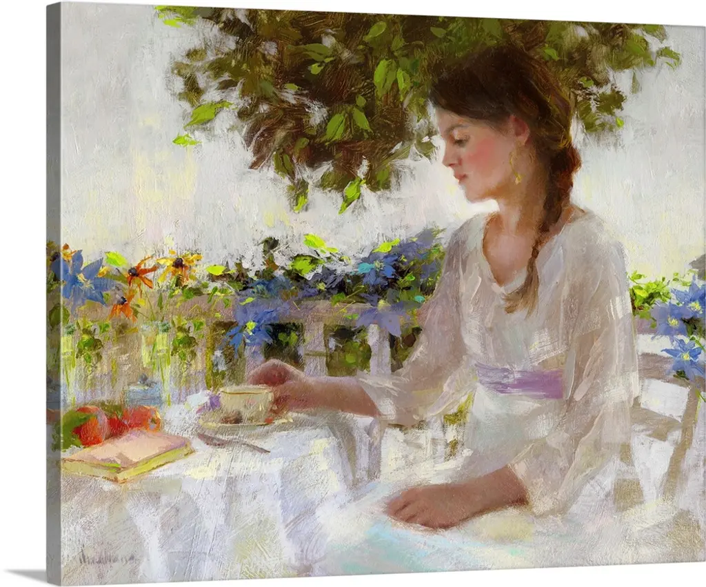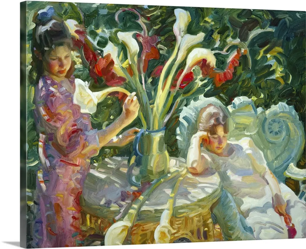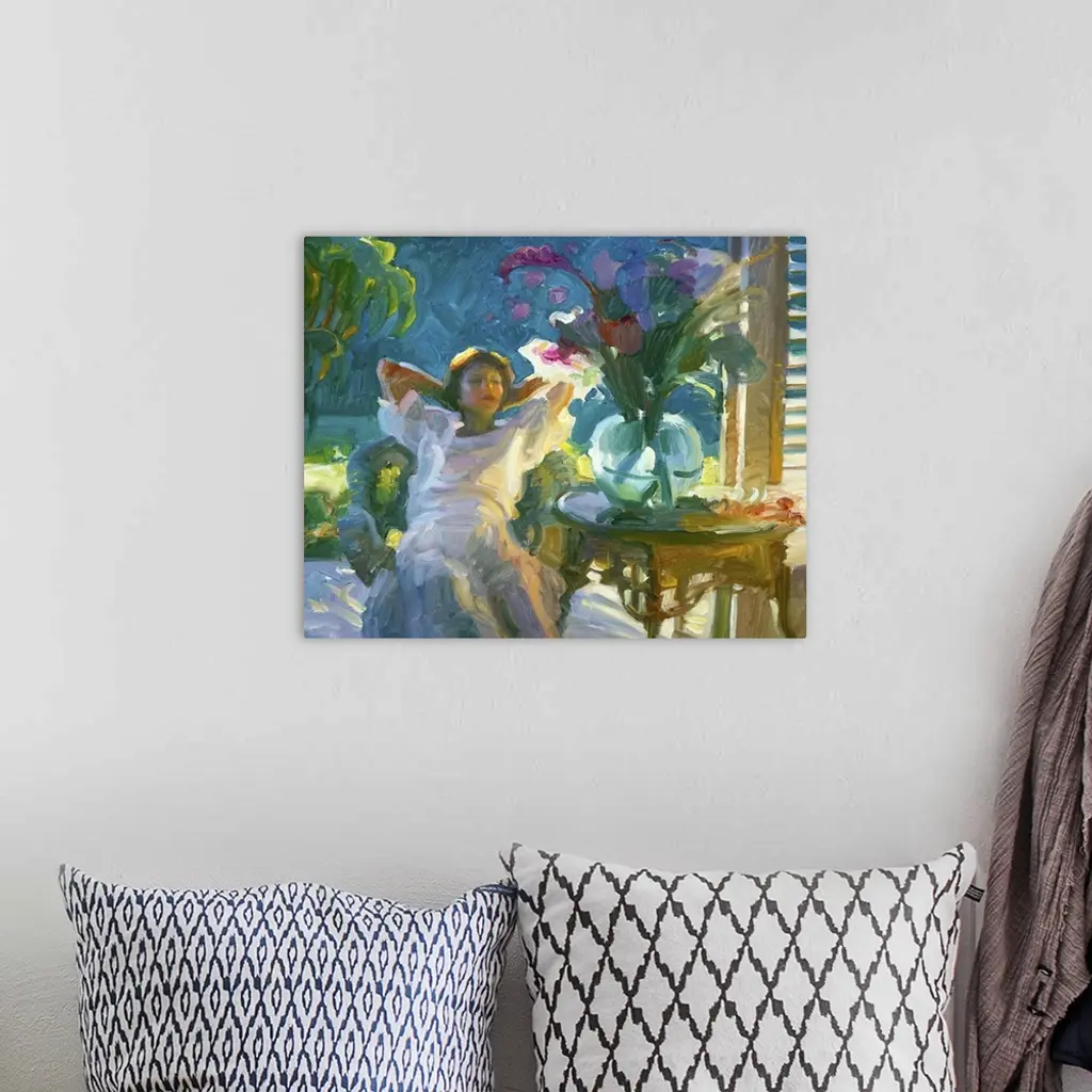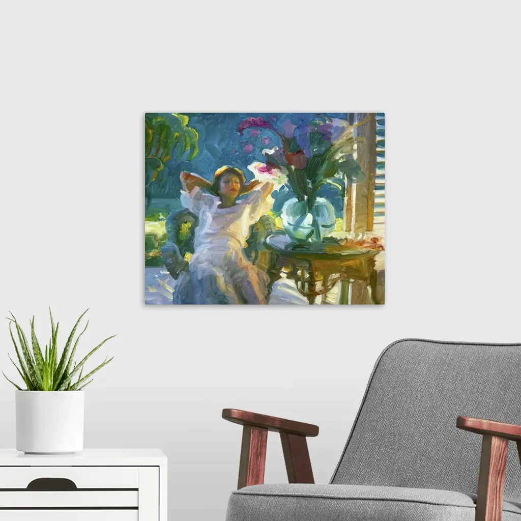 A contemporary painting of a woman sitting in a chair and admiring a bouquet of flowers in a vase.