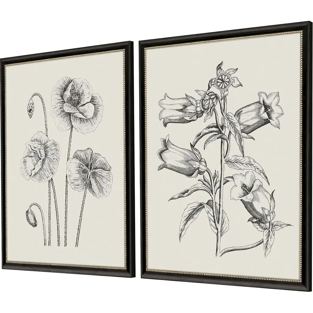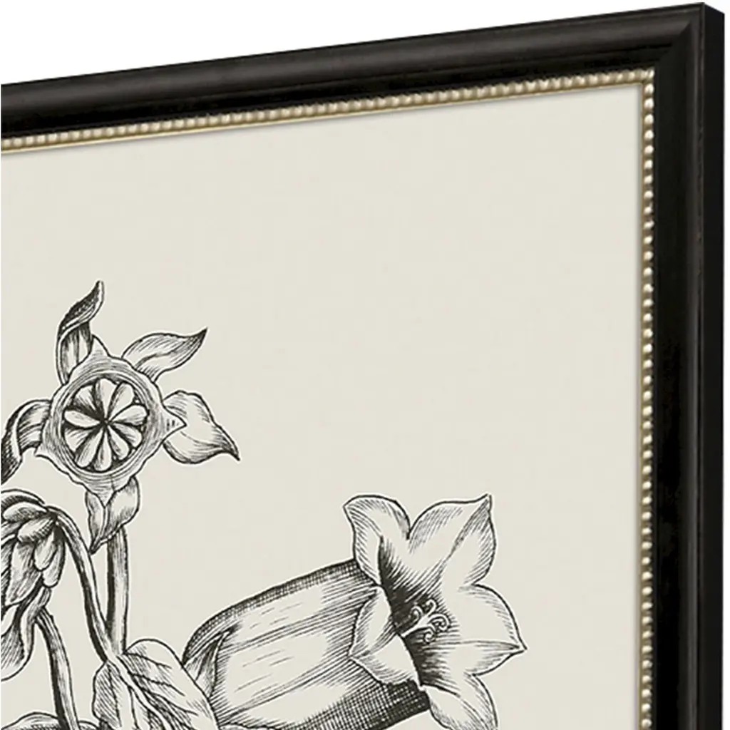 Botanical sketches have vintage feel with understated elegance. Framed in an aged black painted wood with washed antique gold beaded lip.
