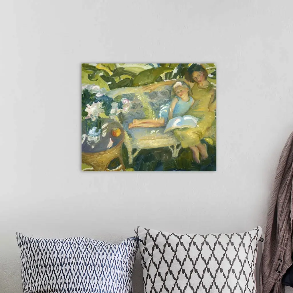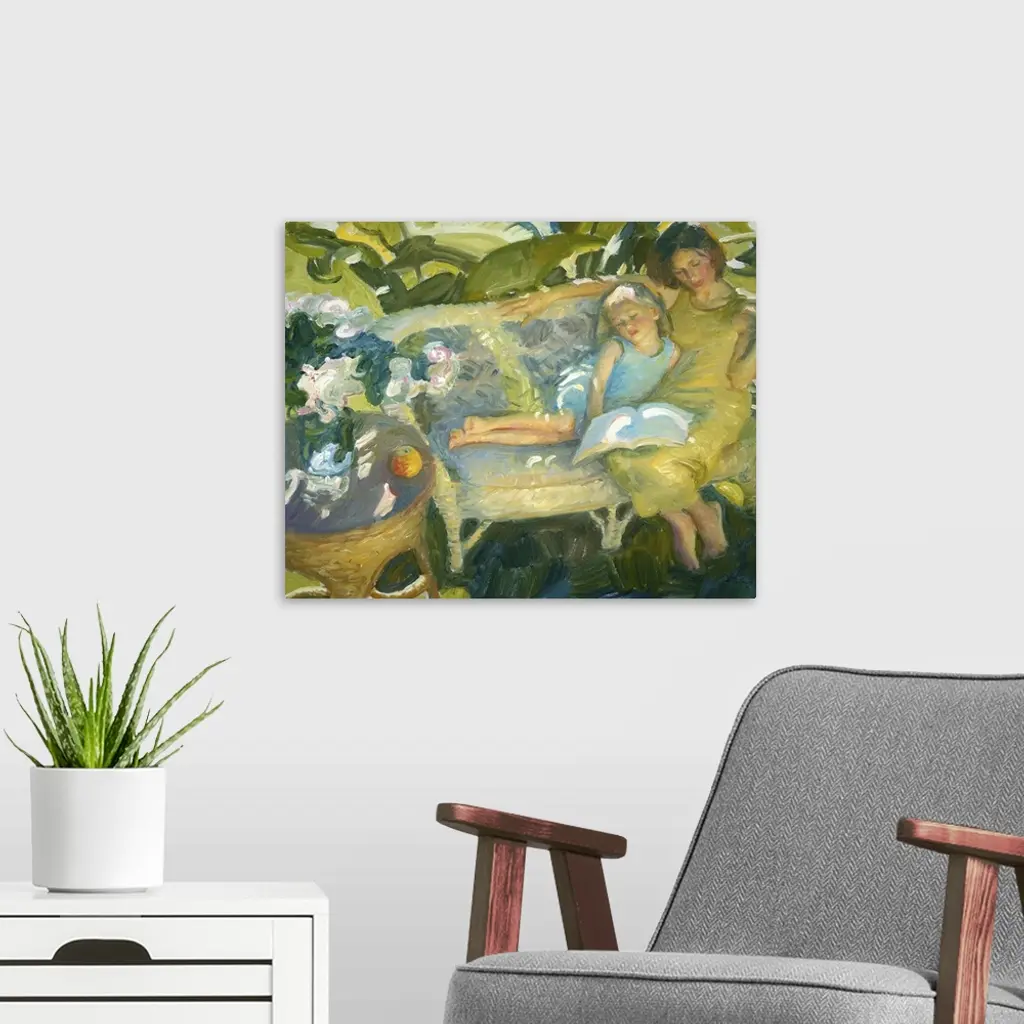 A contemporary painting of a mother and daughter sitting together and reading in a garden.