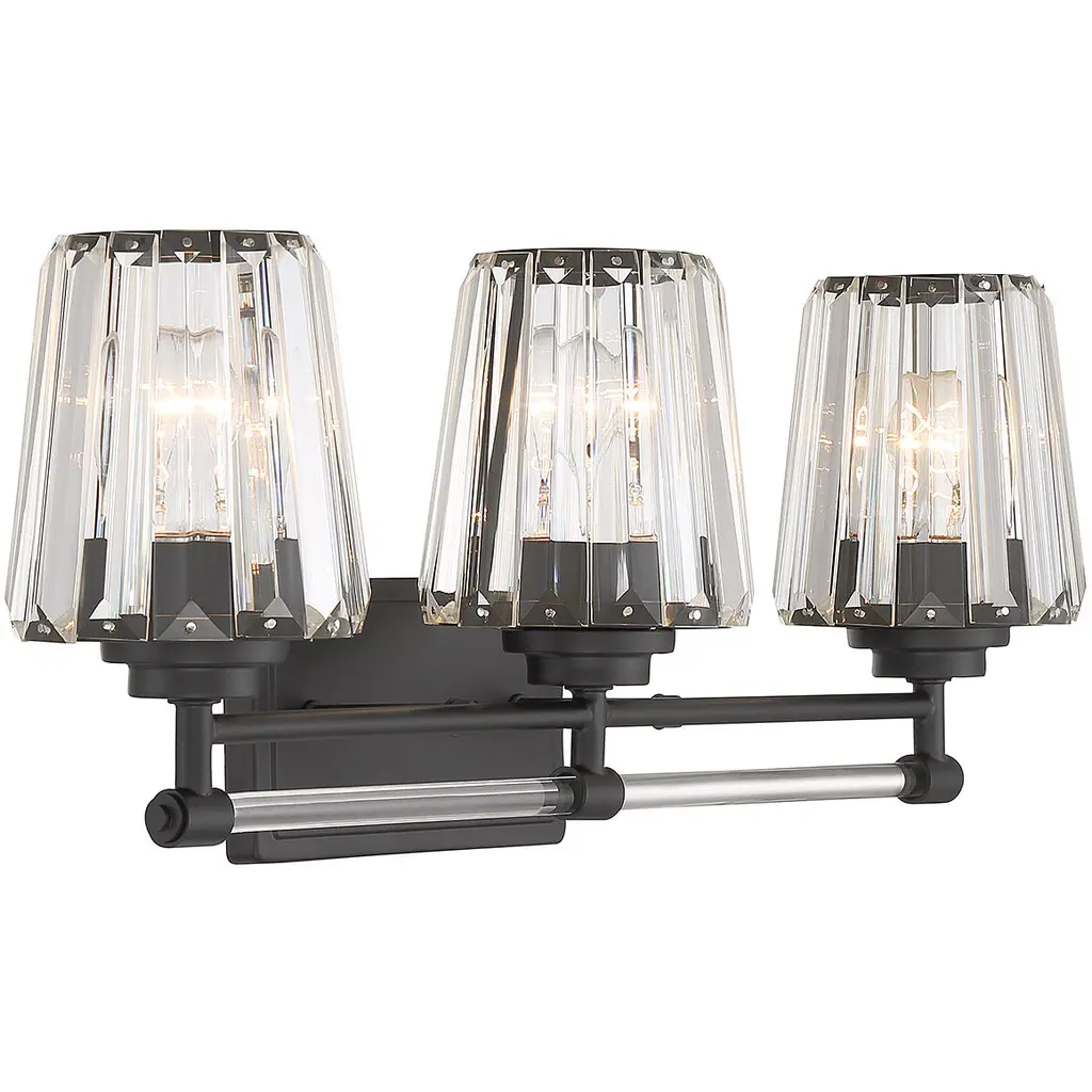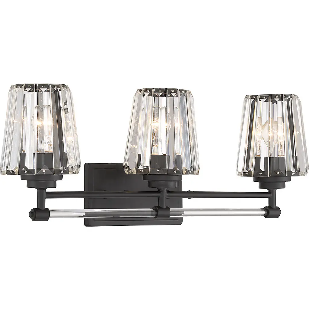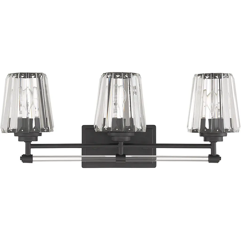 Take the glam factor of your bathroom up a notch with the Savoy House Garnet 3-light bath vanity light Slats of faceted clear crystal add shimmer while the crystal tube detailing on the arms brings even more shine. Finished in matte black. Garnet is 9.5" in height, 24" in width and extends 7" from the wall. Uses 3 standard size bulbs of up to 60 watts per bulb (bulbs not included).