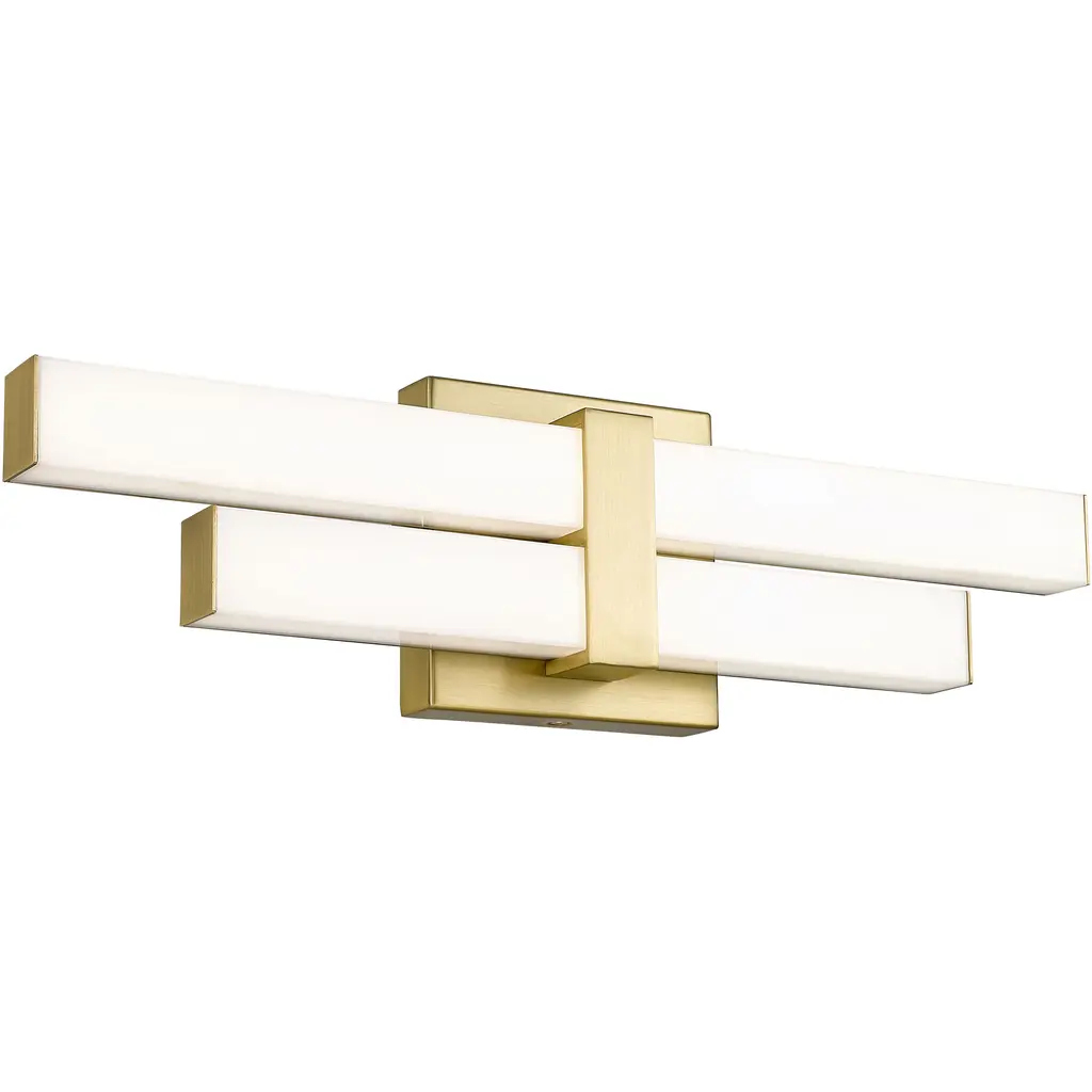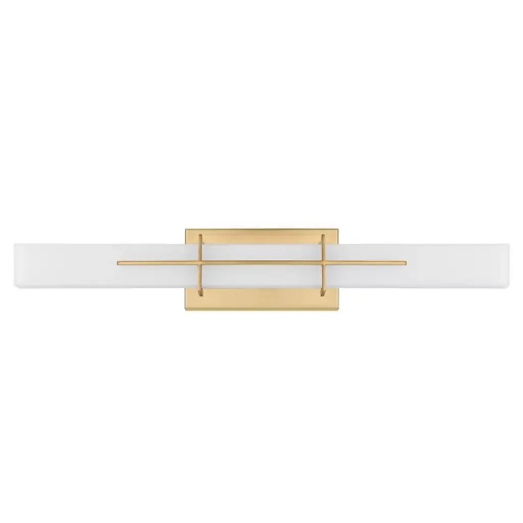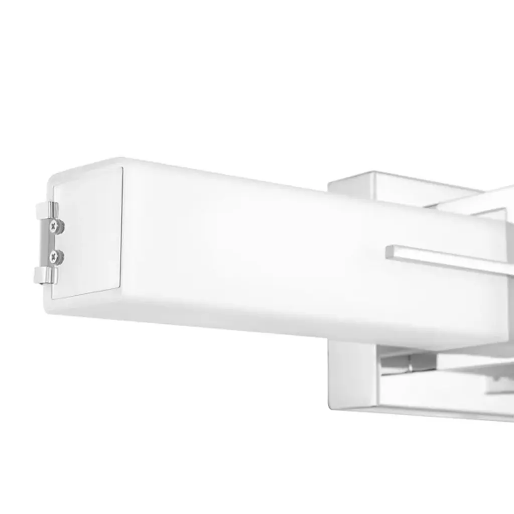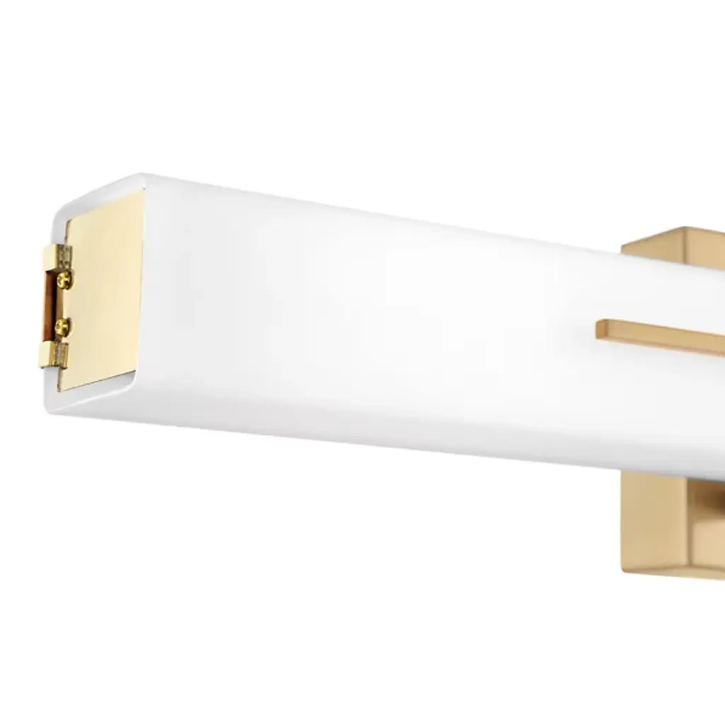 The Gaspare LED Vanity Light by Huxe is a modern and refined piece with a minimalistic sense of style. A wide, smooth, opal etched glass shade is held by thin, angular arms that wrap around its rectangular form. A beautifully finished backplate and simple, minimal endcaps keep this design cohesive as a slender crossbar dresses up the front of this vanity light, filtering a lovely, even, and welcoming layer of light to brighten master and guest bathrooms.