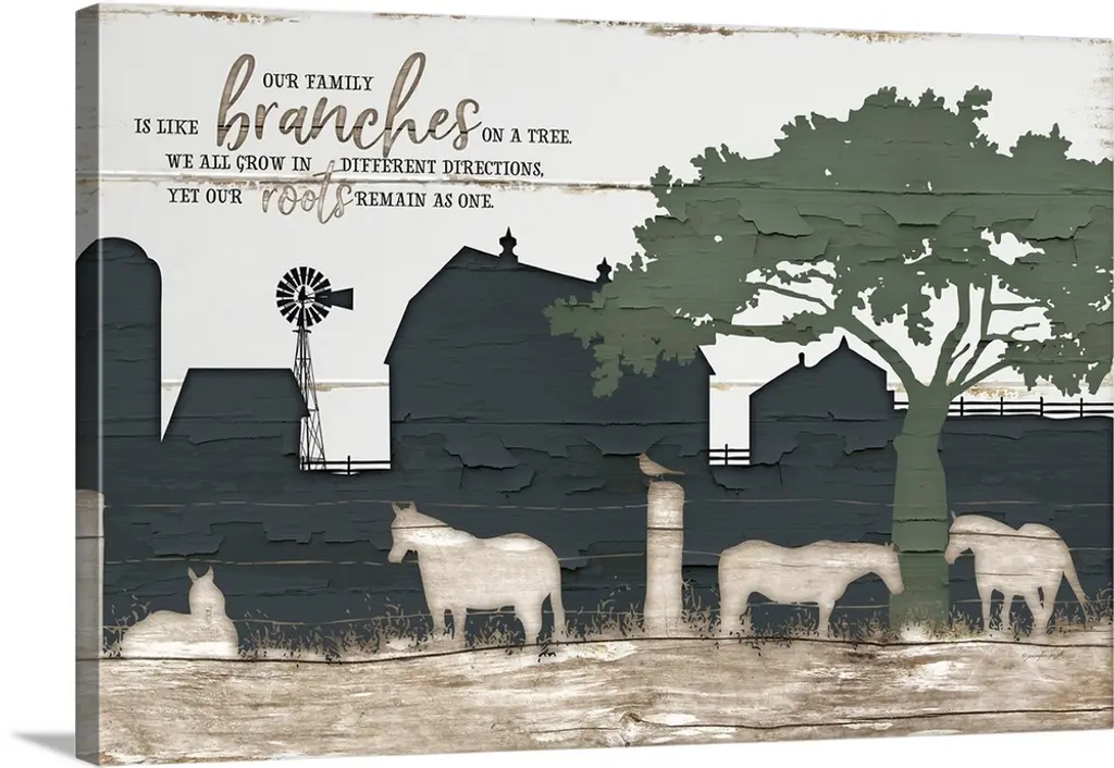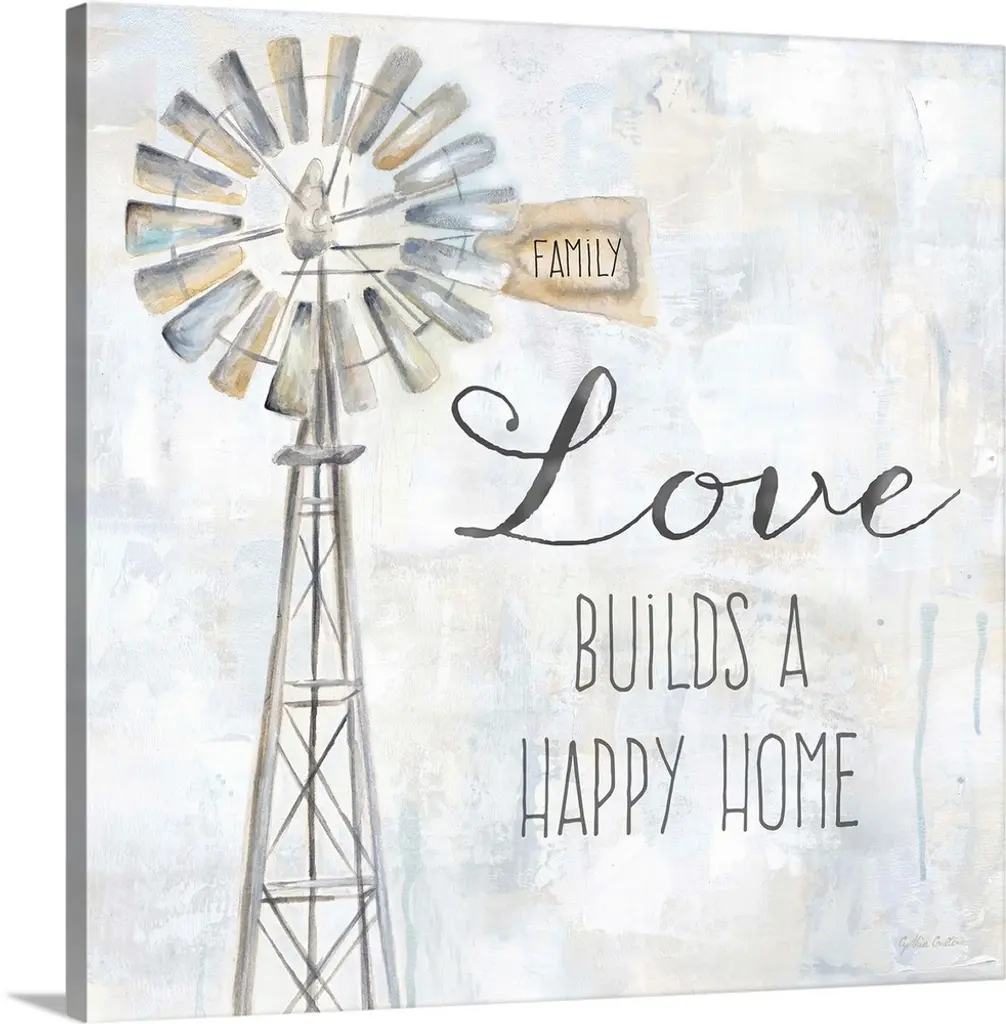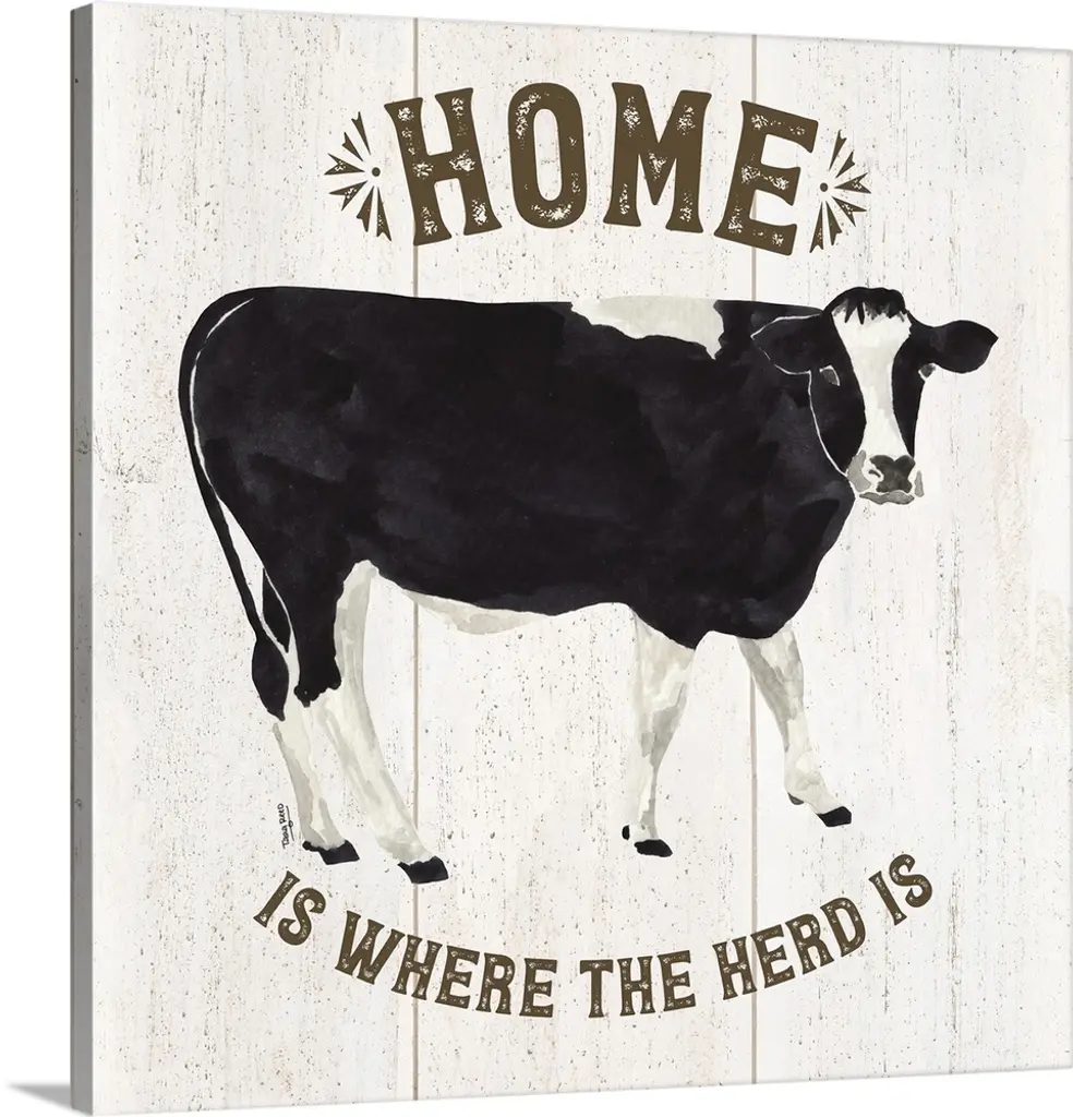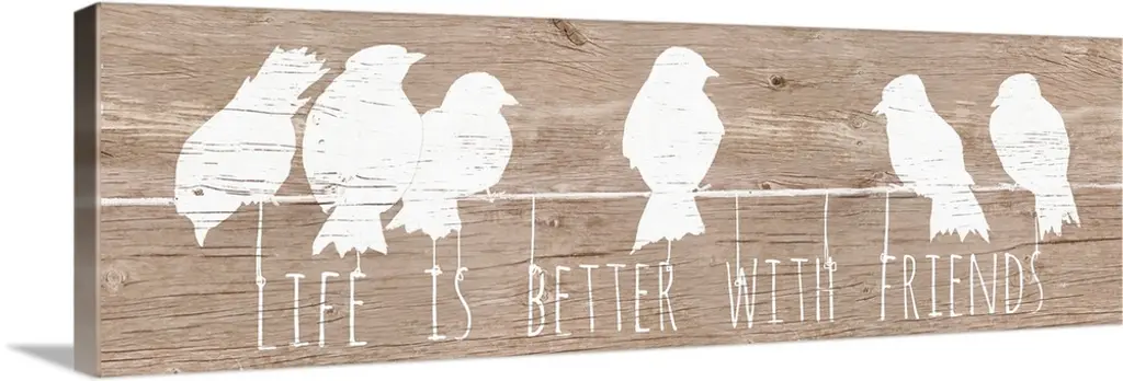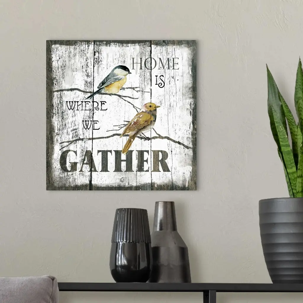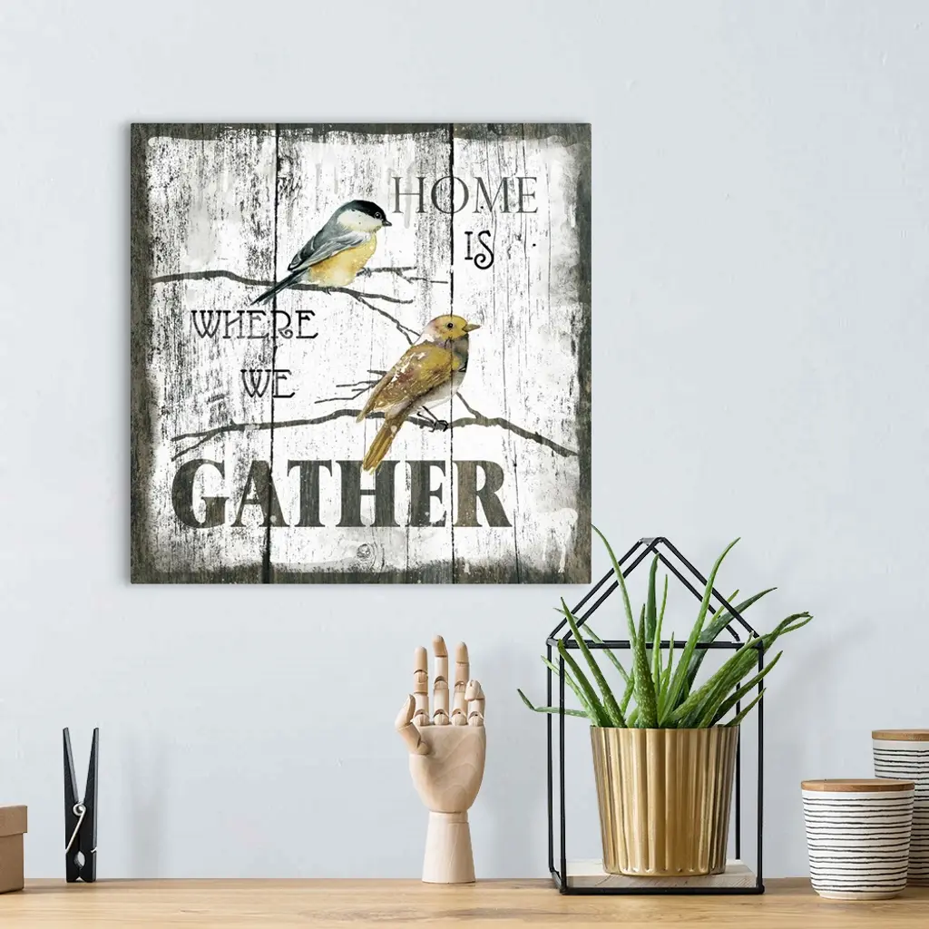 A decorative painting of two birds sitting on branches and the text ?Home is Where We Gather? painted on a wood background.�